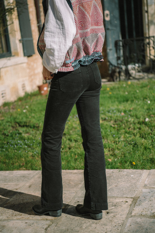 Légèrement évasé en bas de jambe, le Carlota est la coupe flare emblématique d’Acquaverde, inspirée des seventies. Il apporte une touche vintage et féminine à toutes vos tenues.