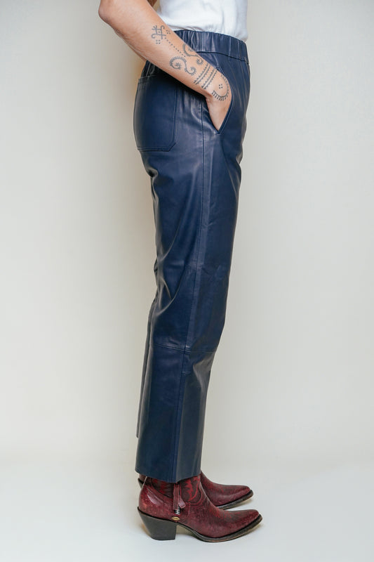 Le pantalon Sarah et ses déclinaisons subliment la silhouette avec un cuir souple et un tombé net. Facile à associer avec une maille ou une chemise. Voir les pantalons en cuir.