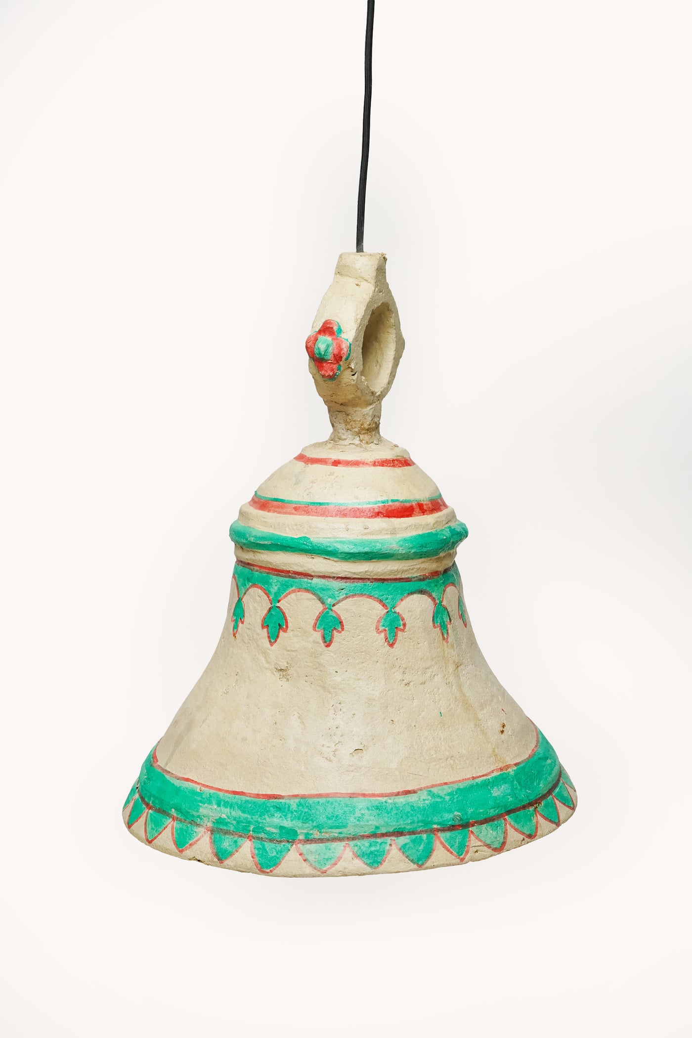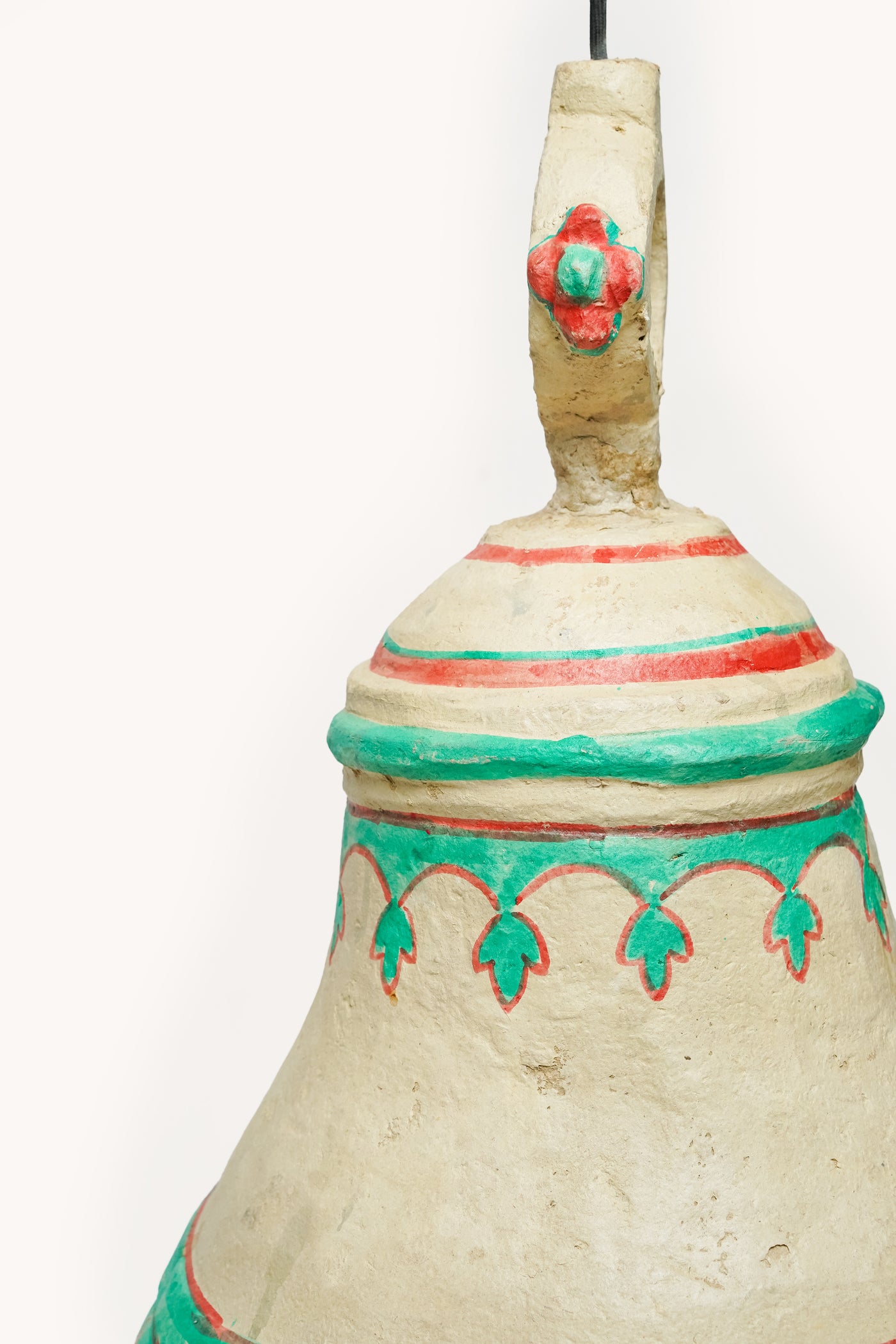 Sa forme de cloche évasée est modelée en papier mâché, une matière à la fois légère et dense. La surface n'est pas lisse : elle laisse apparaître le grain de la pâte et les traces du façonnage manuel.