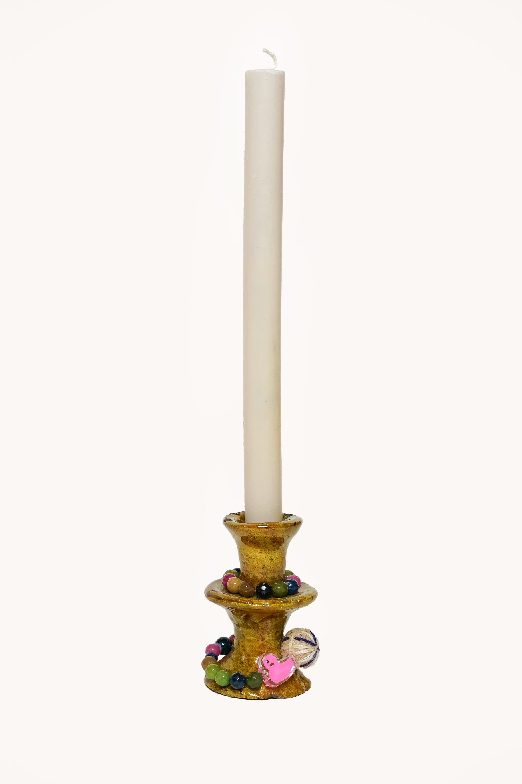 À cette base brute et authentique, Manon vient apporter sa touche personnelle : de délicats bijoux de perles faits main, qu’elle compose avec amour dans son atelier. Ces ornements viennent enlacer le bougeoir, créant une pièce poétique, mêlant terre et lumière, tradition et création.