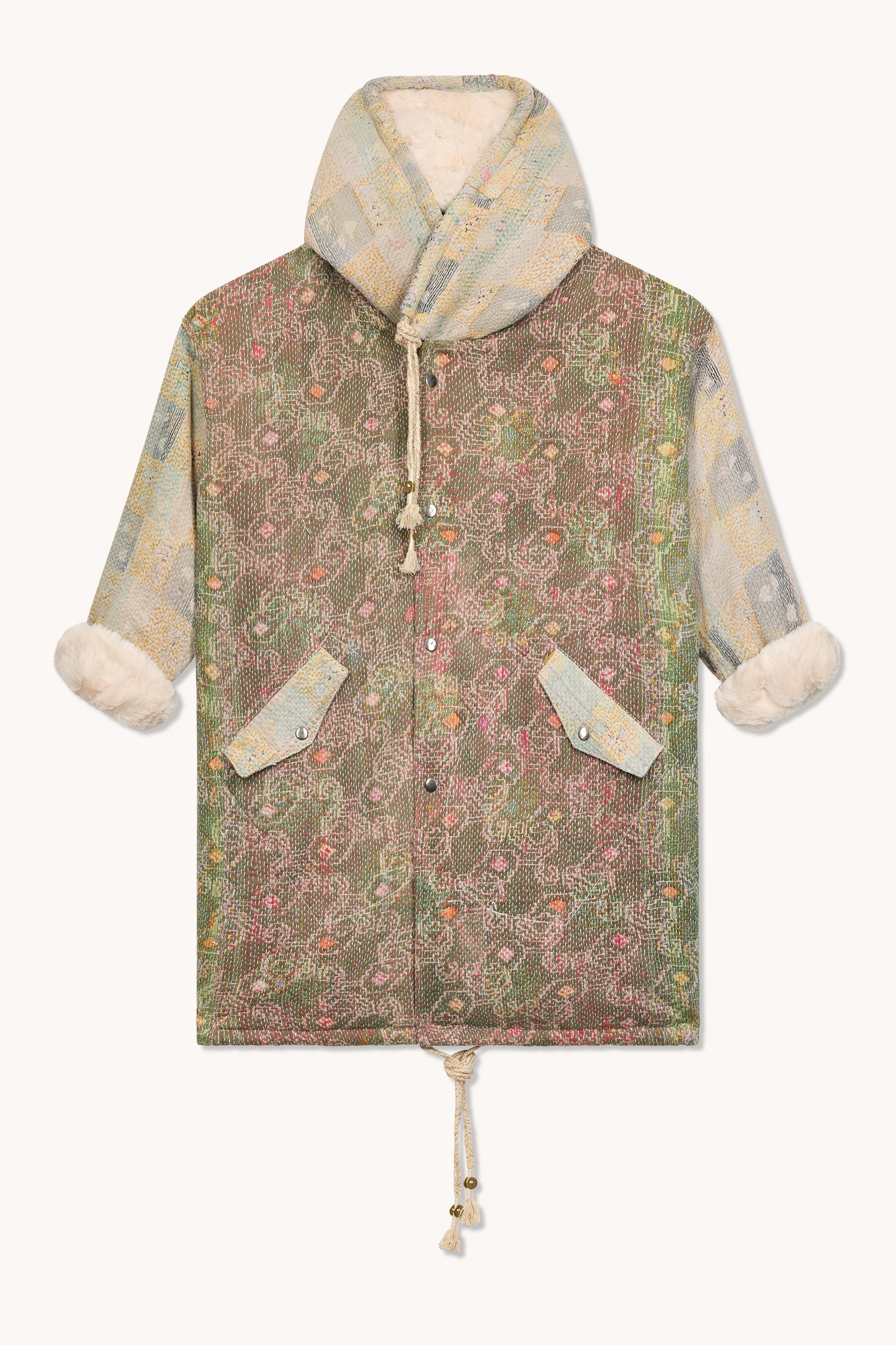 Le manteau Meenu fourré en kantha de L’Île Bleue est une pièce unique. Doublé pour apporter chaleur et confort, il se porte facilement au quotidien tout en protégeant efficacement du froid. La coupe douce et enveloppante offre une silhouette agréable, et chaque détail est travaillé avec soin pour préserver le caractère authentique de la pièce. Un manteau chaleureux, pratique et plein de personnalité.
