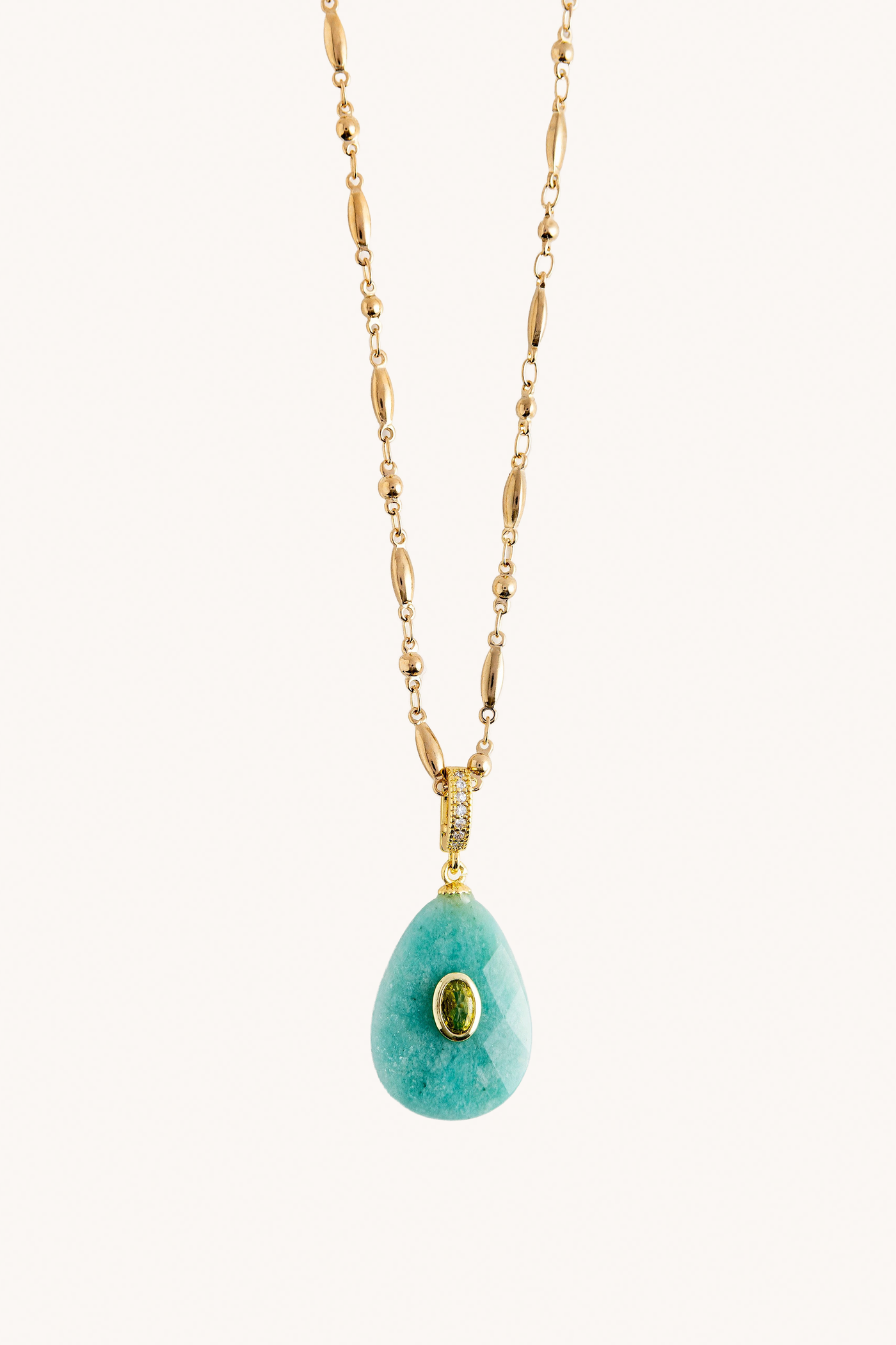 Ce collier élégant se compose d'une chaîne en laiton doré à l'or fin 18 k arborant un pendentif en amazonite taillé en goutte (3 x 2 cm). Le pendentif est délicatement serti d'un zircon ovale étincelant.