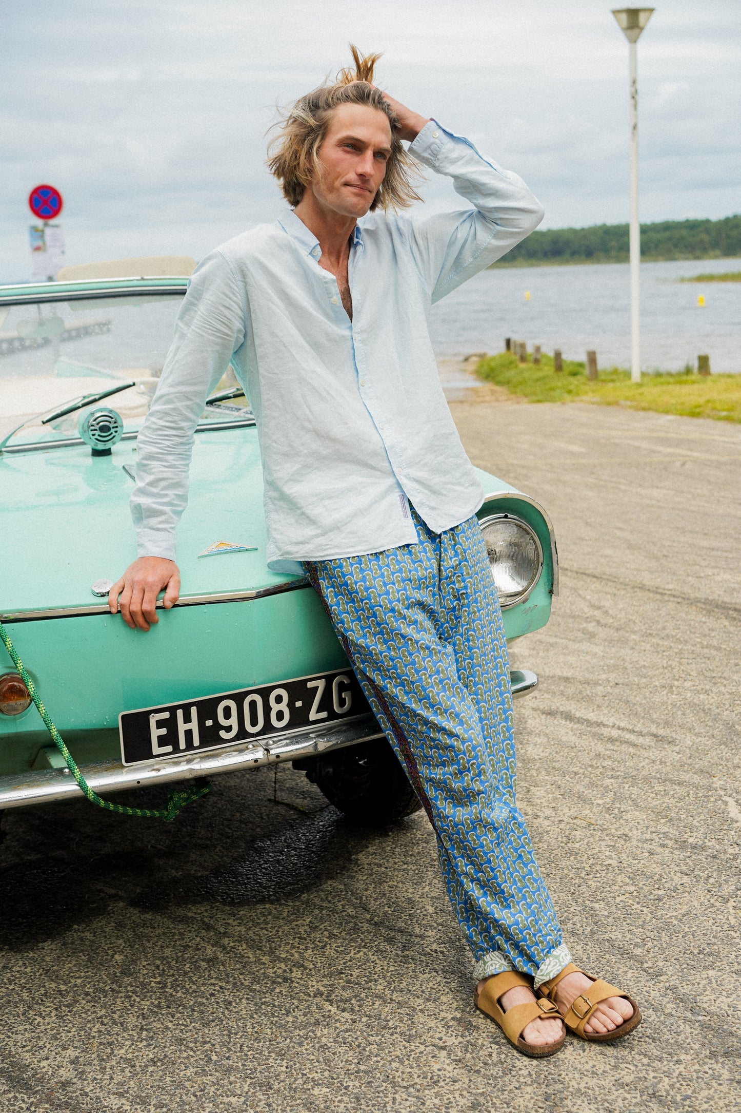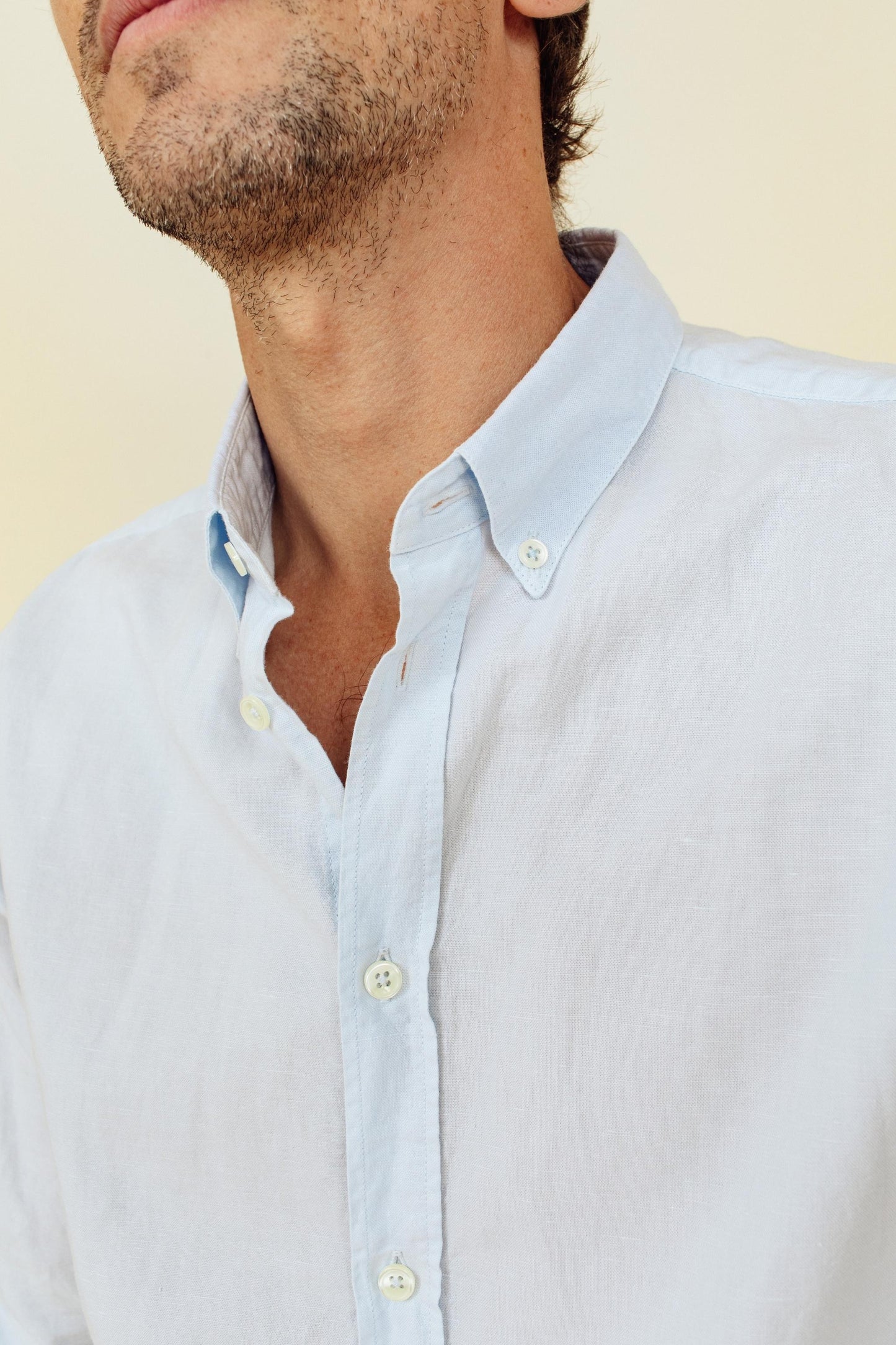 Chemise bleue ciel en coton et lin avec col button down.