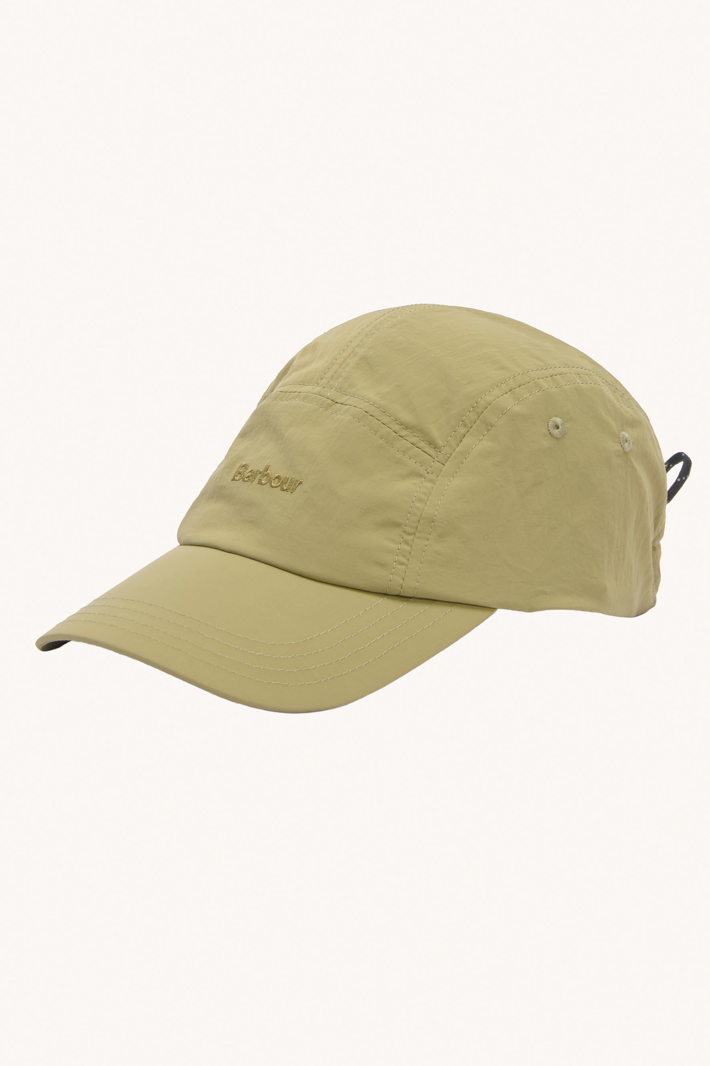 Ce modèle privilégie la fonctionnalité avec des détails utilitaires précis. Elle dispose d'une visière pour une protection solaire optimale et d'une poche extérieure latérale ornée d'un bouton pression griffé Barbour. Le réglage s'effectue à l'arrière via un cordon élastique moucheté ajustable, permettant un maintien personnalisé et sécurisé, même en mouvement. Des œillets brodés sur les panneaux latéraux assurent une ventilation constante.