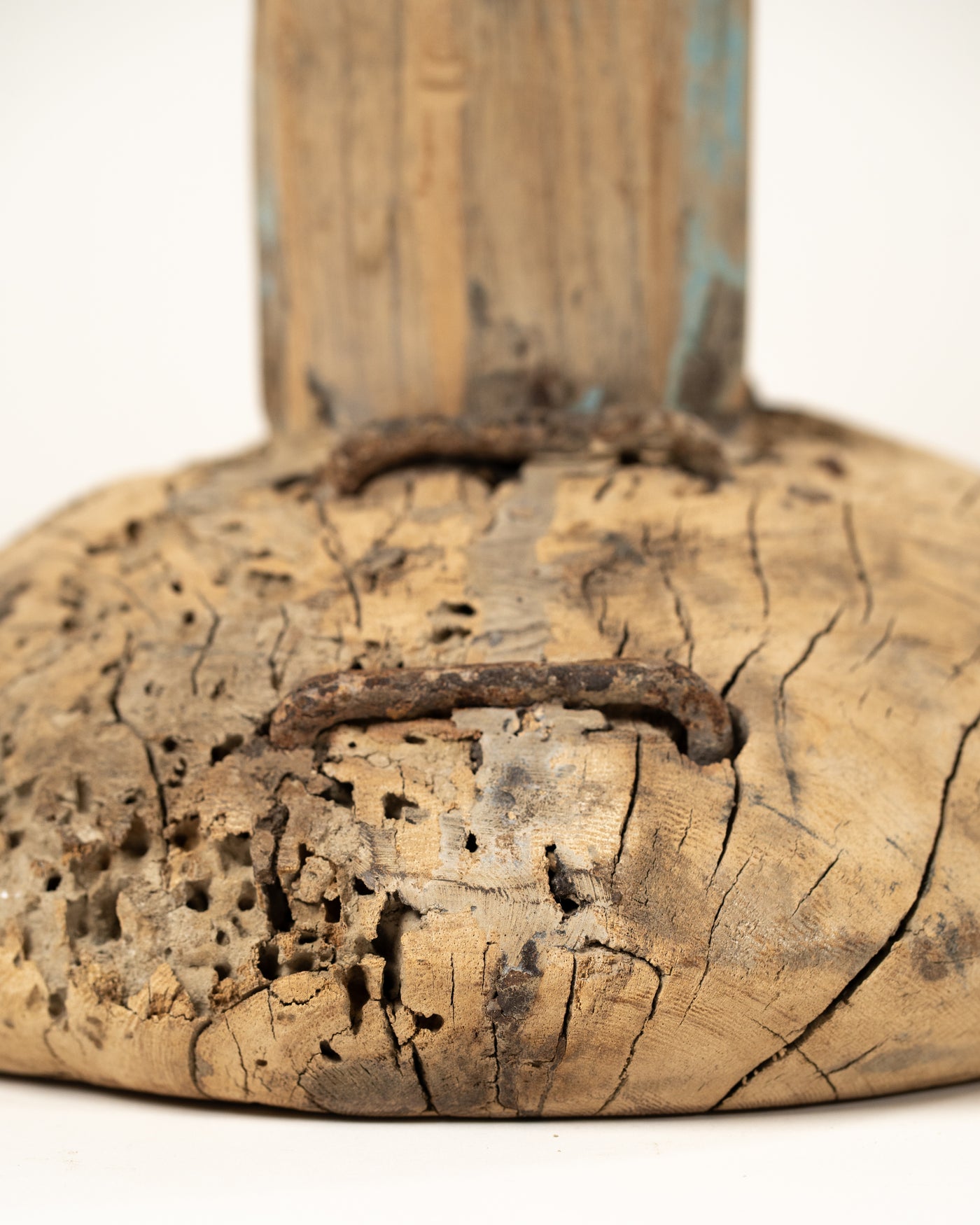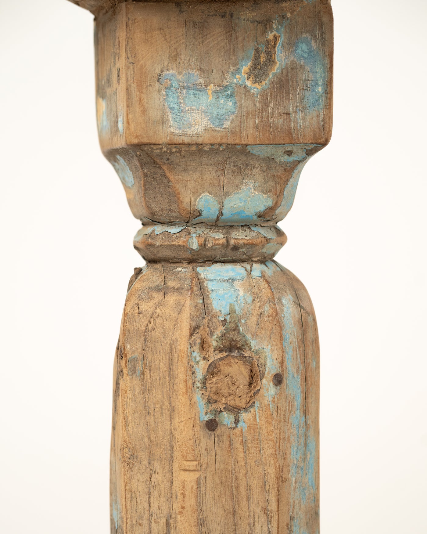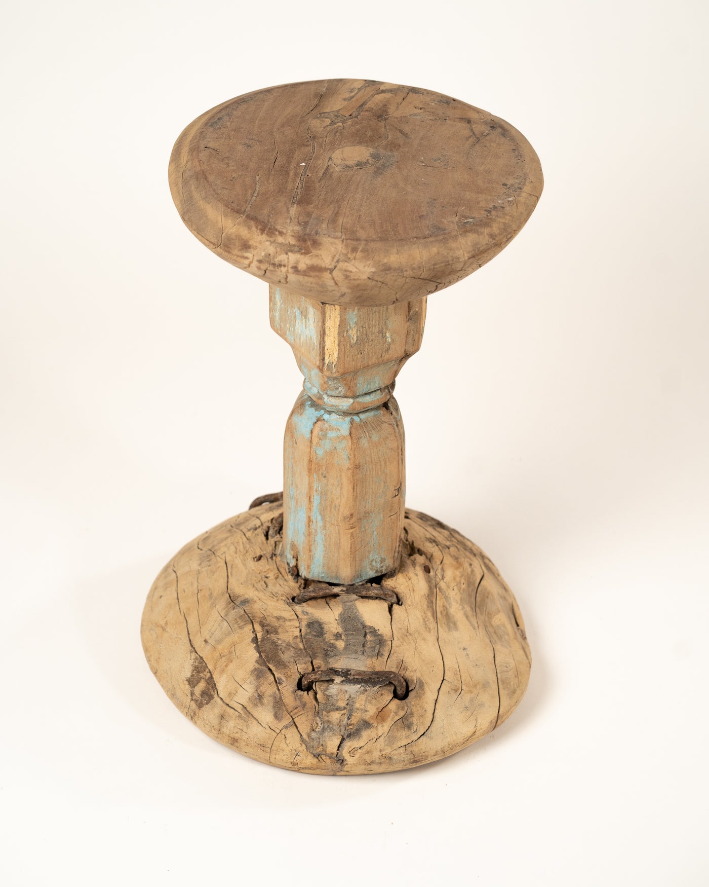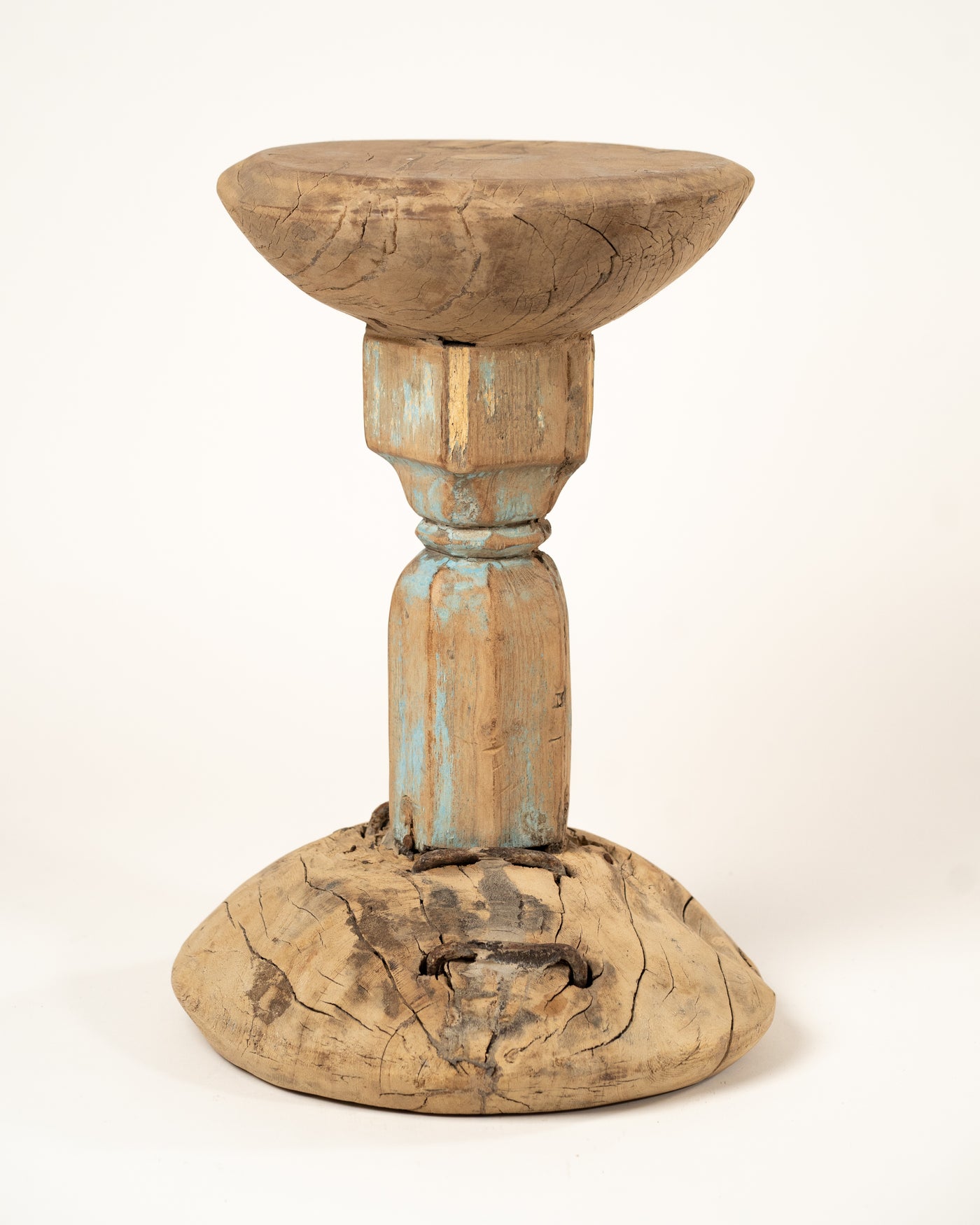 Sa structure se compose de trois éléments empilés distincts. Le plateau est un disque de bois arrondi et lisse, dont la surface est marquée par les veinures et les fissures naturelles de la matière. Il repose sur un pied central hexagonal, qui conserve des traces subtiles de patine de peinture bleu clair.