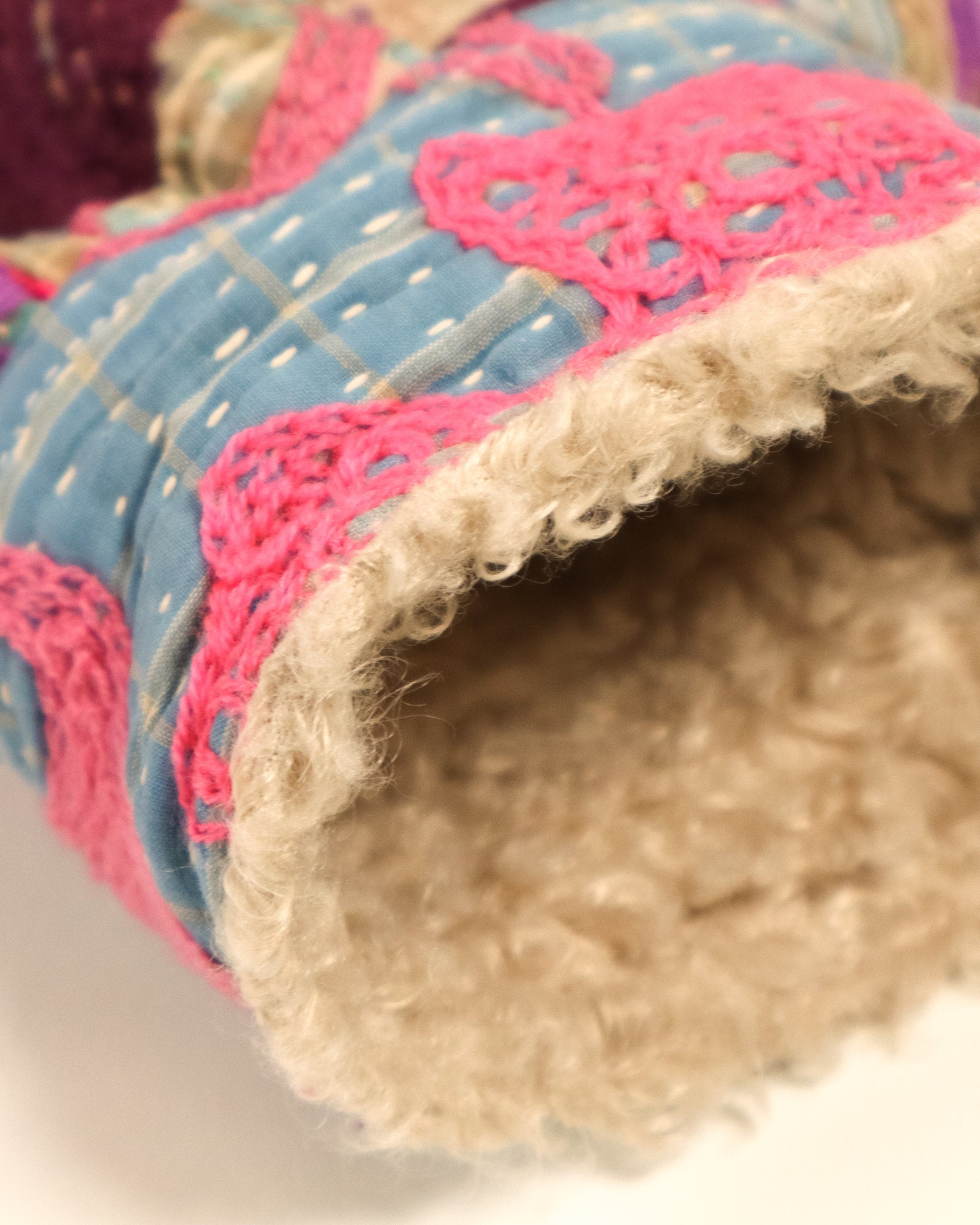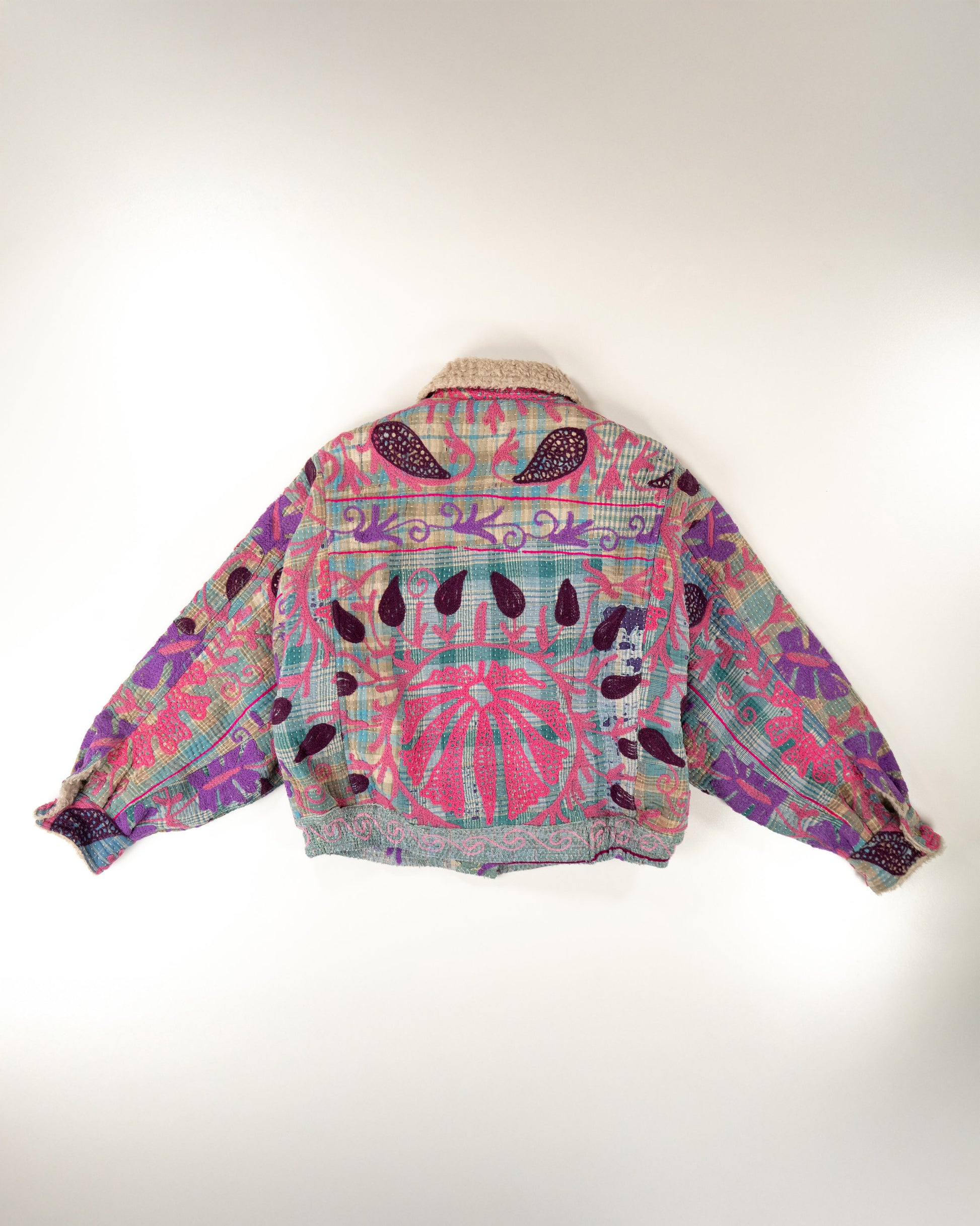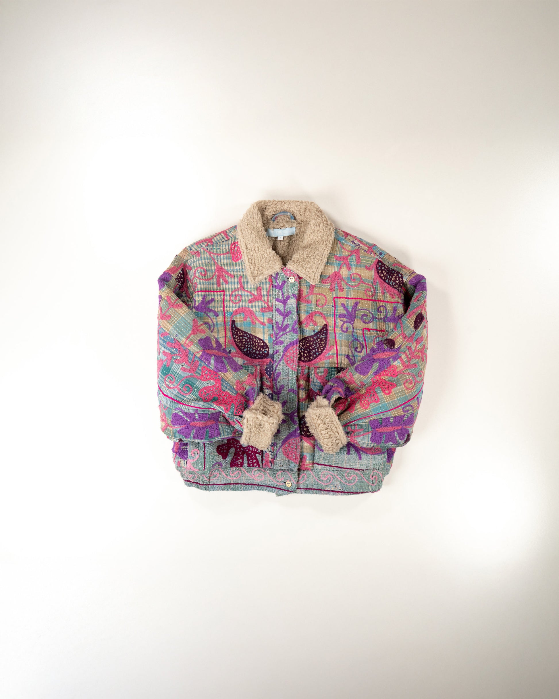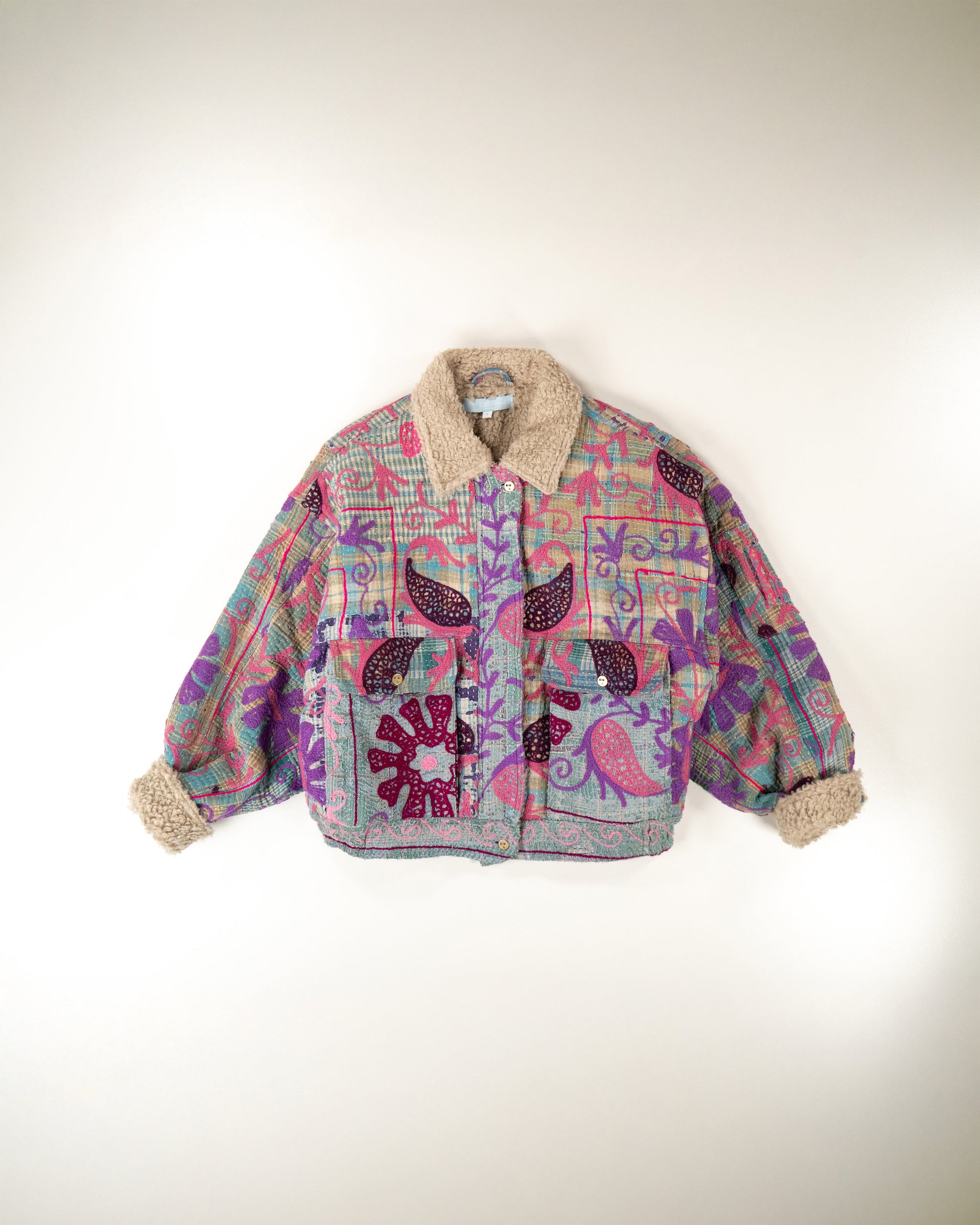 La veste est en 100% coton Kantha avec deux poches latérales, une poche cachée sur la manche gauche, une fermeture à zip et une languette avec bouton pour fermer le bas de la veste.
