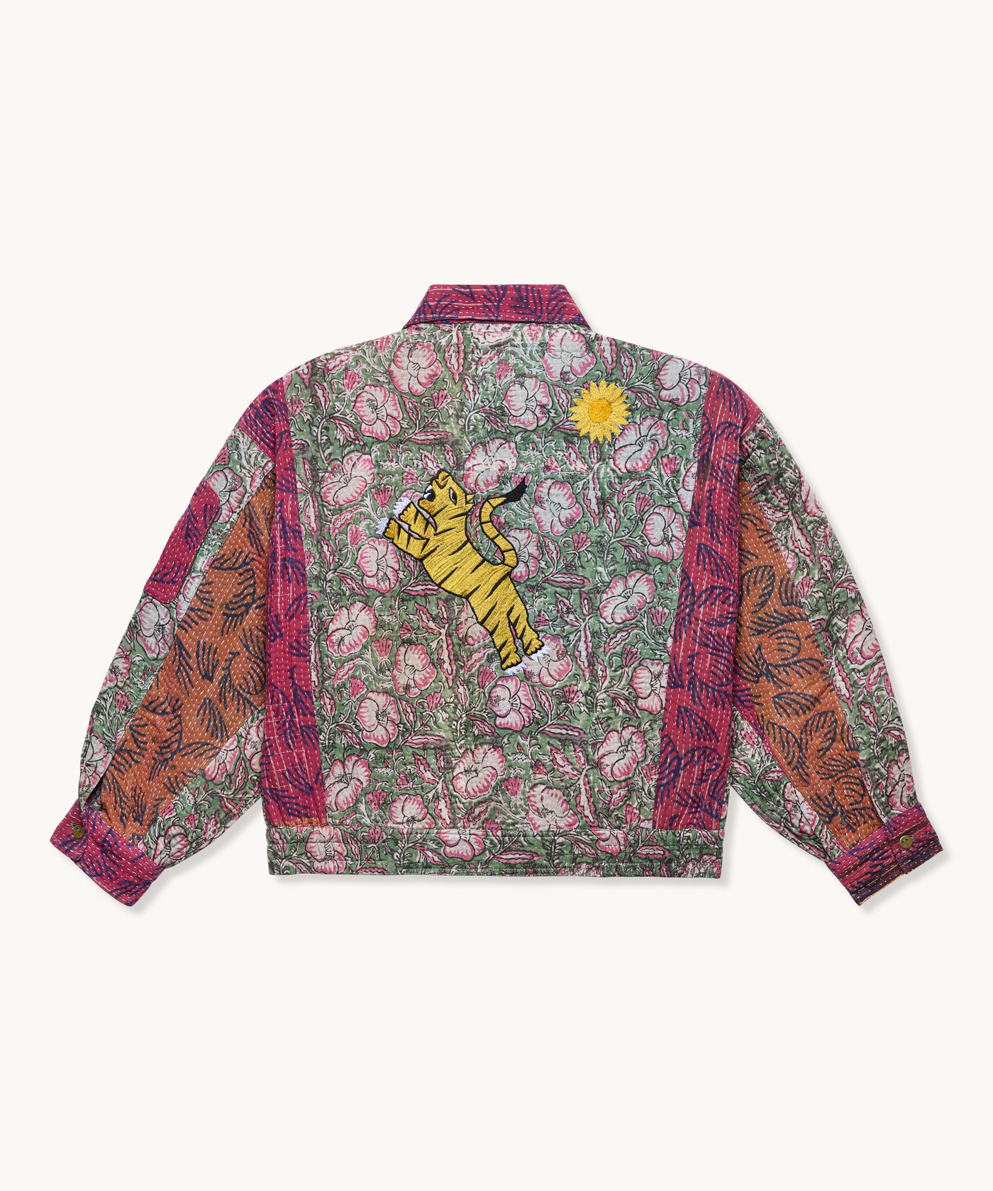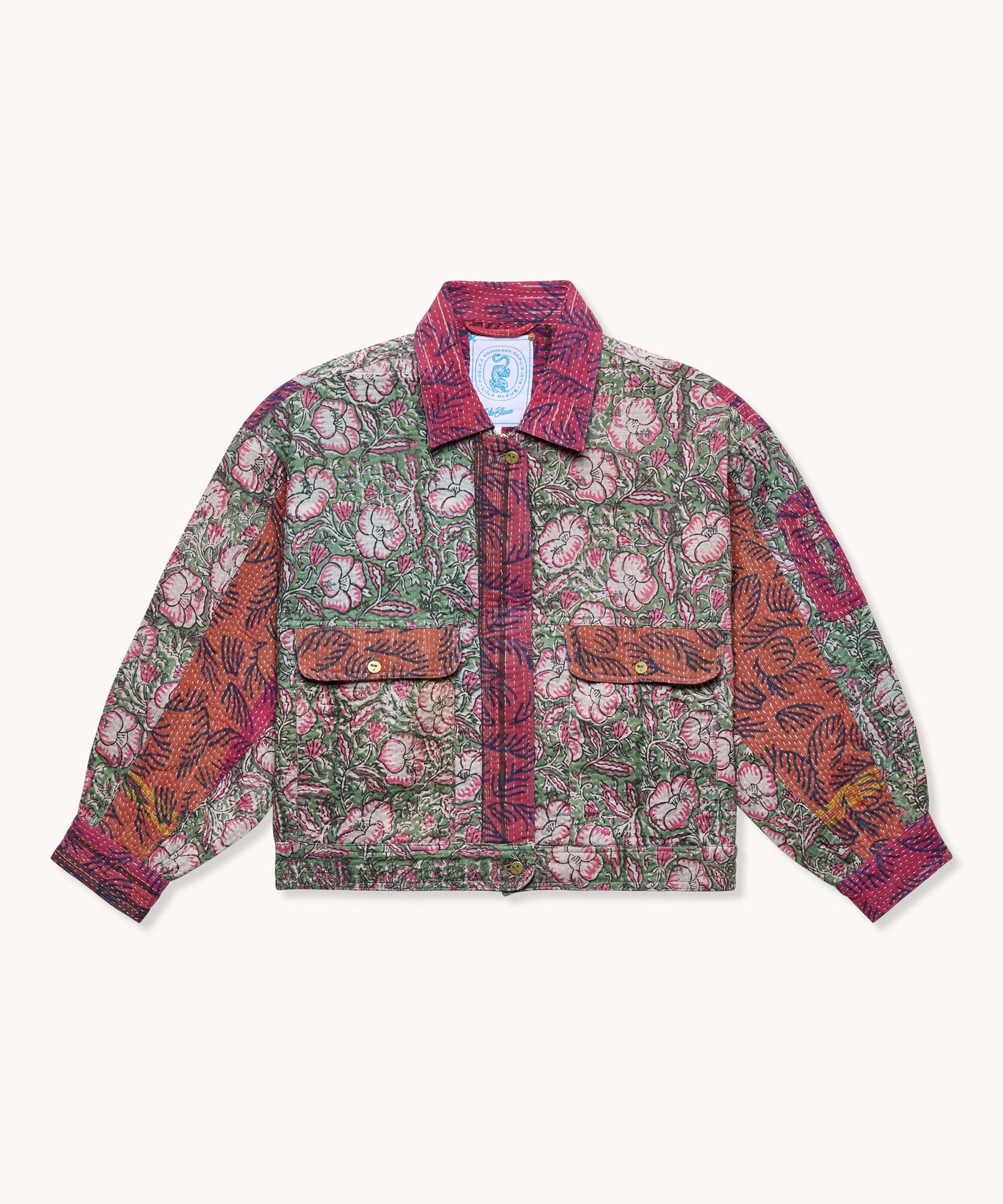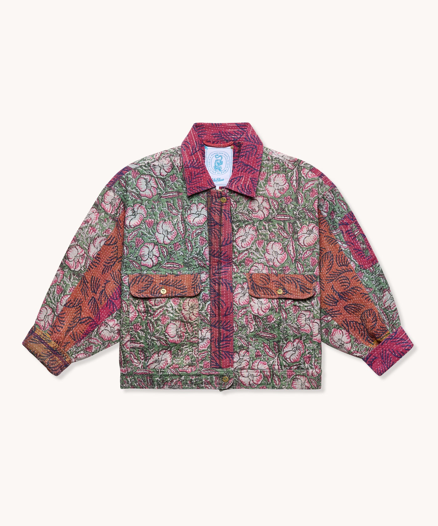 La veste est en 100% coton Kantha avec deux poches latérales, une poche cachée sur la manche gauche, une fermeture à zip et une languette avec bouton pour fermer le bas de la veste.