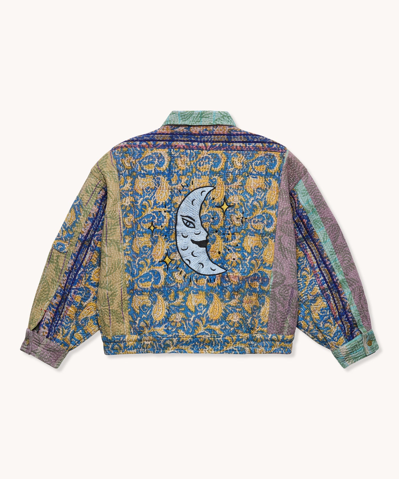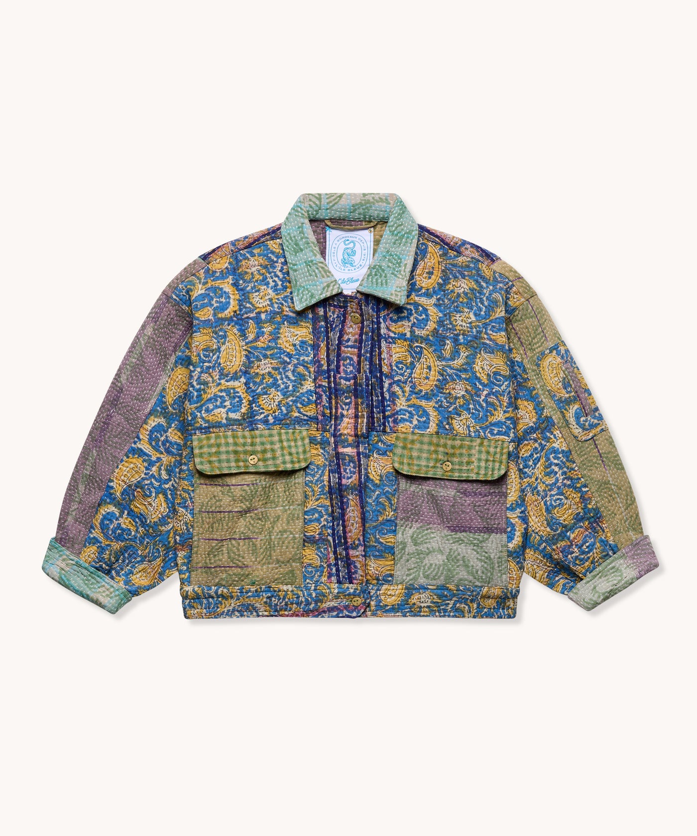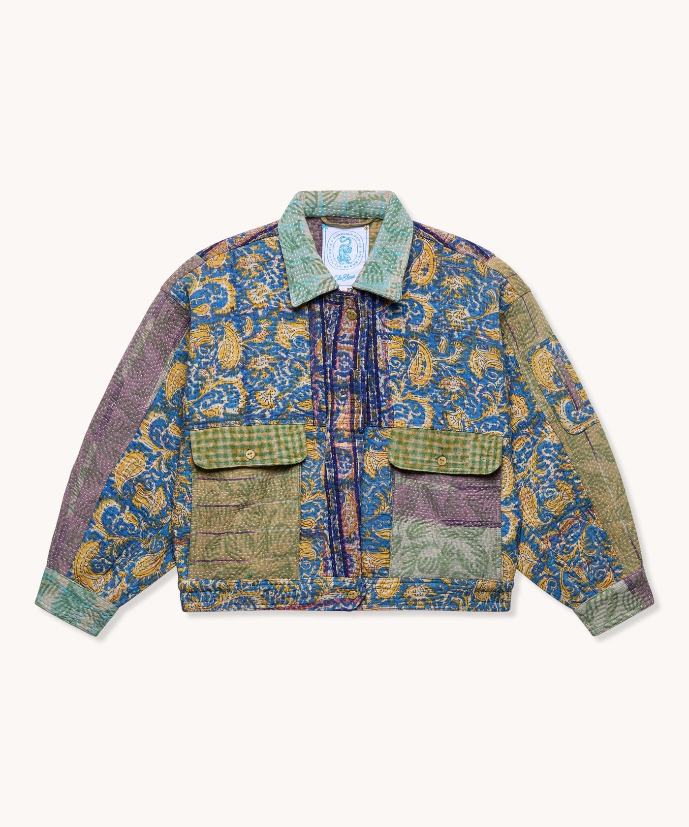 La veste est en 100% coton Kantha avec deux poches latérales, une poche cachée sur la manche gauche, une fermeture à zip et une languette avec bouton pour fermer le bas de la veste.