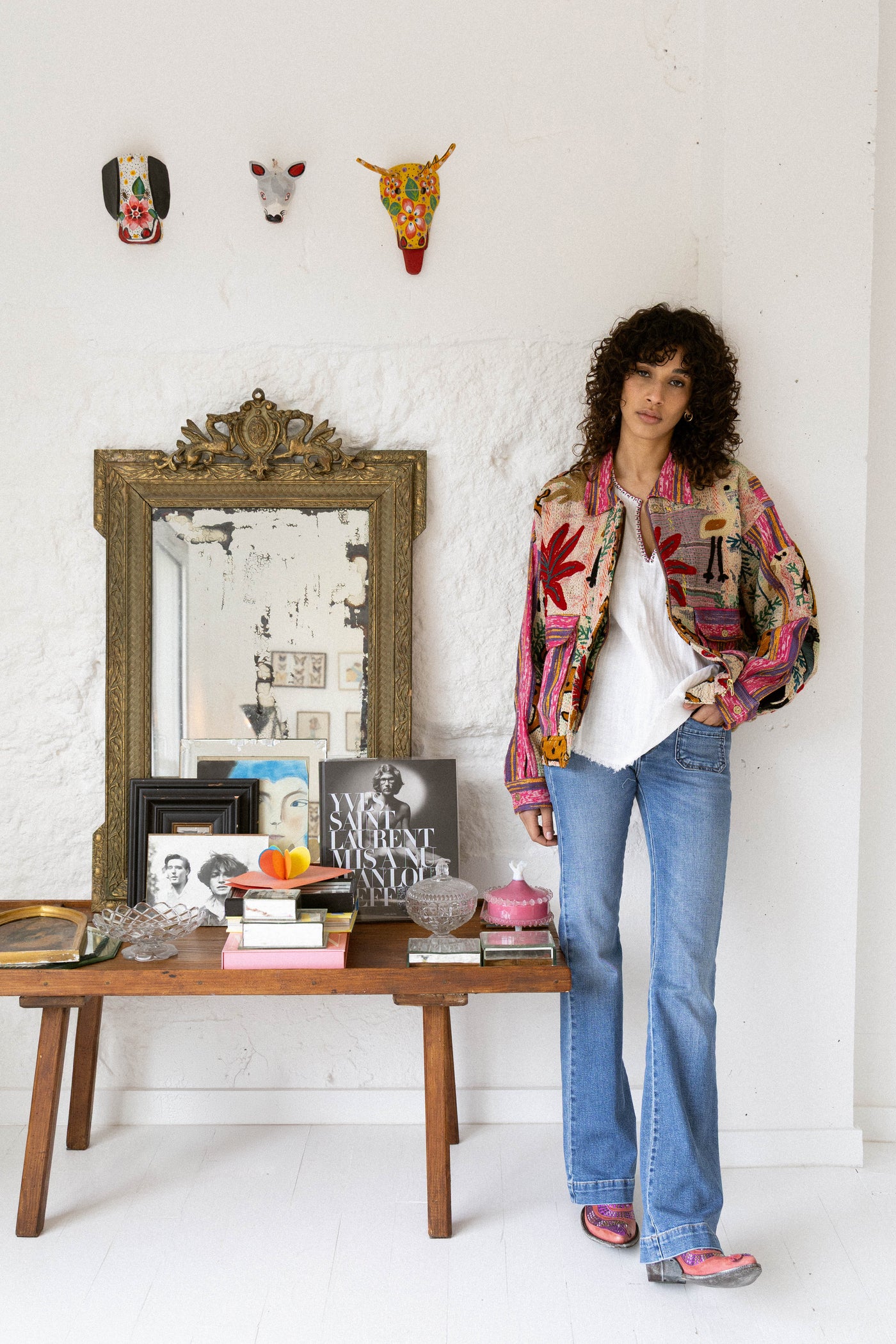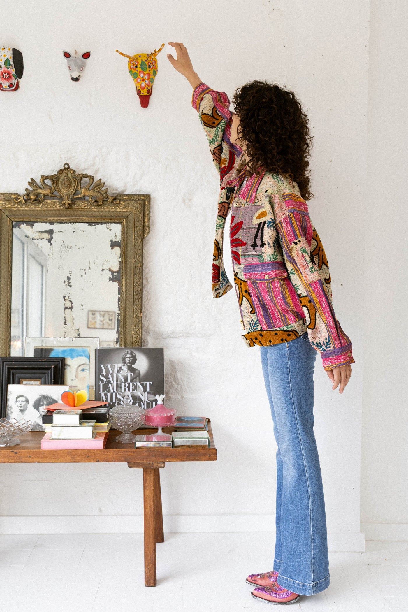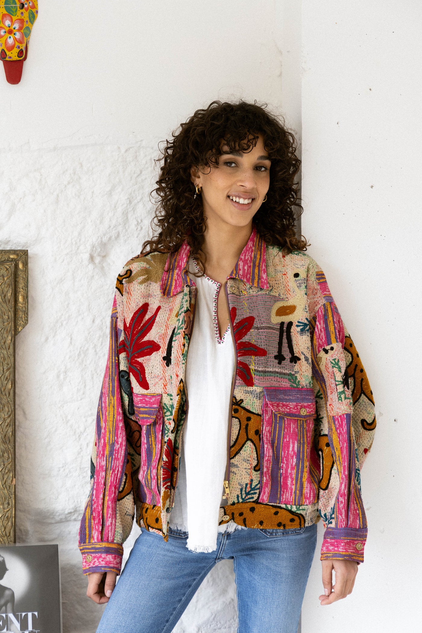 La veste est en 100% coton Kantha avec deux poches latérales, une poche cachée sur la manche gauche, une fermeture à zip et une languette avec bouton pour fermer le bas de la veste.