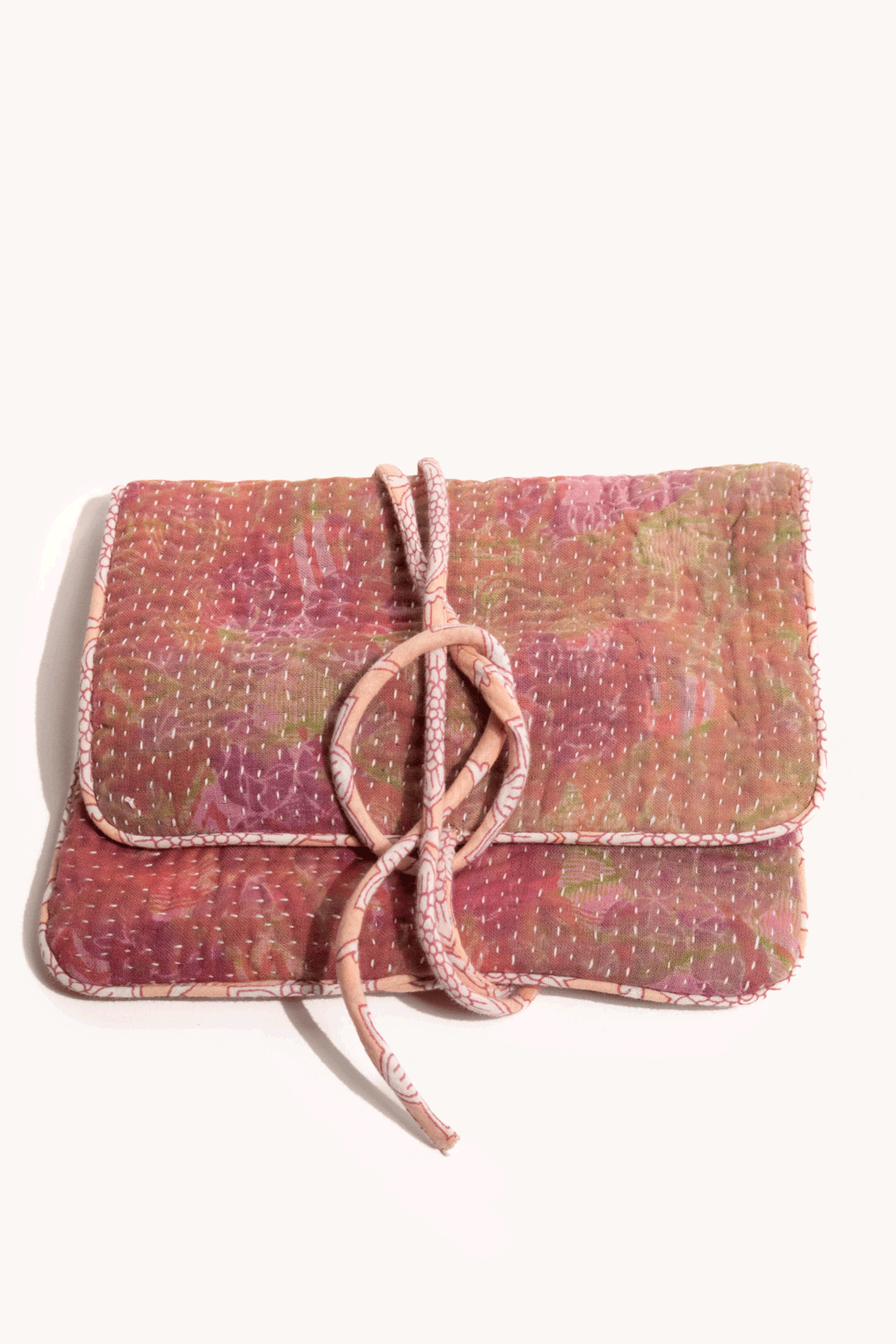 Indispensable pour vos voyages, cette trousse est entièrement faite à la main en Inde. Son tissu piqué traditionnel (Kantha) aux motifs fleuris protège vos bijoux avec douceur et style.