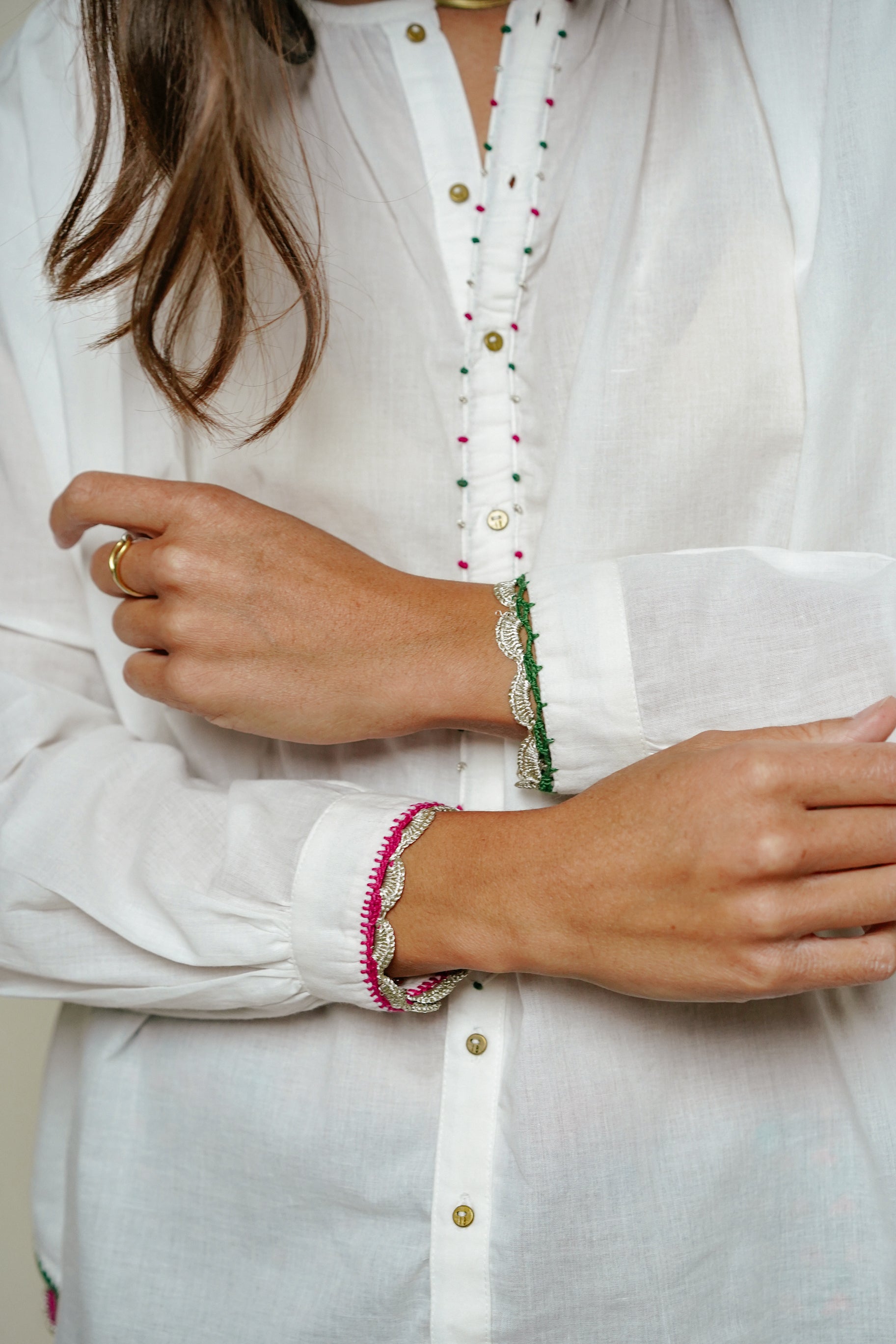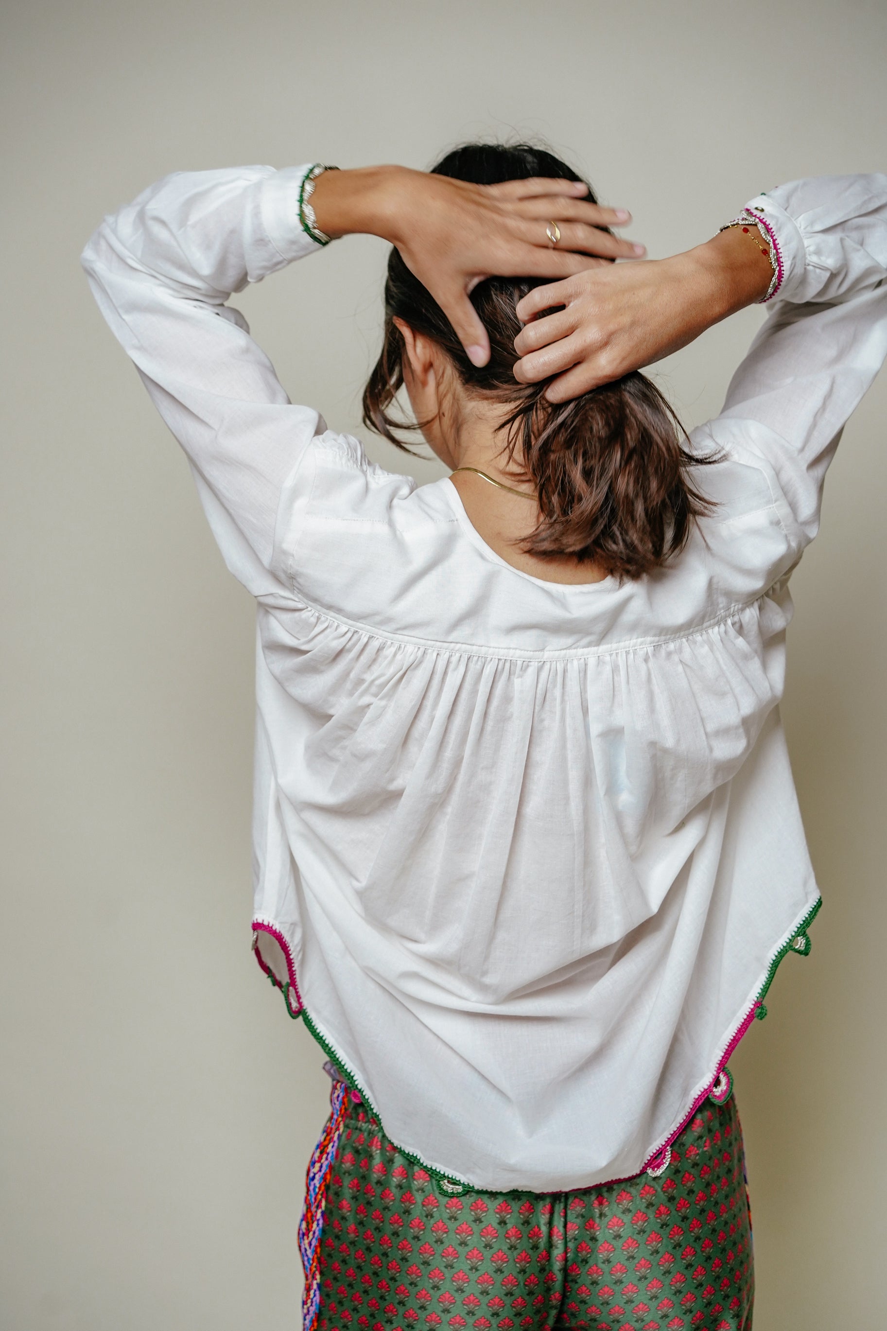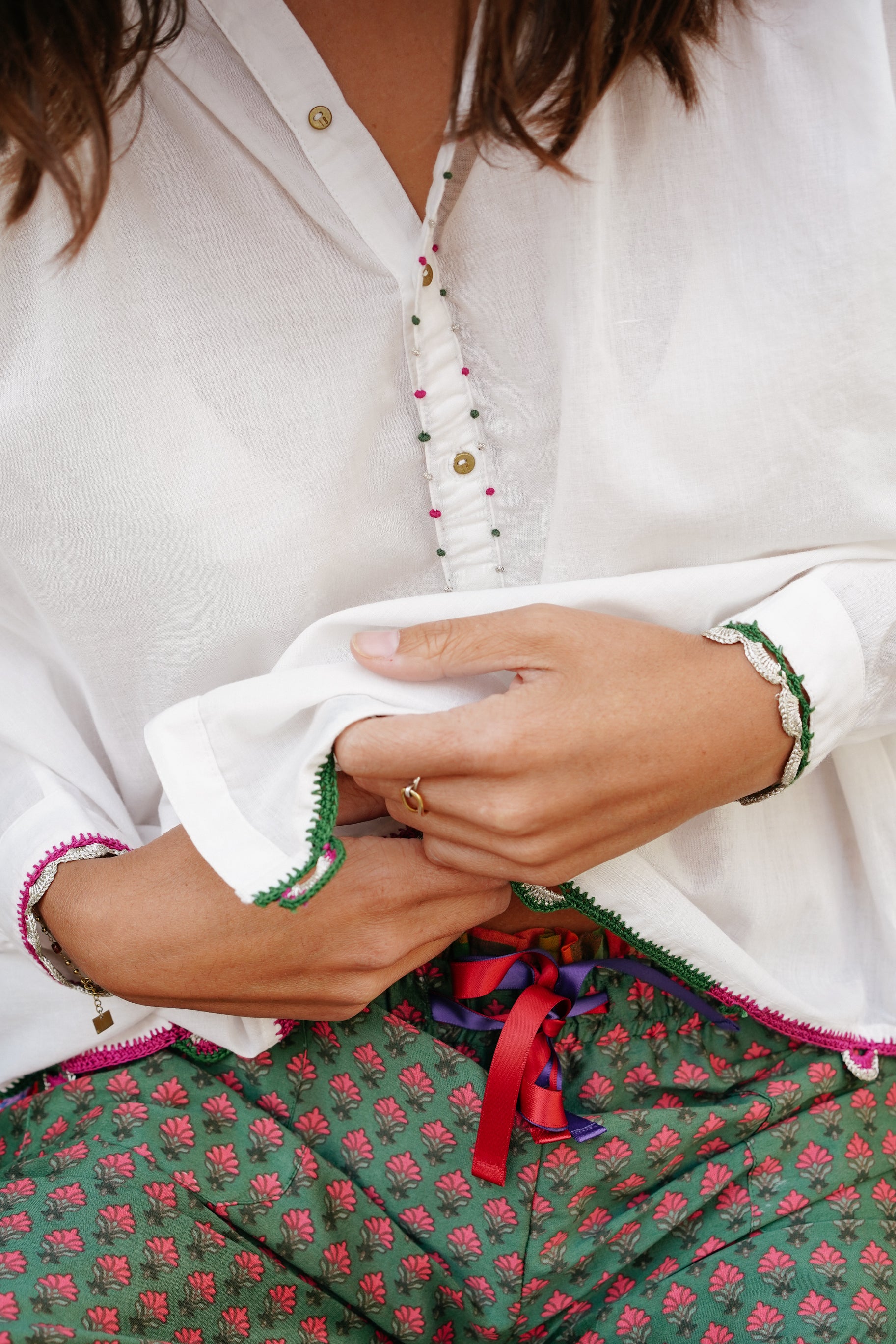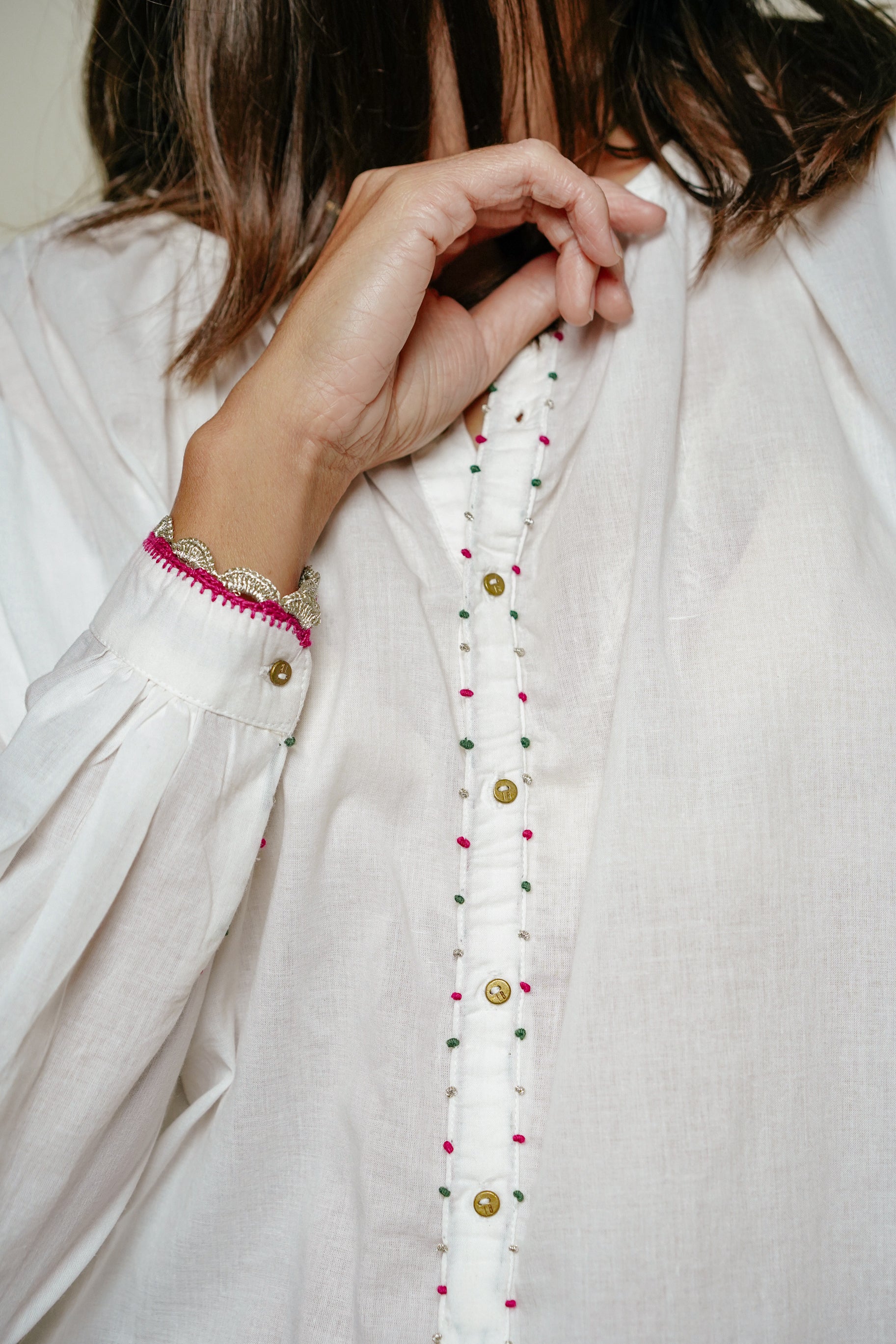 Son col tunisien subtilement souligné par une broderie artisanale multicolore apporte une note bohème et raffinée. Les détails contrastés en bas de manche et à l’ourlet ajoutent une touche d’originalité tout en restant faciles à assortir. Nos traditionnels french knots viennent sublimer la boutonnière et renforcer le caractère artisanal de la pièce.