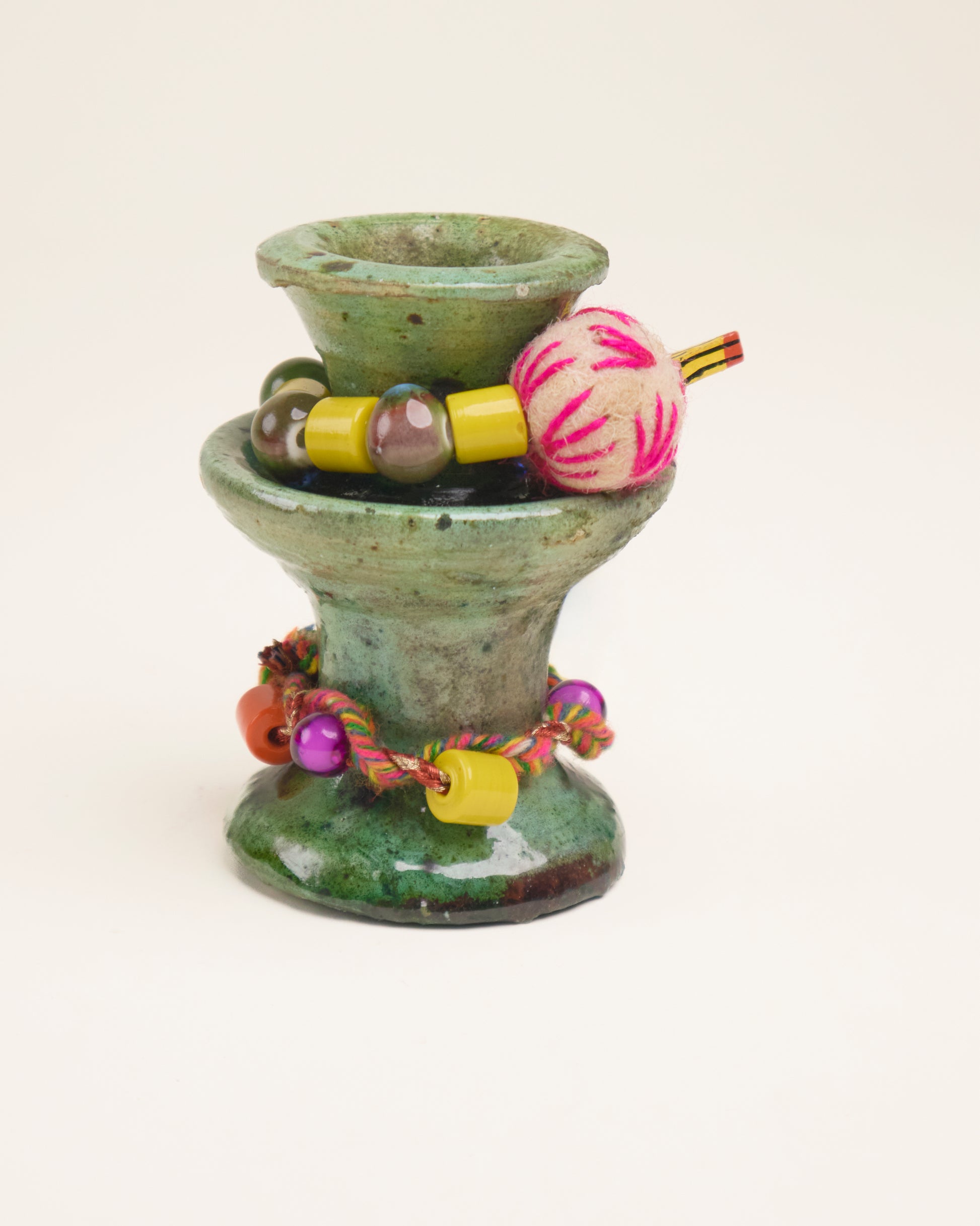 À cette base brute et authentique, Manon vient apporter sa touche personnelle : de délicats bijoux de perles faits main, qu’elle compose avec amour dans son atelier. Ces ornements viennent enlacer le bougeoir, créant une pièce poétique, mêlant terre et lumière, tradition et création.