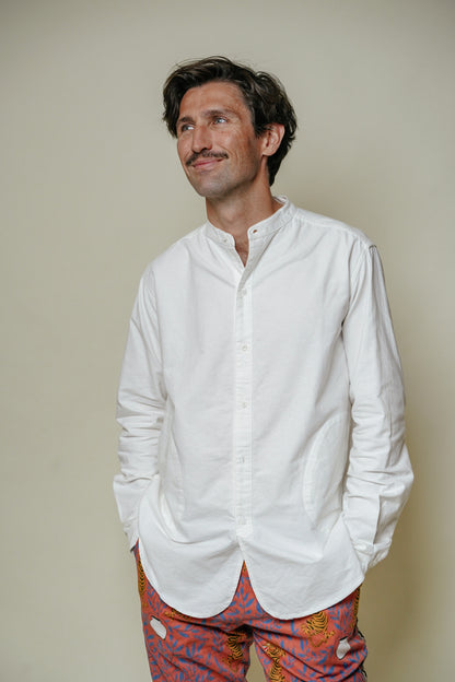 Manches longues, col mao avec une rangé de boutons nacrés pour fermer la chemise.