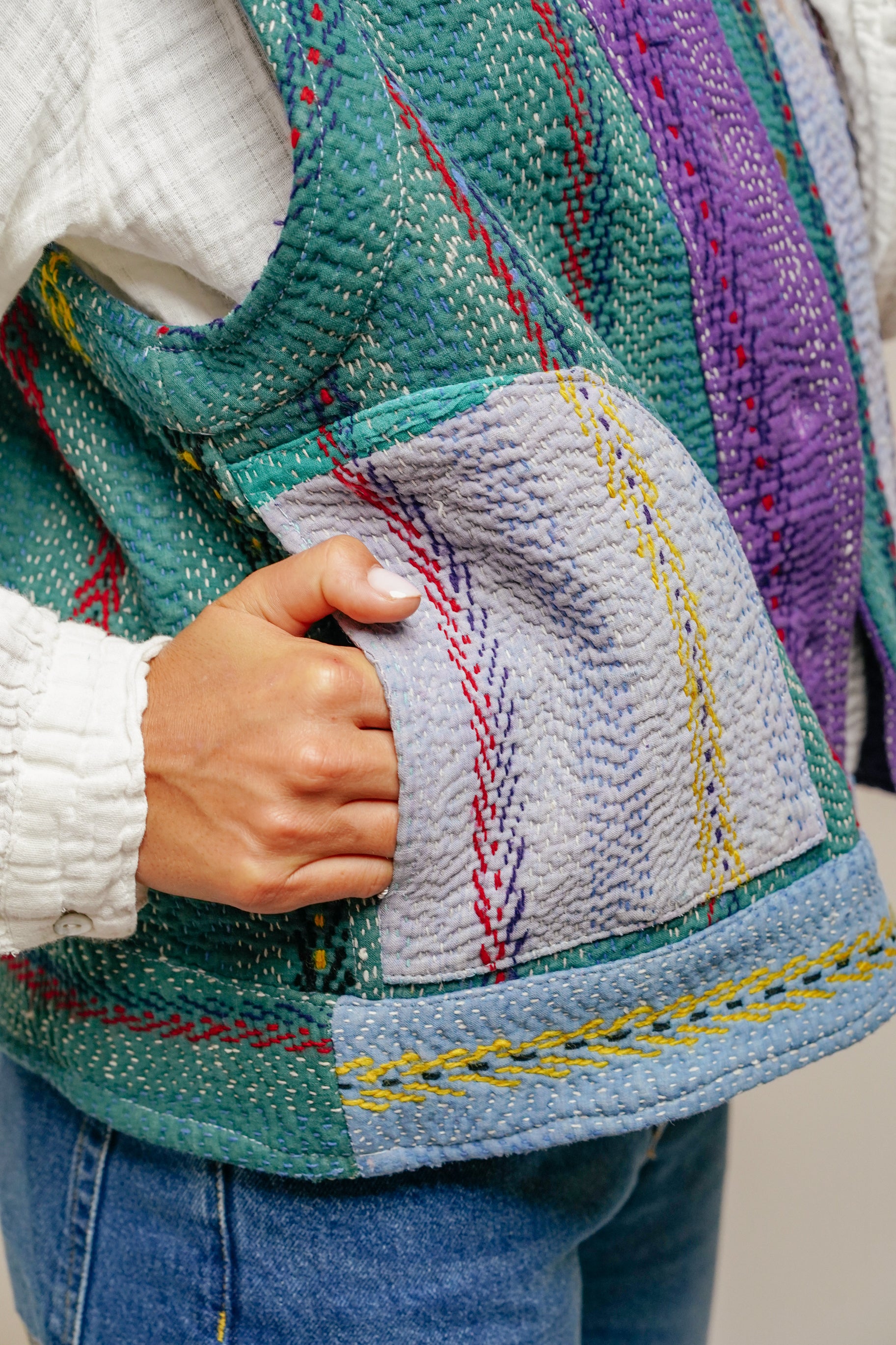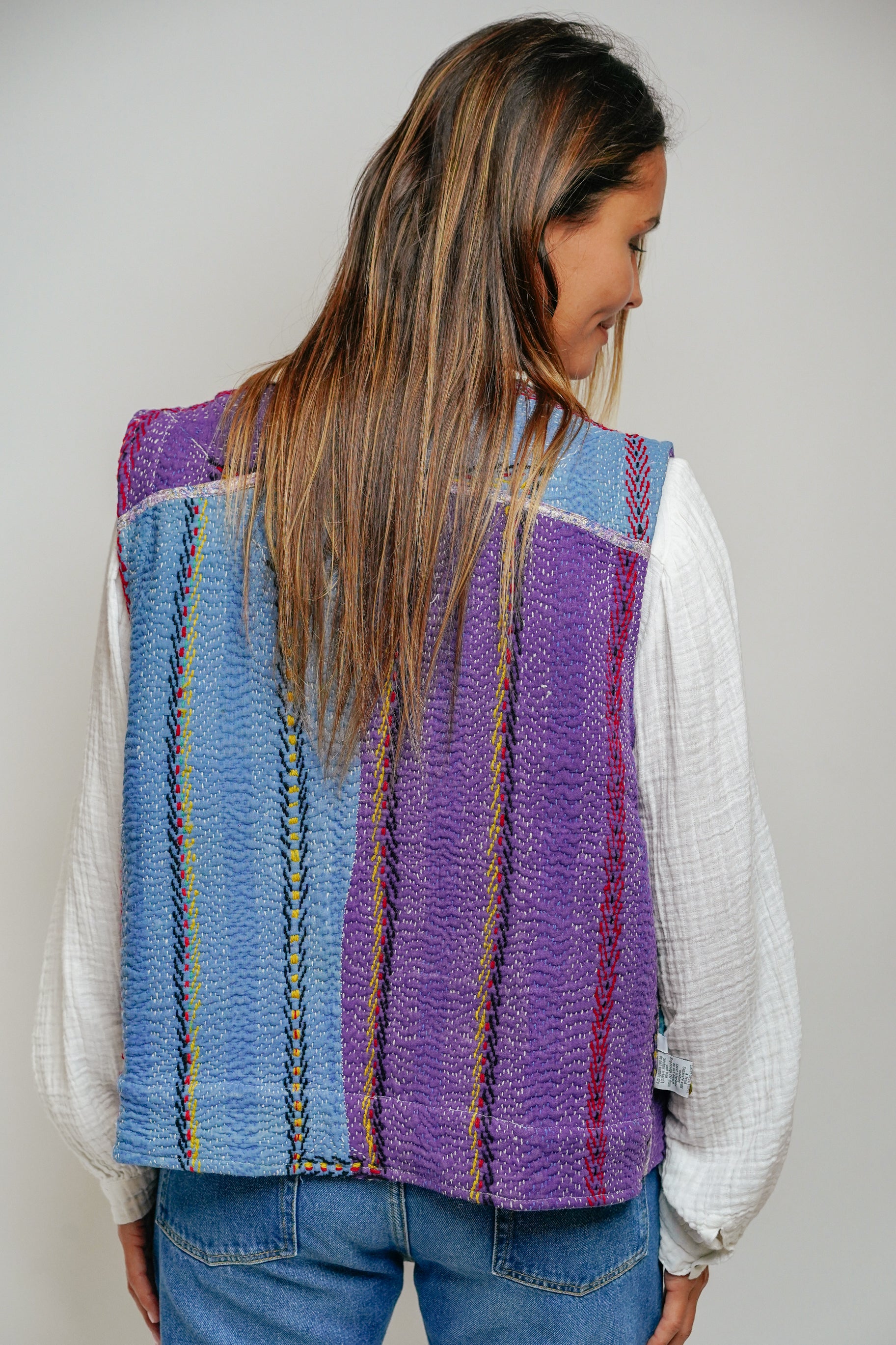 Le gilet Annie est une pièce rare qui célèbre le savoir-faire artisanal et l’élégance intemporelle. Imaginé à Bordeaux puis confectionné avec soin dans un atelier en Inde, il associe la richesse du Kantha – une technique traditionnelle de couture indienne – à la délicatesse des broderies Suzani, emblématiques d’Asie centrale.