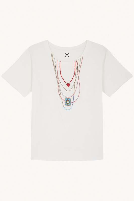 Le t-shirt Toro est un incontournable de chez Leon & Harper. Conçu en coton biologique, il se distingue par son illustration exclusive : un trompe-l'œil de colliers de perles colorées et de gris-gris brodés autour de l'encolure.