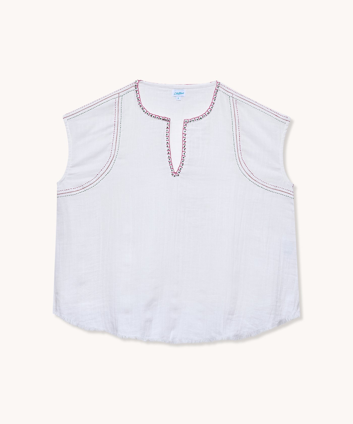 La blouse Chloé est une pièce légère sans manches, confectionnée dans une gaze de coton d'un blanc pur. Elle se distingue par son encolure tunisienne délicate et ses broderies artisanales contrastées (vert et rose) qui soulignent le col, les emmanchures et les coutures verticales. Sa coupe fluide et sa base effilochée apportent une touche bohème et décontractée.