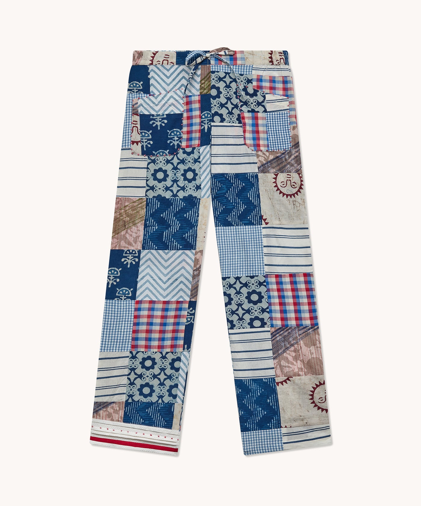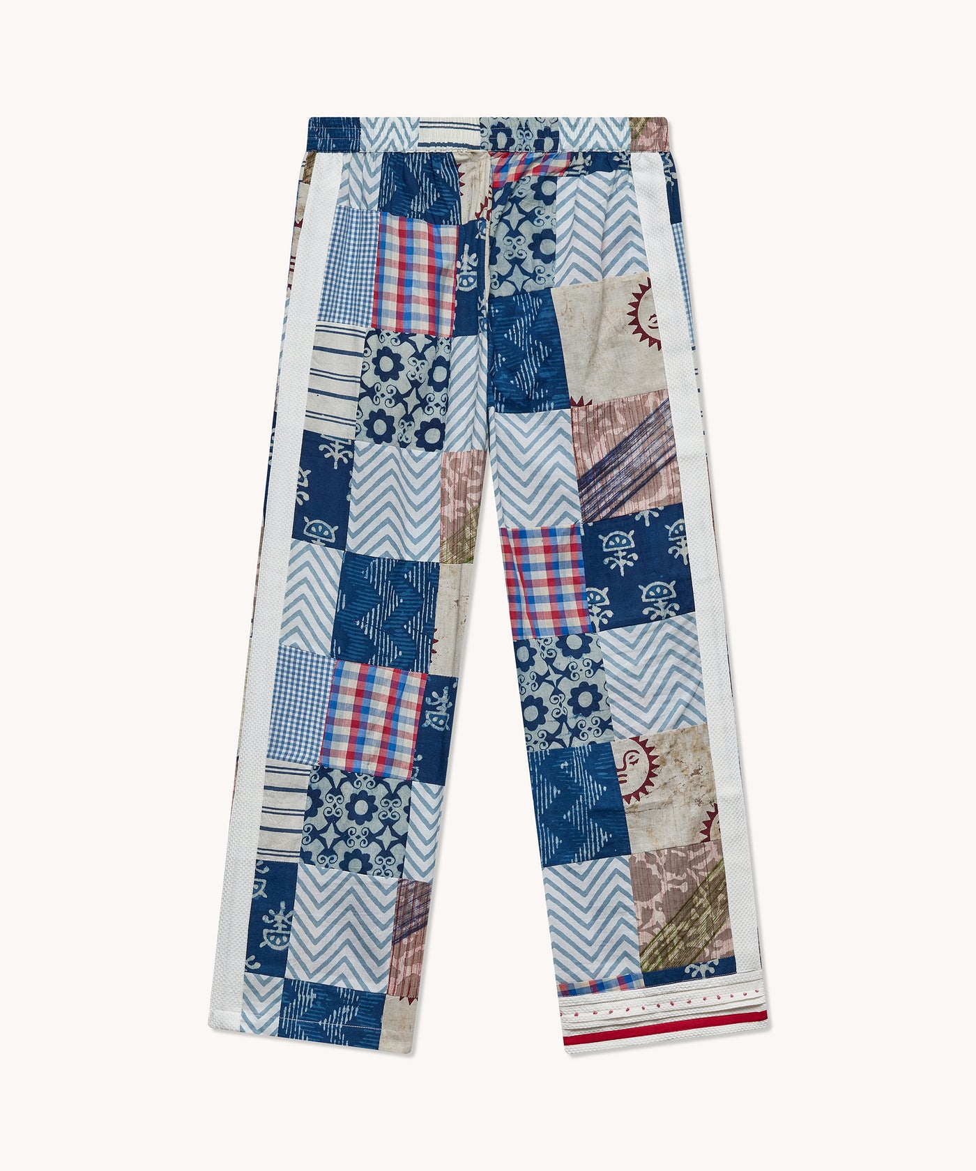 Fluid pants with elasticated waist and matching drawstring. It features two front patch pockets with visible red topstitching and full-length white side stripes.