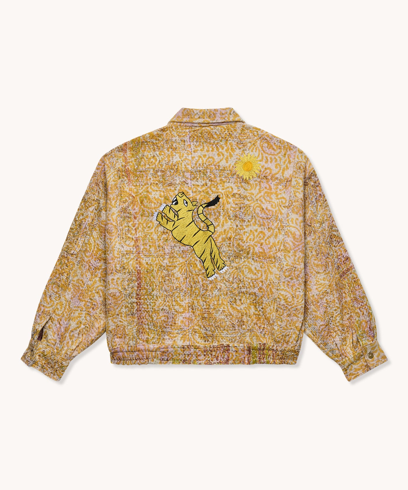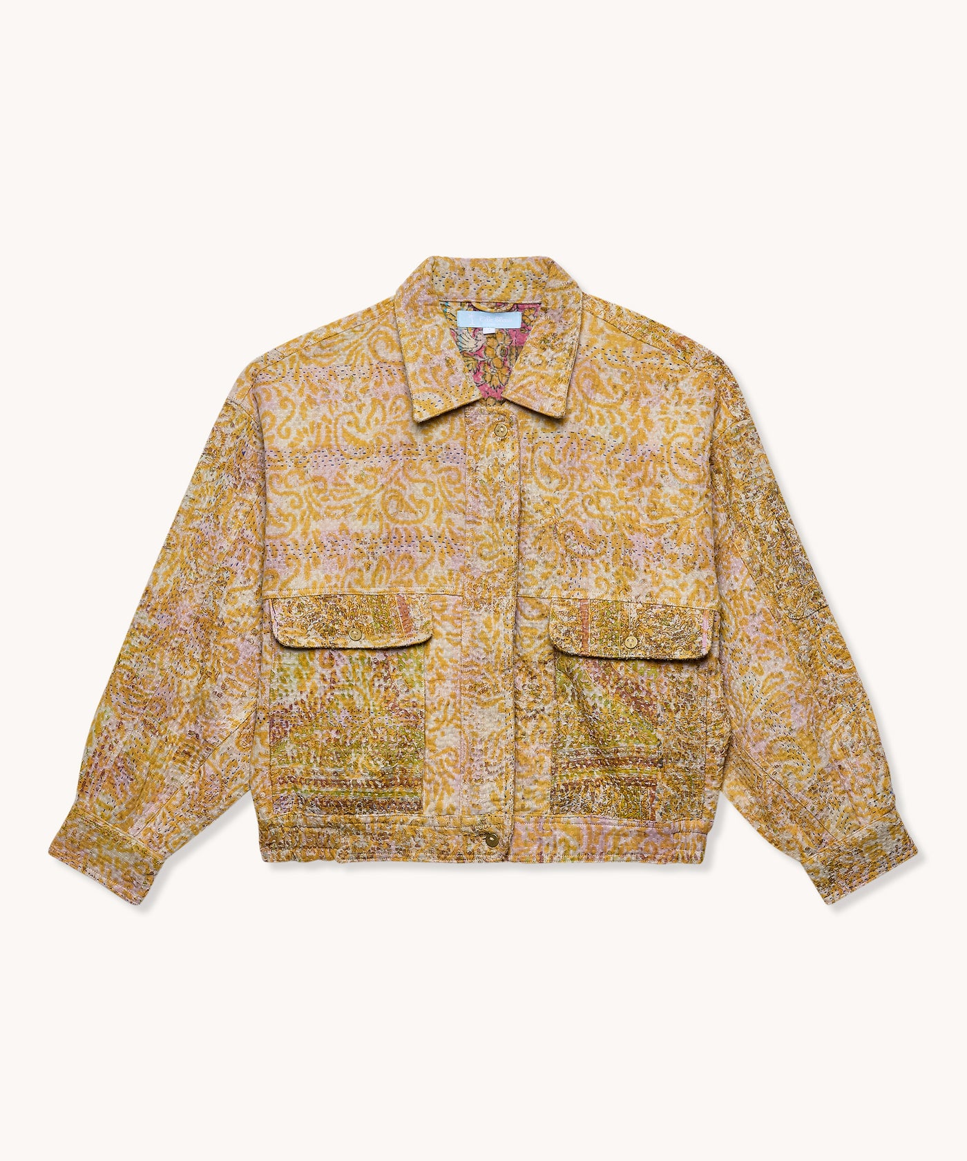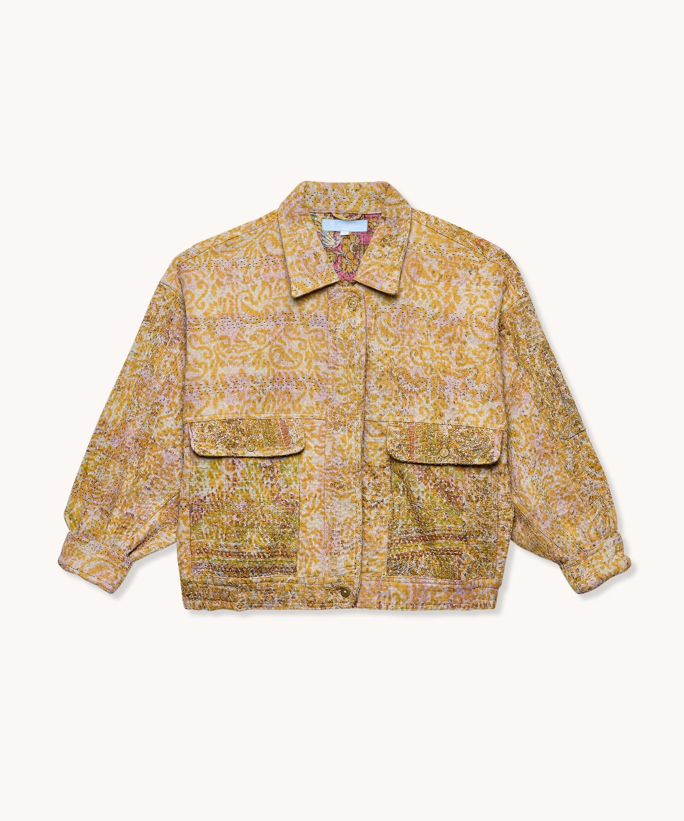 La veste est en 100% coton Kantha avec deux poches latérales, une poche cachée sur la manche gauche, une fermeture à zip et une languette avec bouton pour fermer le bas de la veste.