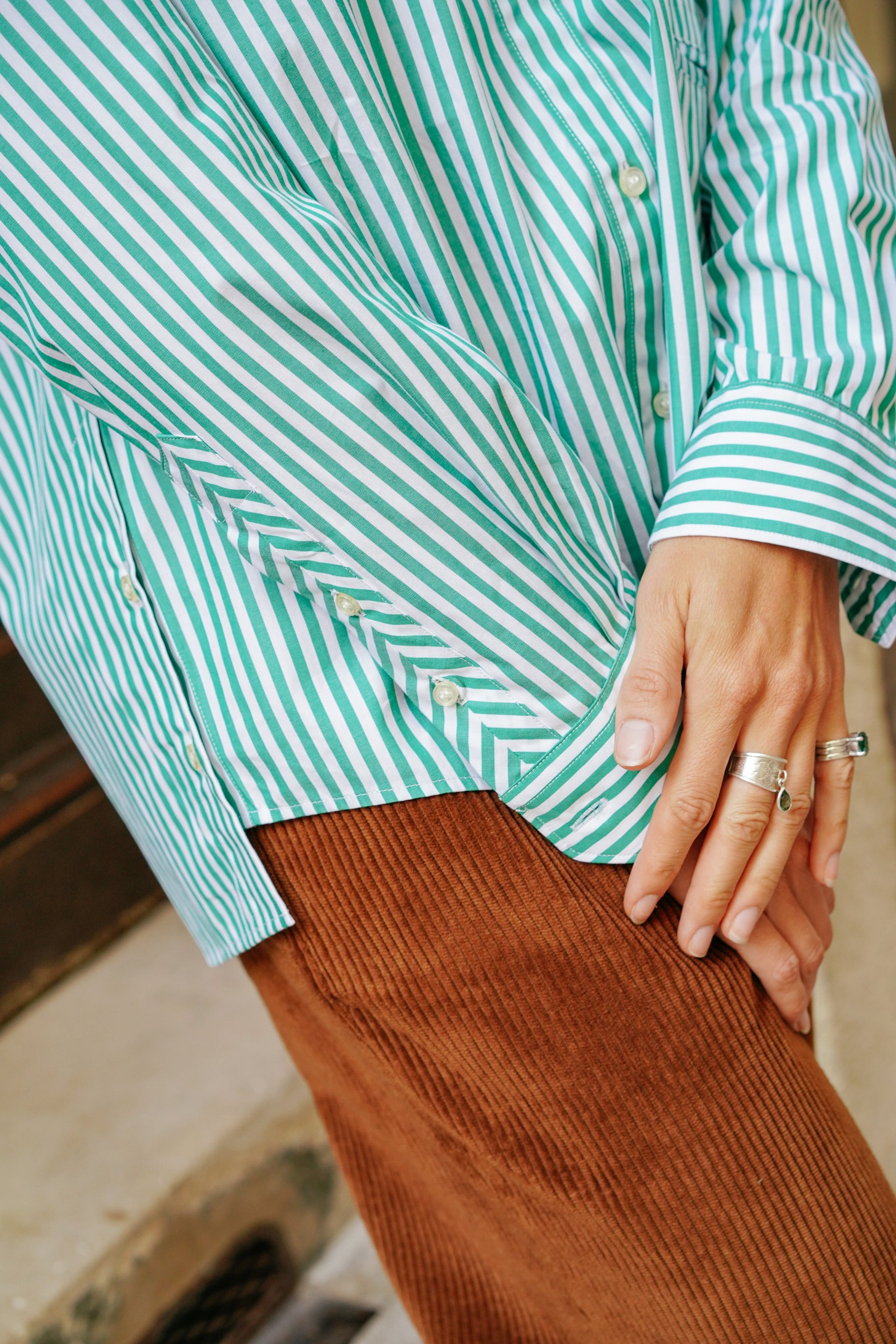 The Celen Strp shirt embodies Leon & Harper's casual chic aesthetic, thanks to its relaxed fit and striped pattern. Made entirely of cotton, it features a classic collar, a discreet button placket, and long sleeves with buttoned cuffs. Dropped shoulders and a back pleat add a touch of softness to the drape. Wear it with jeans for an urban look or tailored trousers for a more structured style.