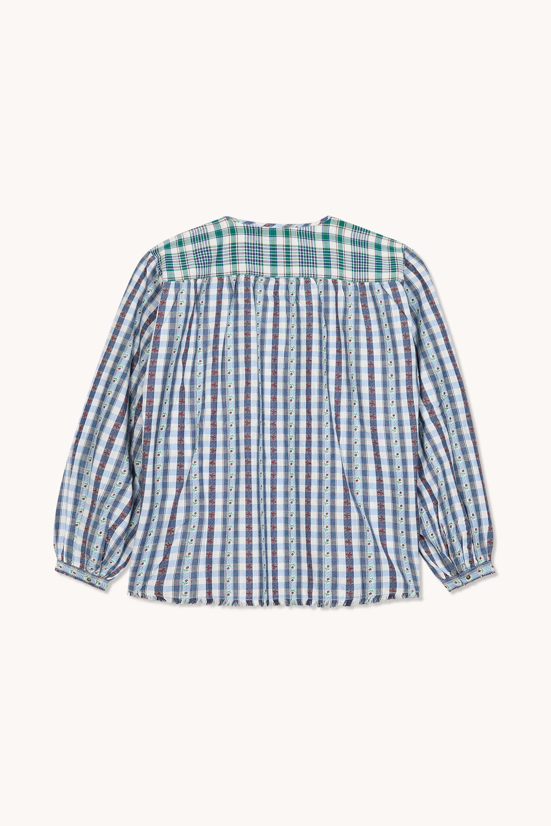 This lightweight blouse in 100% cotton is appealing in its spirit Bohemian and relaxed. Its blue and white checkered print , punctuated with small, discreet patterns, it is enhanced by contrasting patch pockets in green tiles which add a touch of originality.