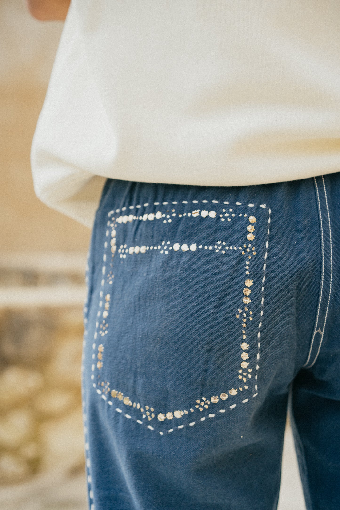 Details of hand-embroidered metallic thread called "Mukaish", along the side seam, patch pocket and knee pads.