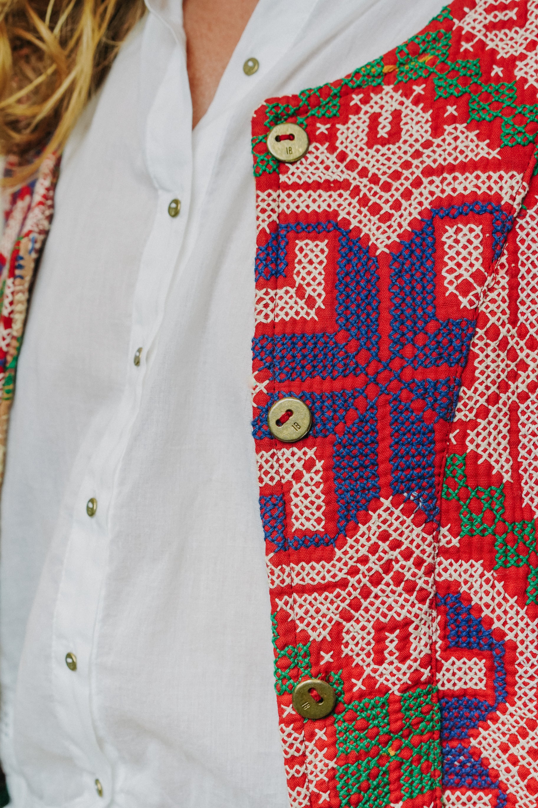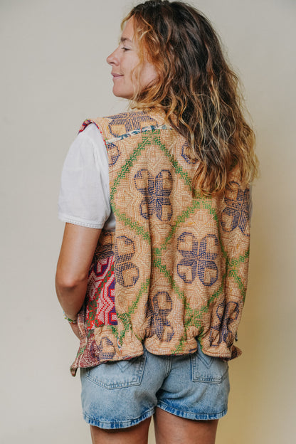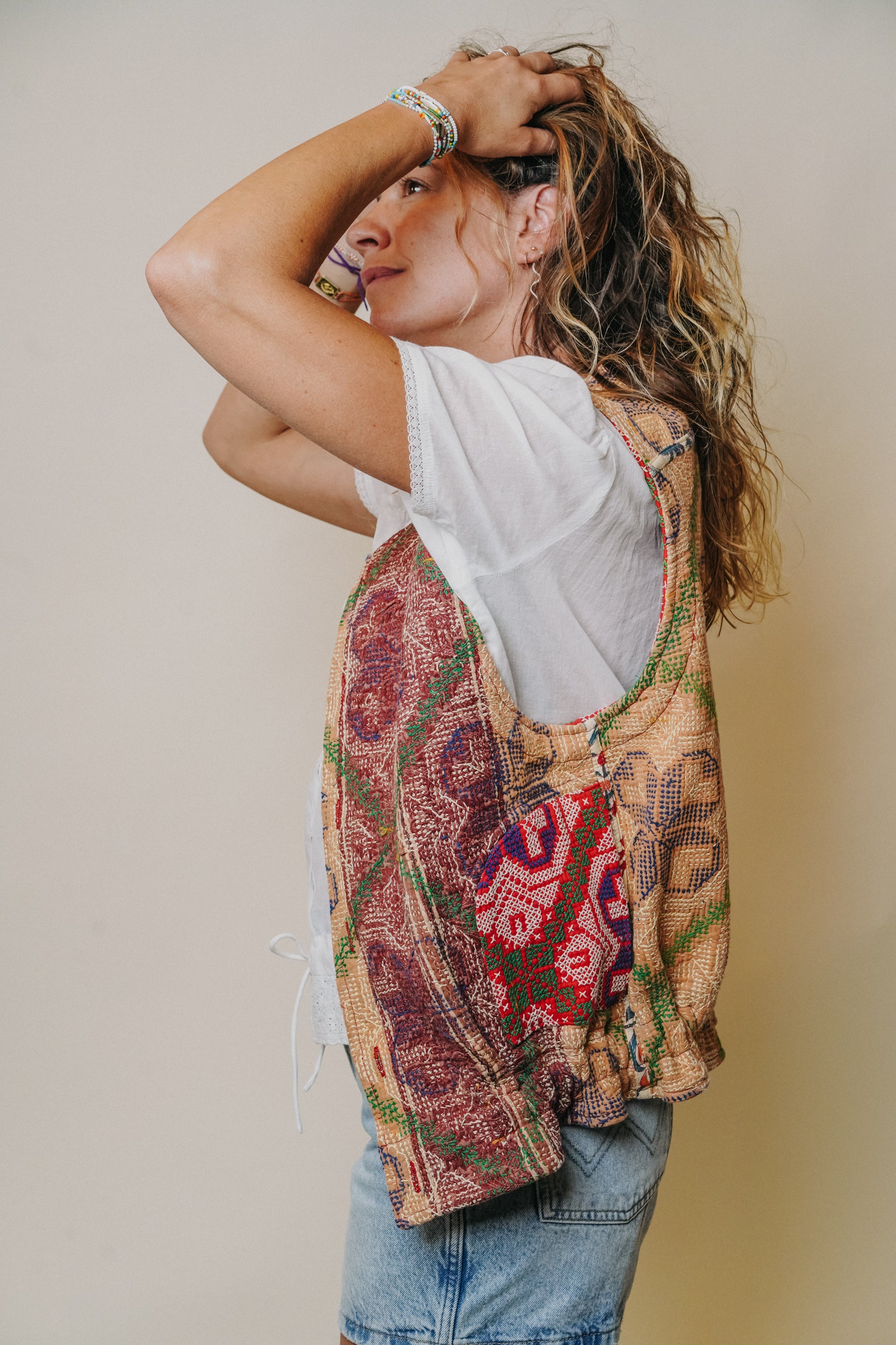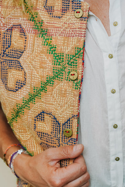 Kantha fabric comes directly from India and is also known as a material used to mend saris. Suzani embroidery creates the raised effect on our vests.