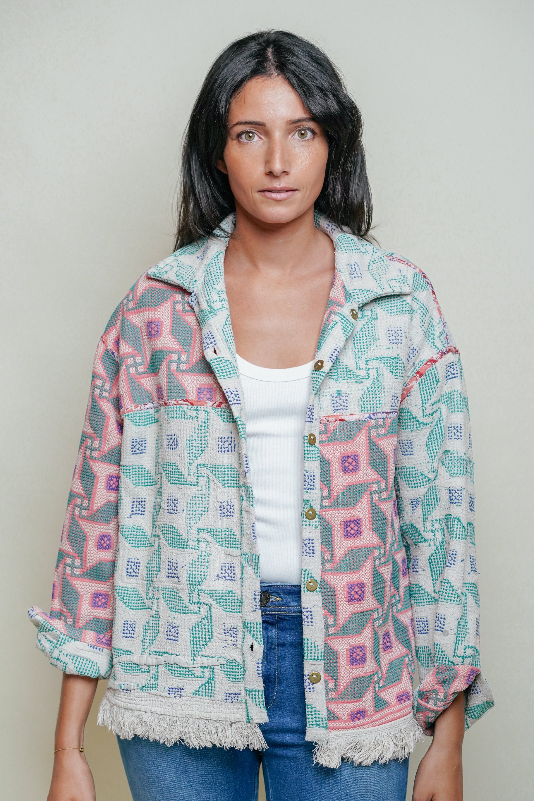 This unique woven cotton jacket combines authentic craftsmanship with modern style. Designed in Bordeaux and made in India, it stands out with its colorful geometric patterns and fringed trim, giving it a bold yet refined character.