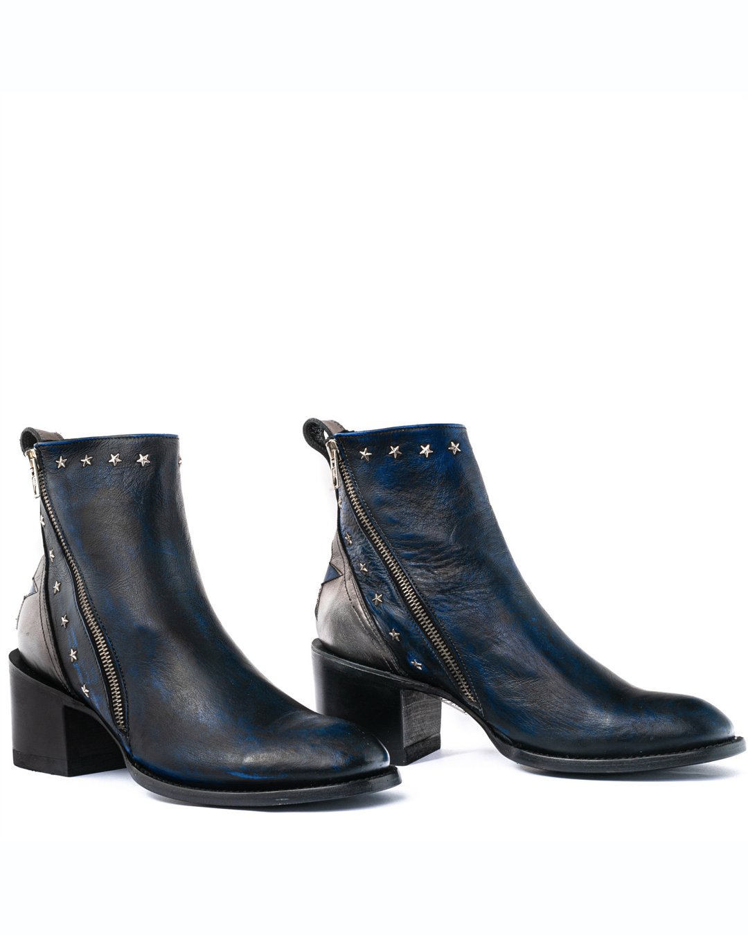 Blue leather 100% cowhide, a blue star behind the heel, surrounded by silver pink leather and to finish the boot beautifully, studs highlight the ankle.