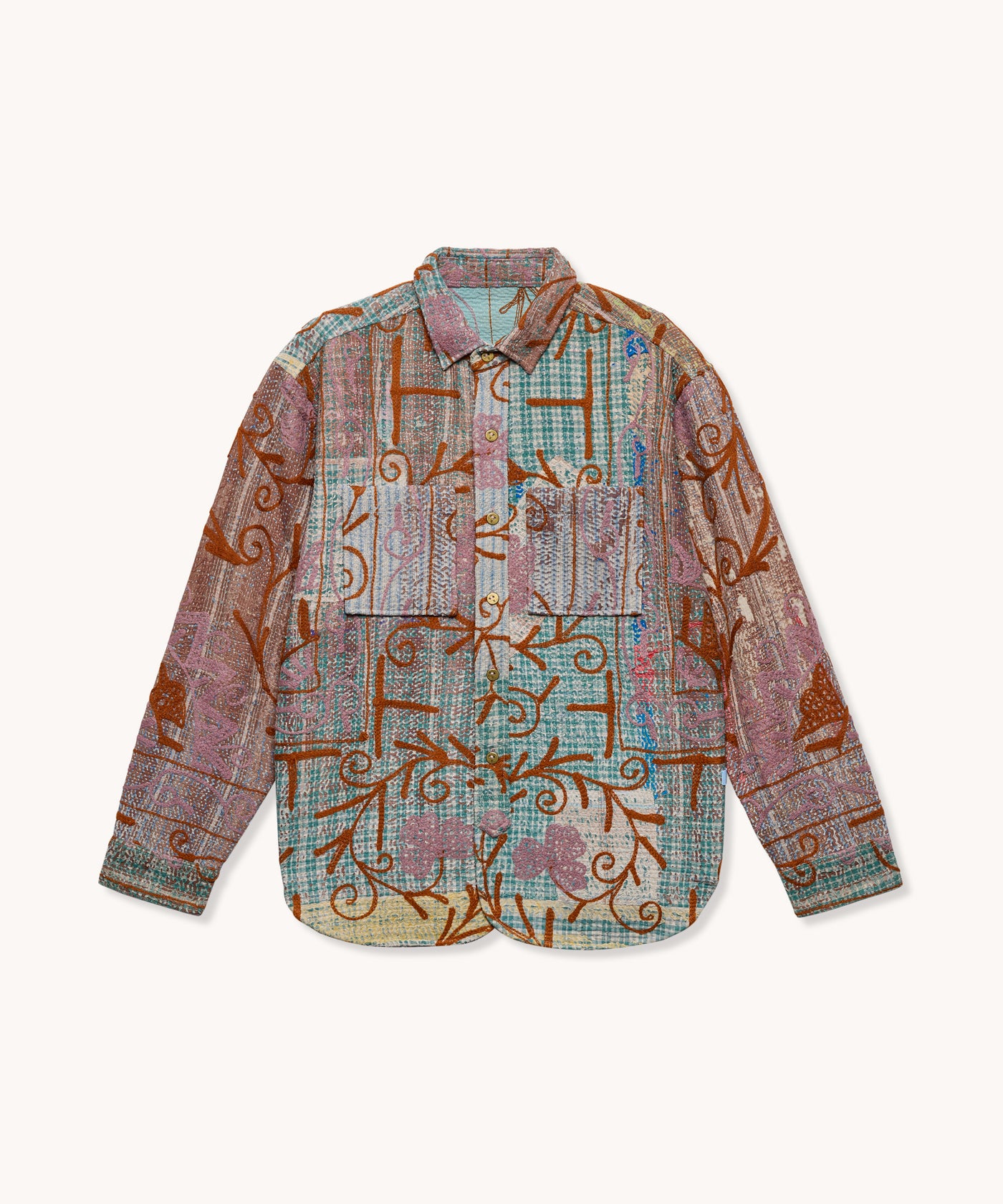 La surchemise Paul en kantha suzani est coupée comme une chemise classique, la surchemise Paul se porte sur un tee-shirt, à même à la peau ou sous un manteau. Elle allie confort et style avec ses couleurs et motifs uniques.