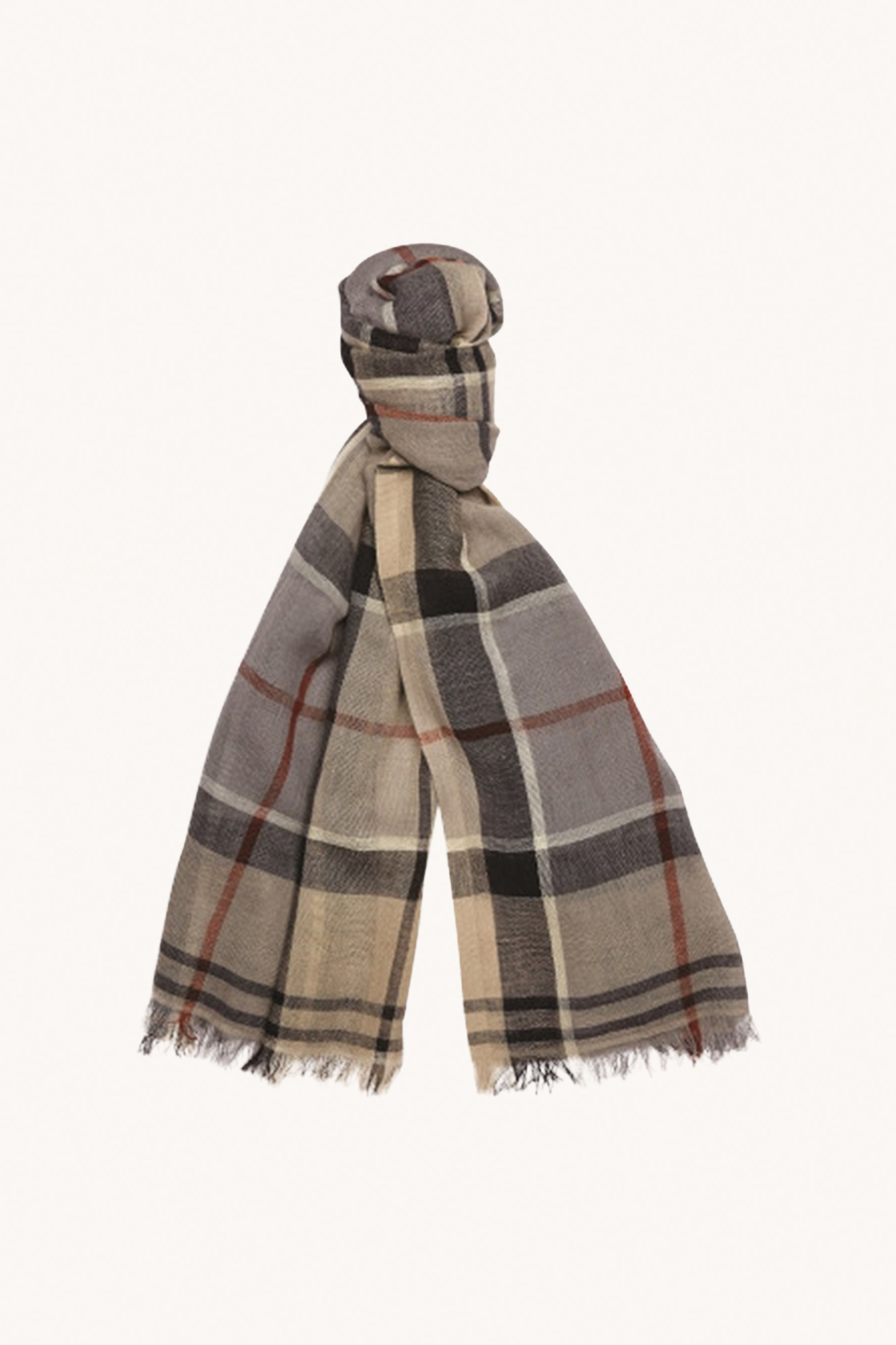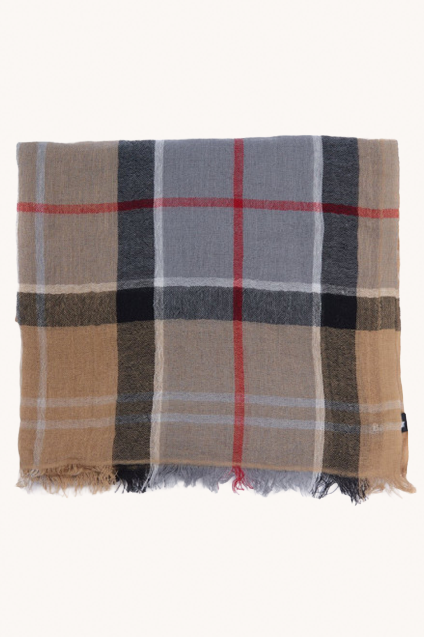 Véritable hommage à l'héritage de la marque, ce foulard arbore les célèbres motifs tartan emblématiques de Barbour, déclinés ici dans des teintes de beige, bleu et gris. Ses dimensions généreuses de 190 cm x 66 cm permettent de le draper confortablement autour du cou, offrant une protection idéale contre les brises légères et la fraîcheur.