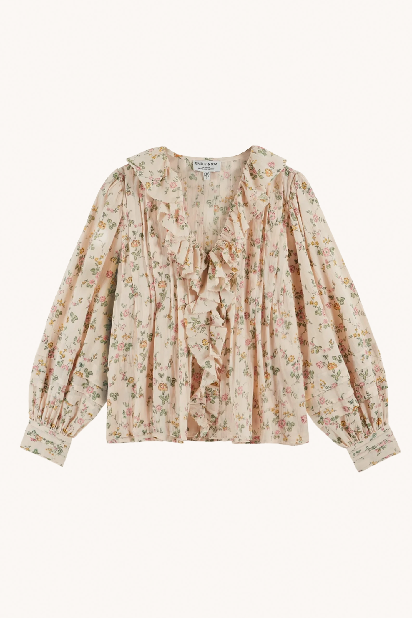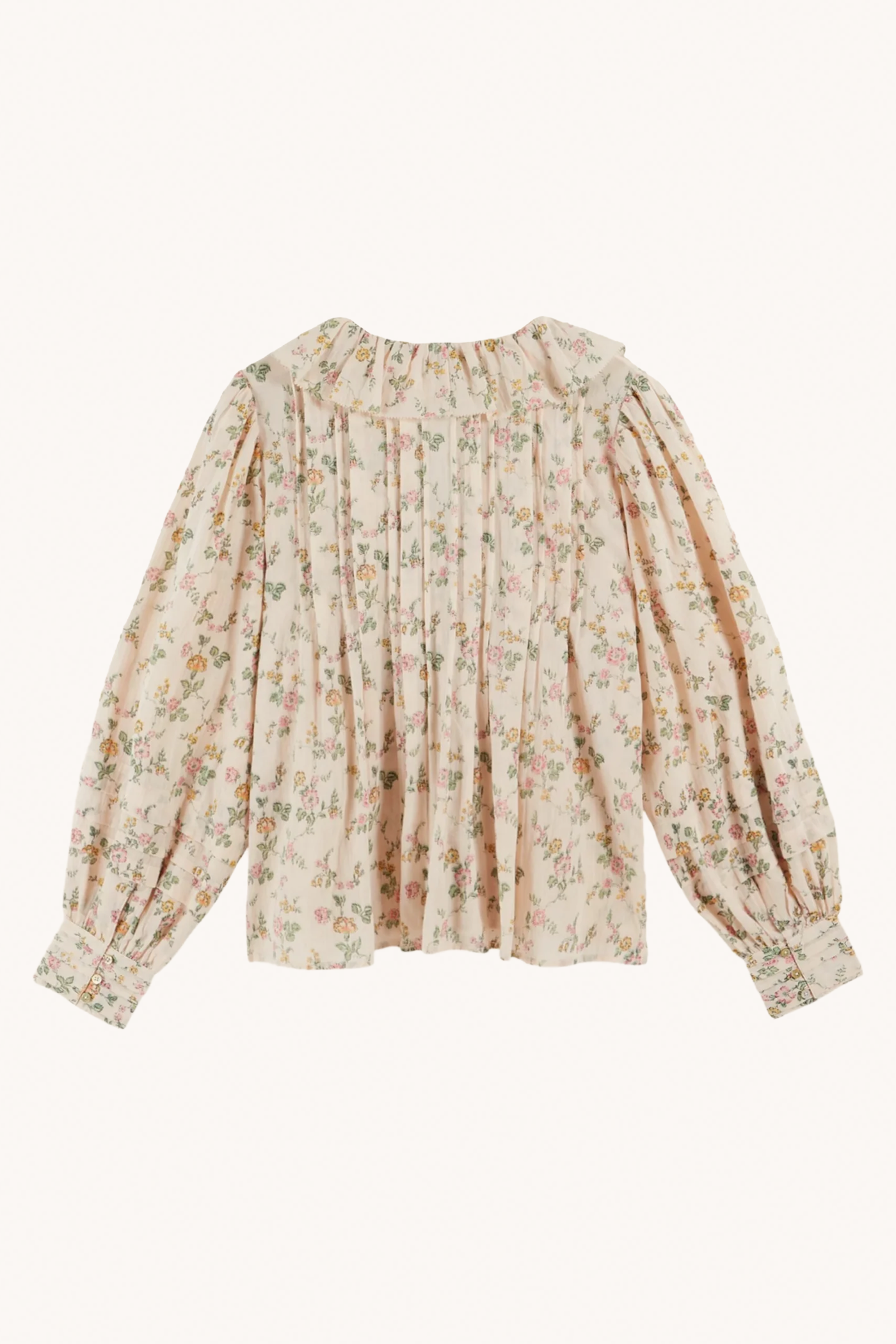 Cette blouse en coton bio crème rosé se distingue par son imprimé fleuri délicat, directement inspiré d’une pièce vintage. Sa coupe ample offre une allure aérienne, tandis que le décolleté orné d'un volant raffiné souligne toute la féminité du modèle. Le travail de structure est marqué par des plis couchés à la poitrine et au dos, apportant relief et élégance. Les manches longues sont également plissées et se terminent par des poignets soignés à trois boutons de manchettes.