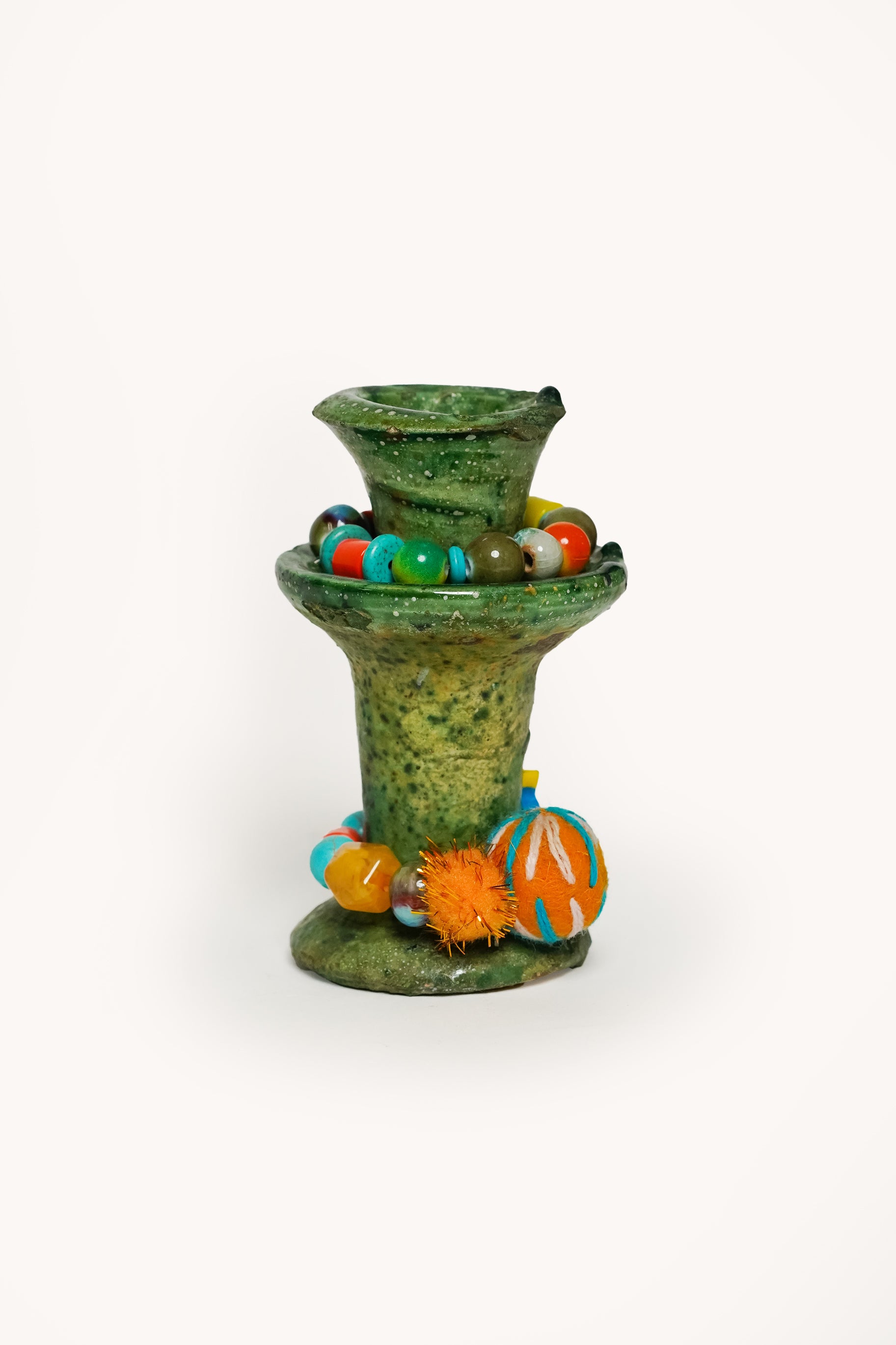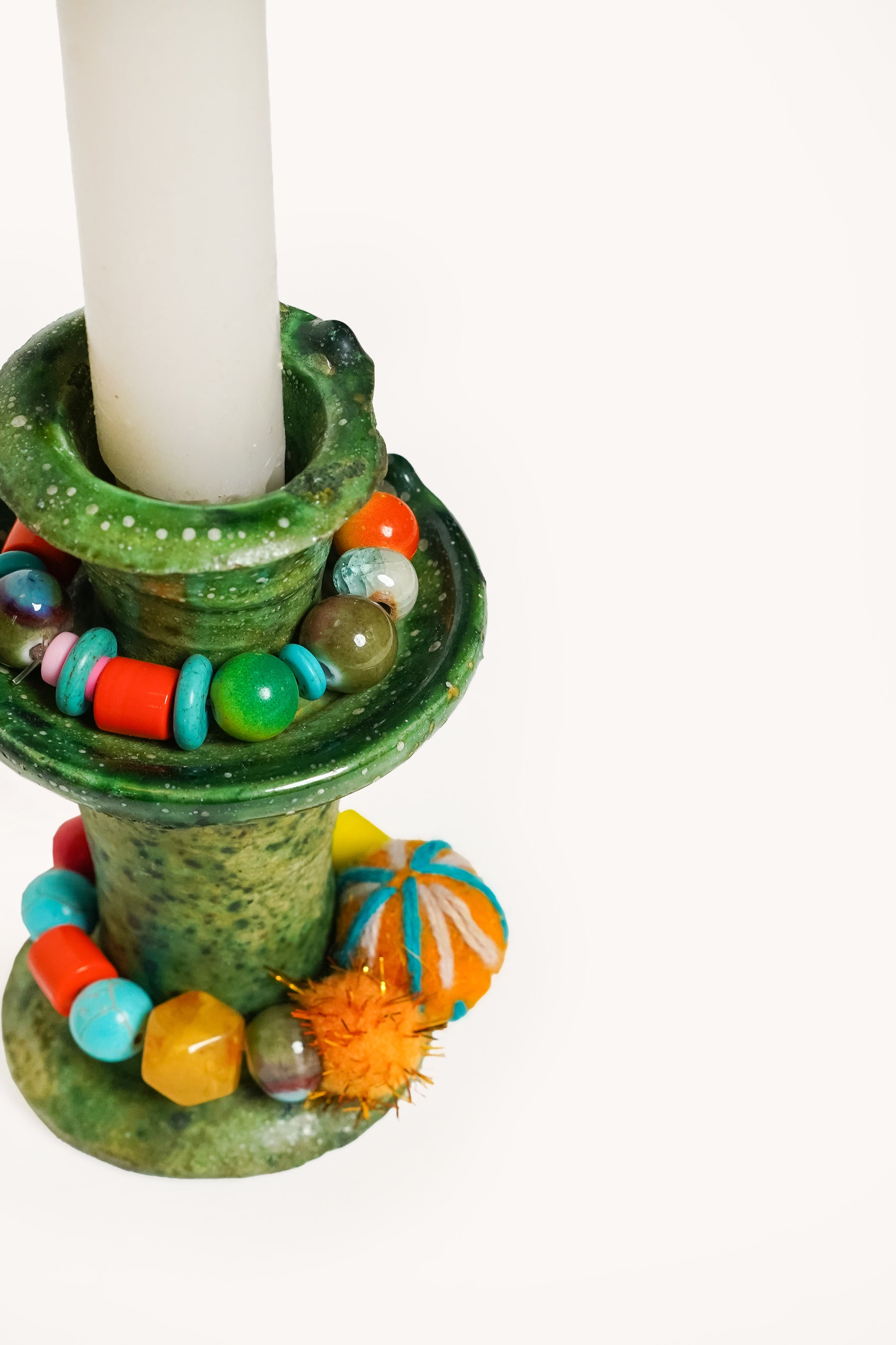 À cette base brute et authentique, Manon vient apporter sa touche personnelle : de délicats bijoux de perles faits main, qu’elle compose avec amour dans son atelier. Ces ornements viennent enlacer le bougeoir, créant une pièce poétique, mêlant terre et lumière, tradition et création.
