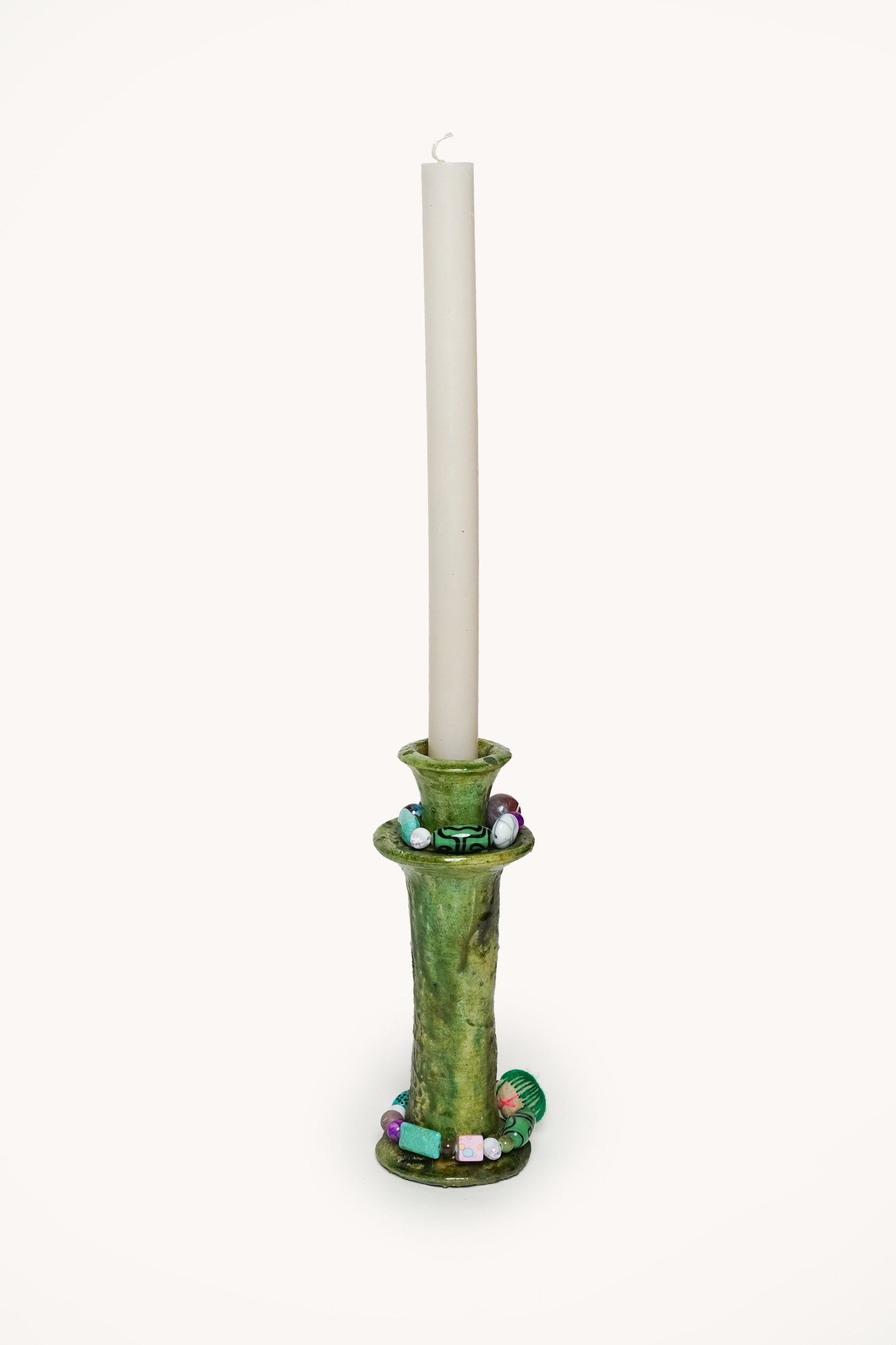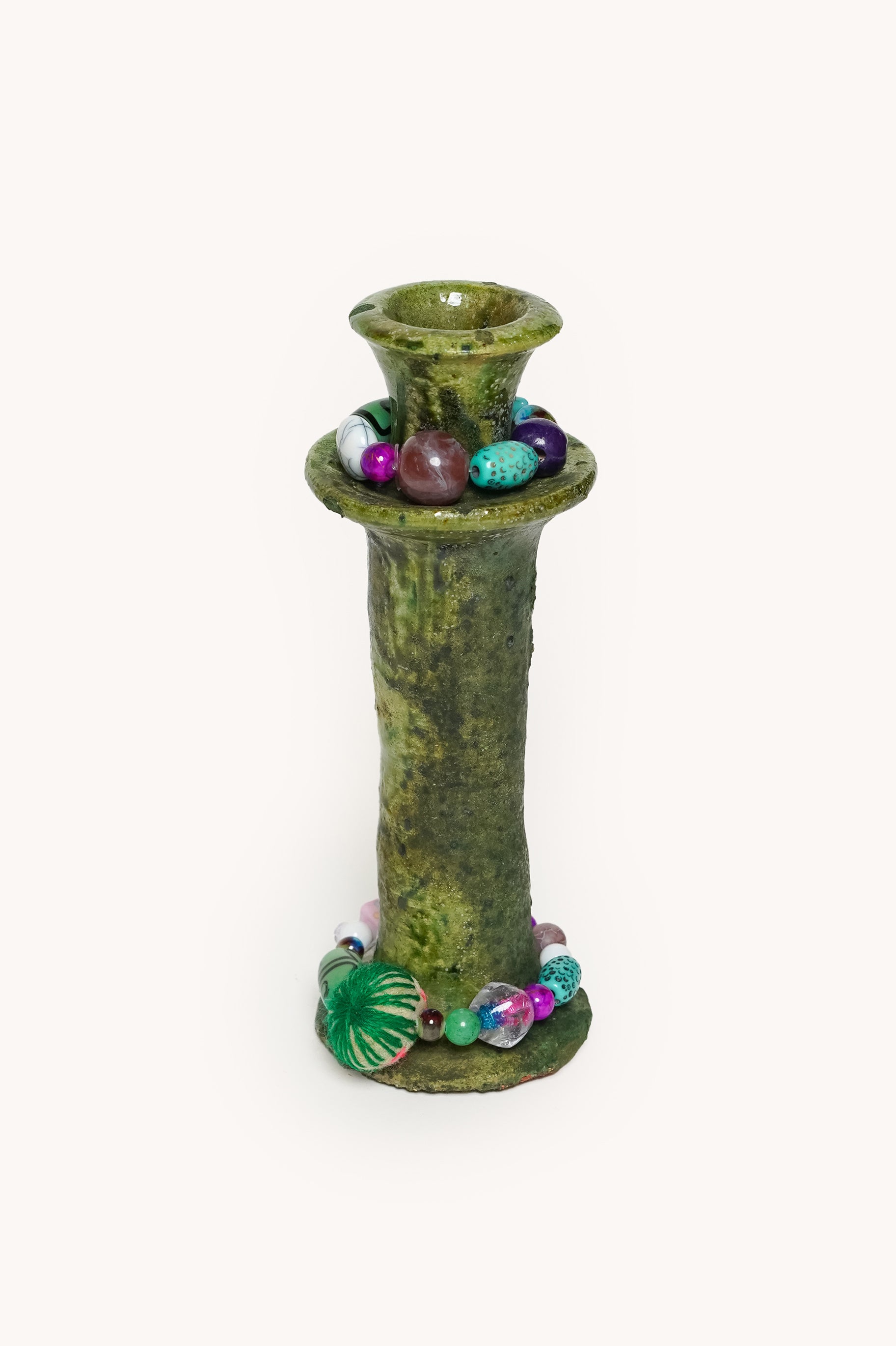 À cette base brute et authentique, Manon vient apporter sa touche personnelle : de délicats bijoux de perles faits main, qu’elle compose avec amour dans son atelier. Ces ornements viennent enlacer le bougeoir, créant une pièce poétique, mêlant terre et lumière, tradition et création.