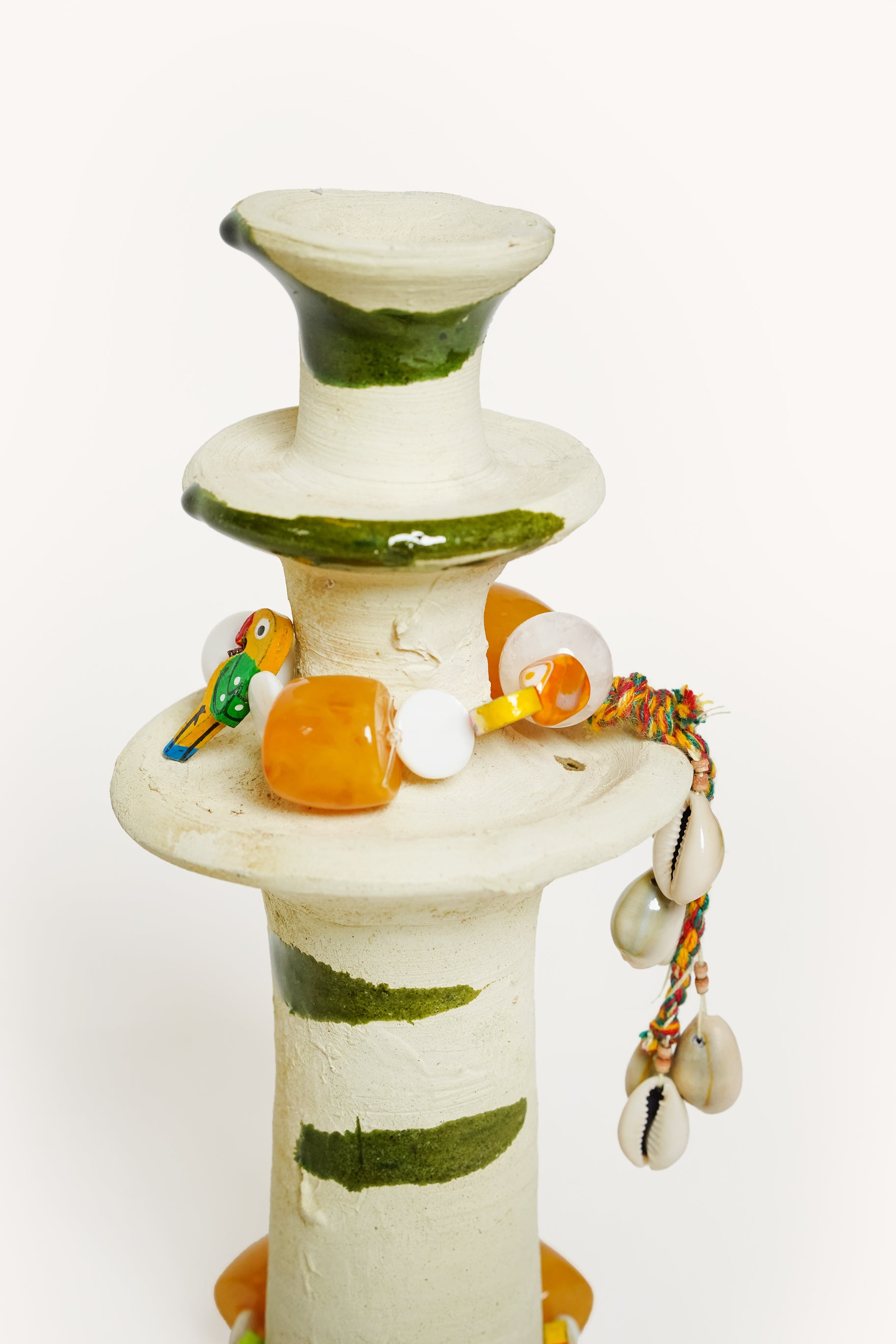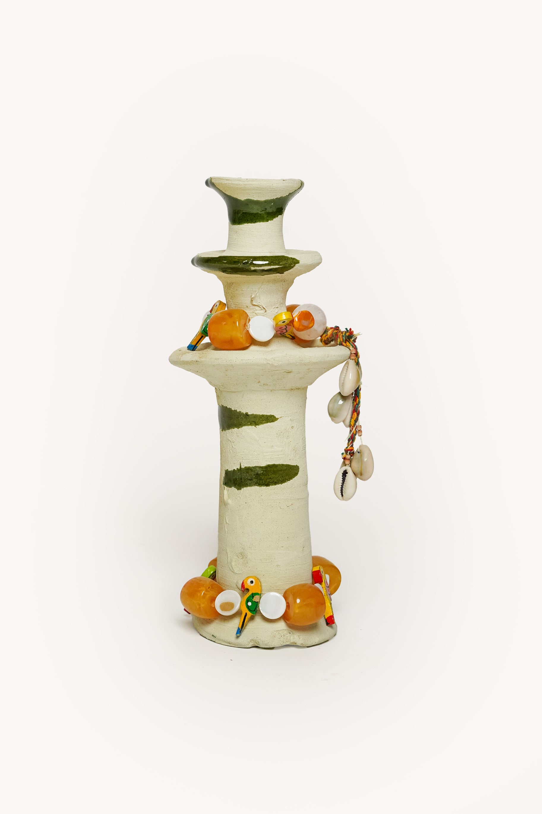 À cette base brute et authentique, Manon vient apporter sa touche personnelle : de délicats bijoux de perles faits main, qu’elle compose avec amour dans son atelier. Ces ornements viennent enlacer le bougeoir, créant une pièce poétique, mêlant terre et lumière, tradition et création.