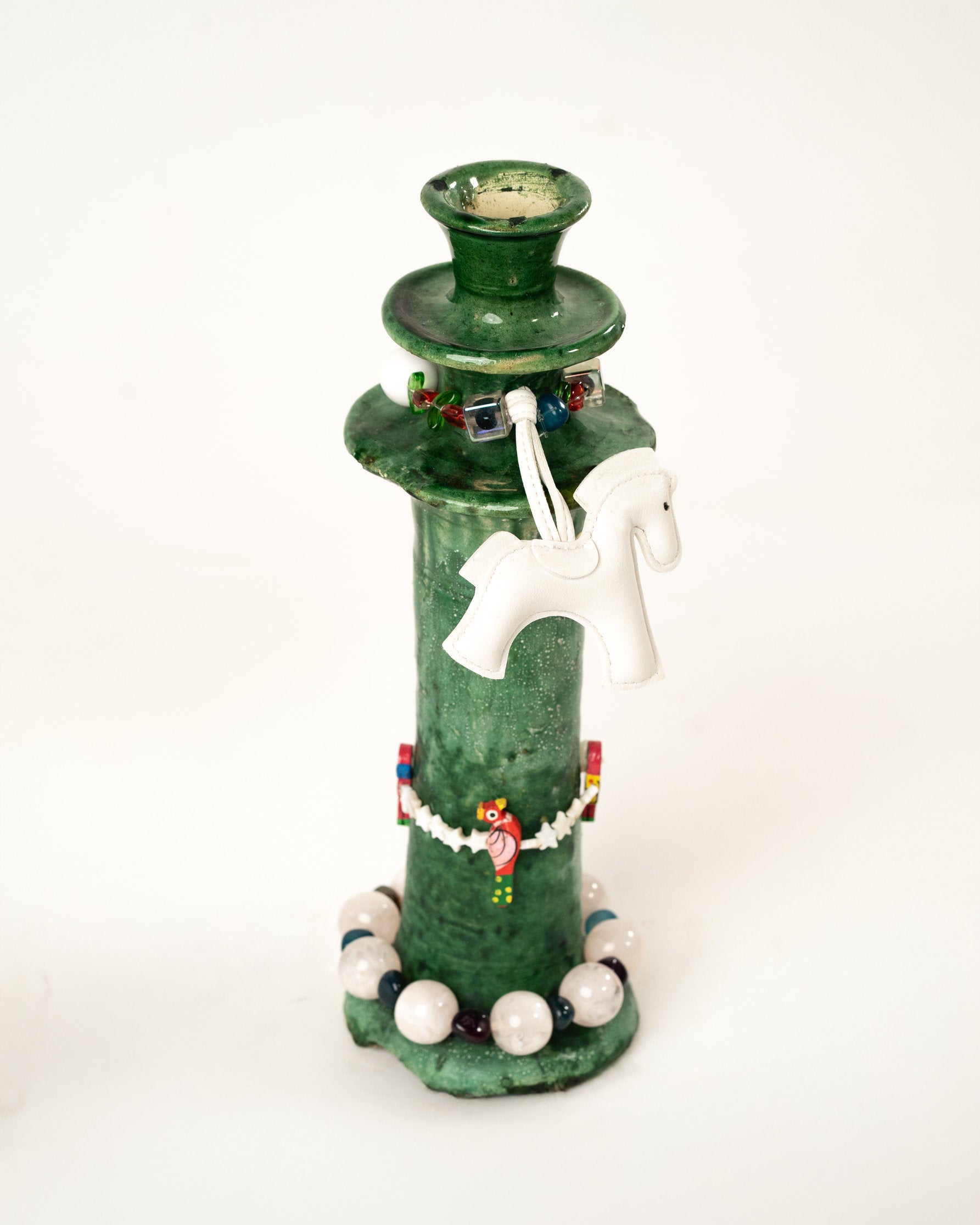 À cette base brute et authentique, Manon vient apporter sa touche personnelle : de délicats bijoux de perles faits main, qu’elle compose avec amour dans son atelier. Ces ornements viennent enlacer le bougeoir, créant une pièce poétique, mêlant terre et lumière, tradition et création.