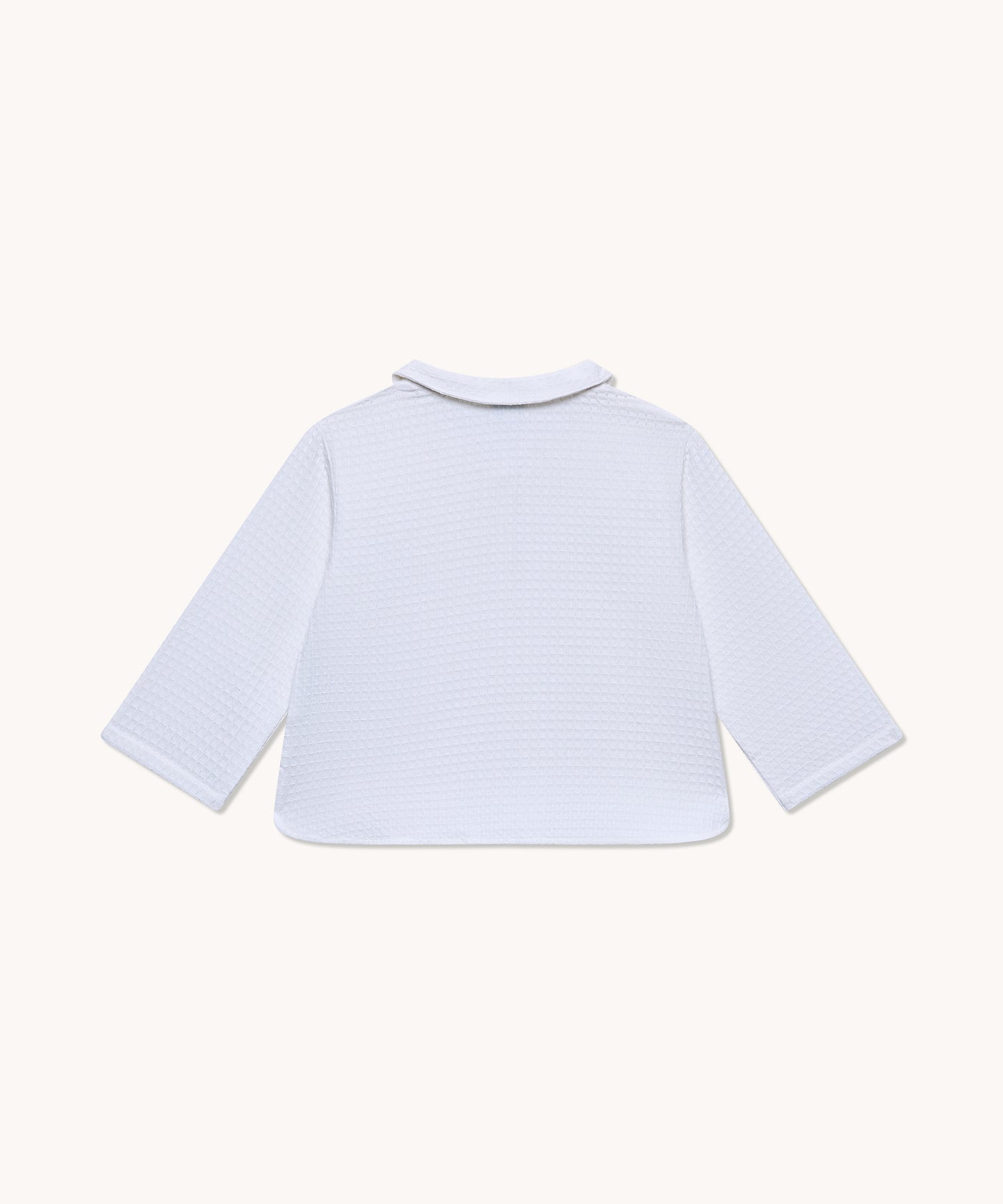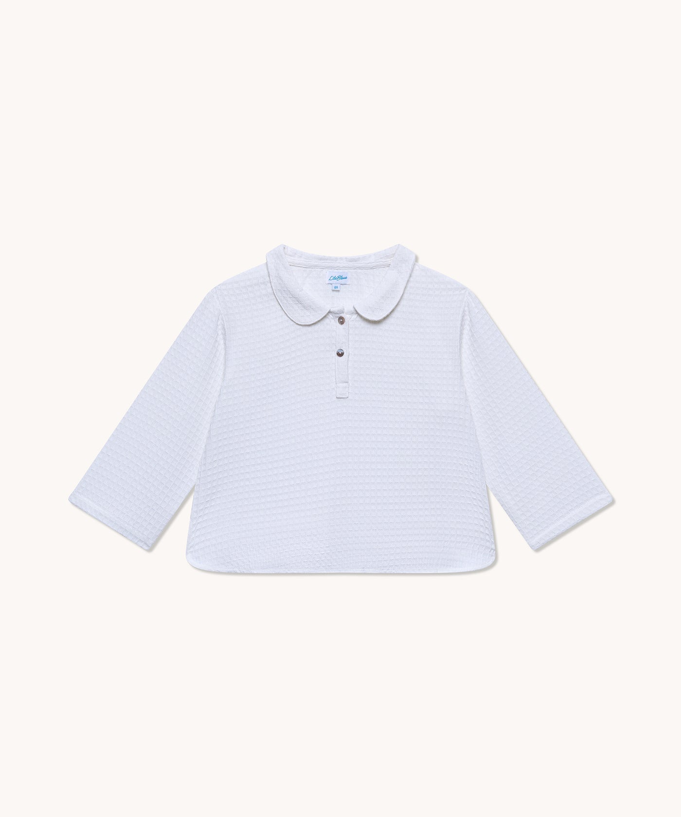 Blouse à manches longues en coton, d'un blanc pur et doux. Elle se ferme par une discrète patte de boutonnage à deux boutons et présente un col Claudine délicat.