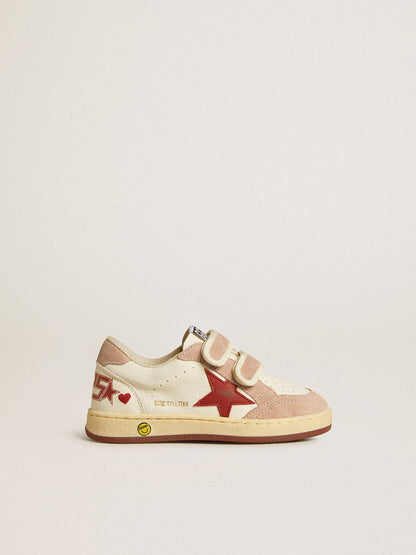 Rêvez des années 1980. Nos sneakers Golden Goose Ball Star font référence à l’esprit des universités américaines, entre un tir au panier et un tour en skateboard. Doté d’une tige en cuir nappa blanc, ce modèle se distingue par une étoile en cuir nappa rouge ainsi que par des empiècements et un contrefort en cuir velours vieux rose. Le smiley en contraste sur la bande de renfort, le cœur rouge brodé sur la tige et la fermeture à scratch en cuir velours vieux rose apportent la touche finale : les belles choses ne se démodent jamais.