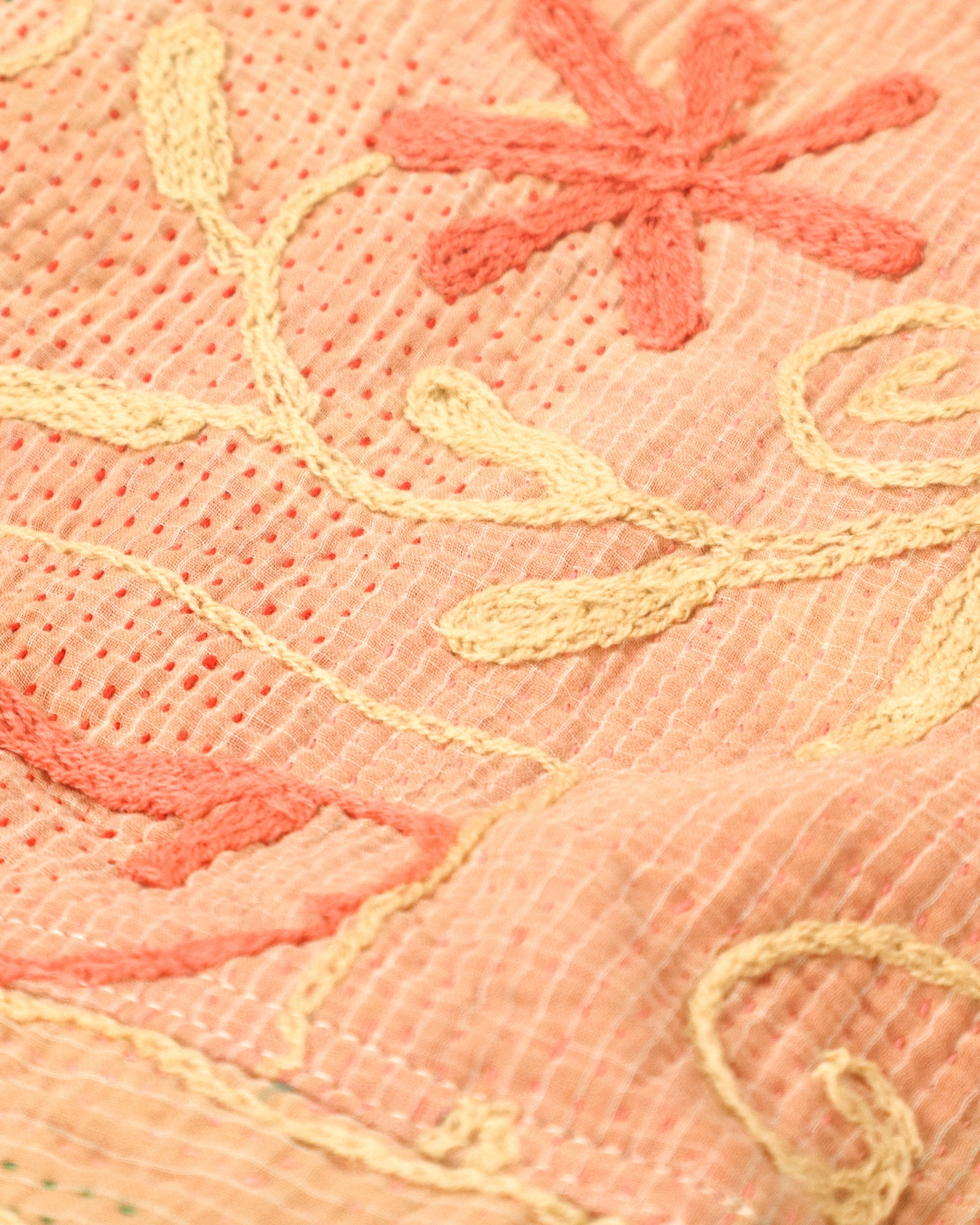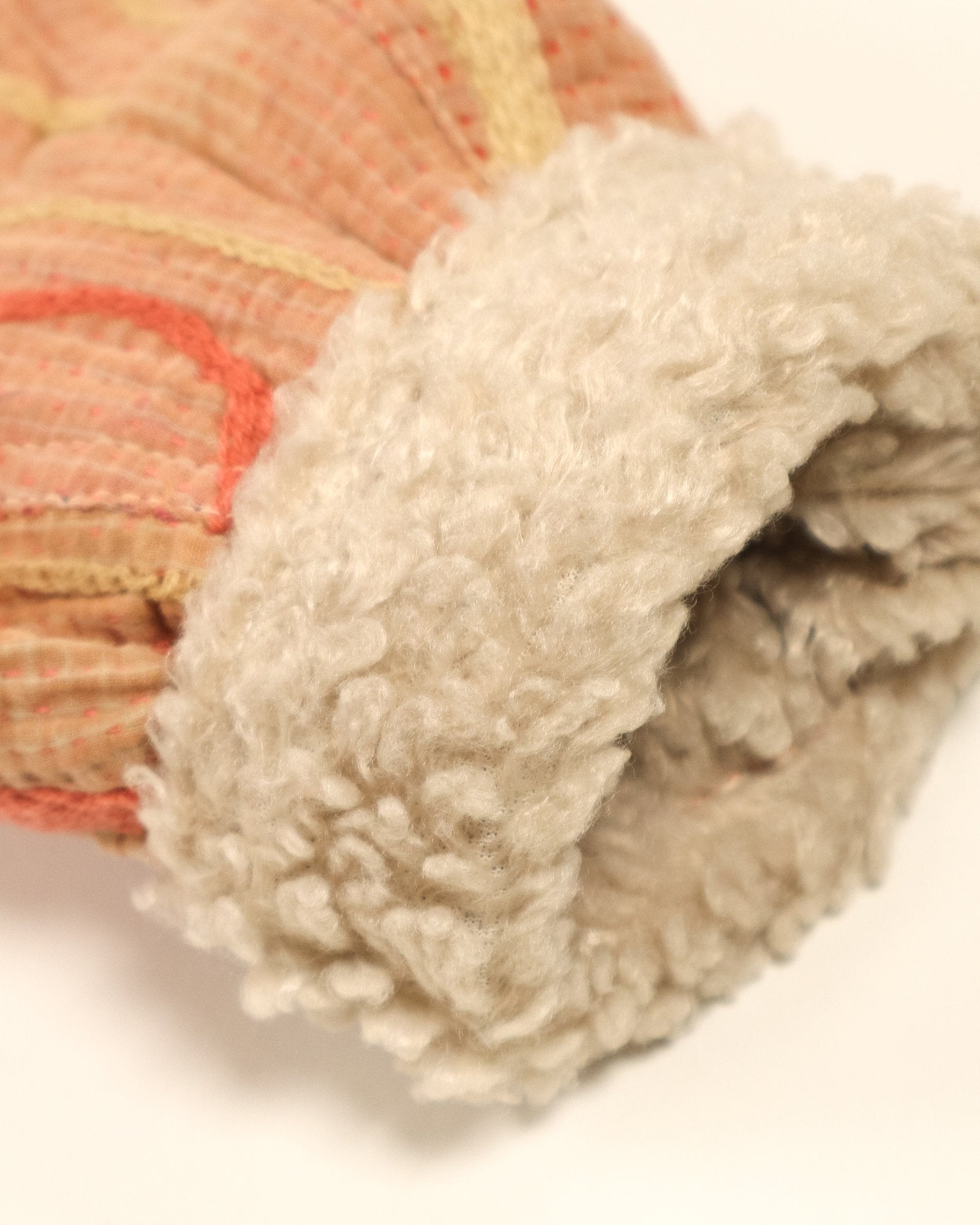 La veste est en 100% coton Kantha avec deux poches latérales, une poche cachée sur la manche gauche, une fermeture à zip et une languette avec bouton pour fermer le bas de la veste.
