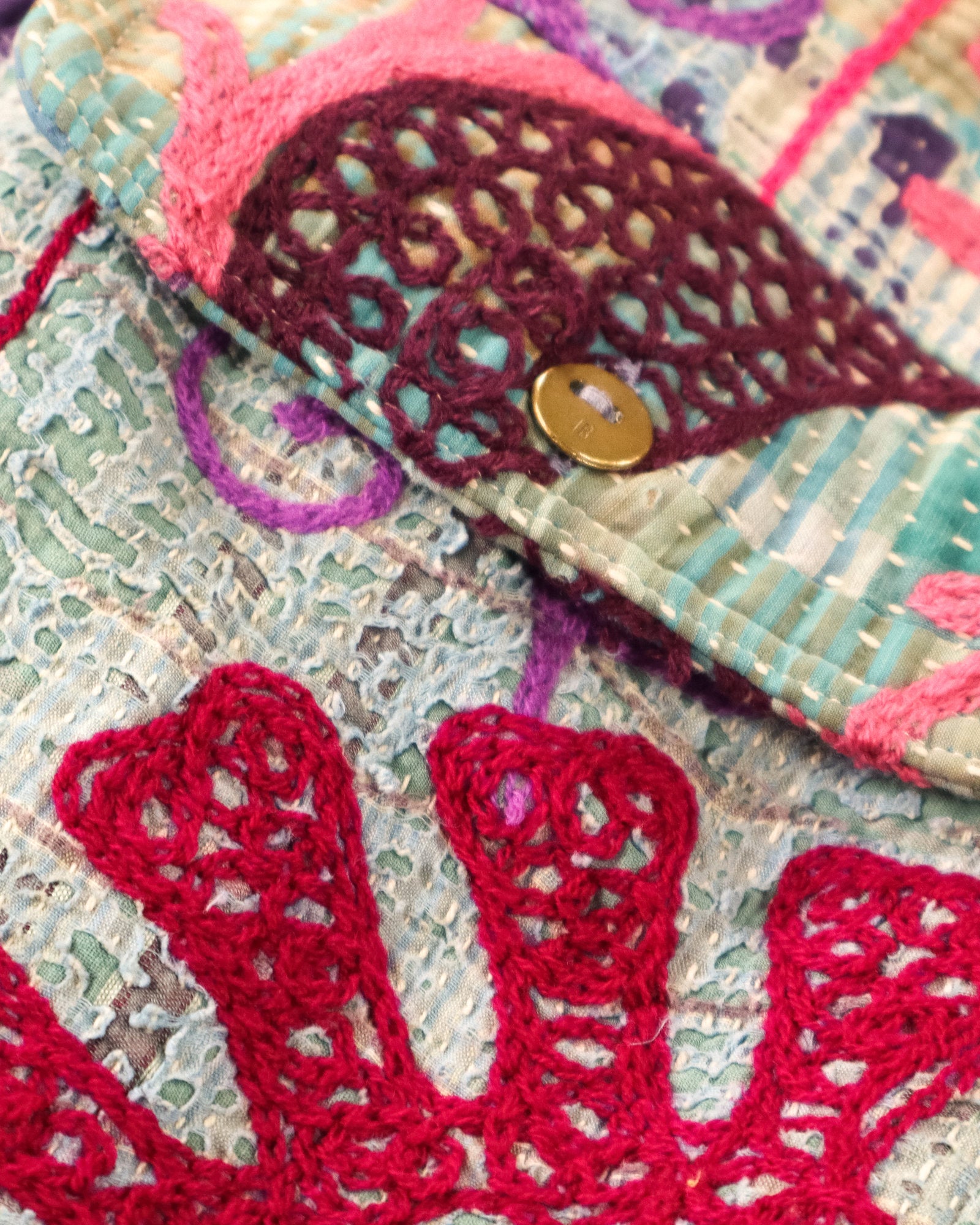 La veste est en 100% coton Kantha avec deux poches latérales, une poche cachée sur la manche gauche, une fermeture à zip et une languette avec bouton pour fermer le bas de la veste.