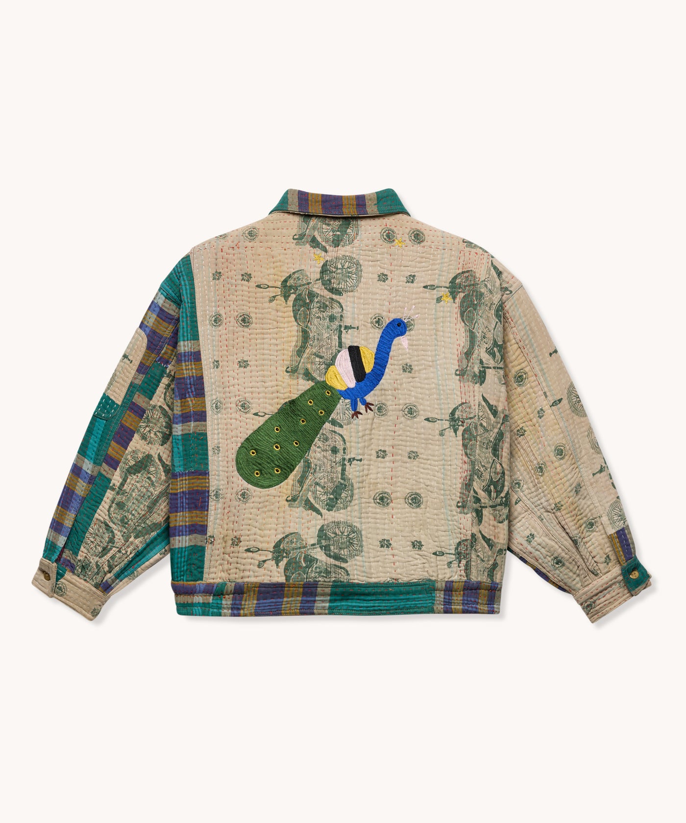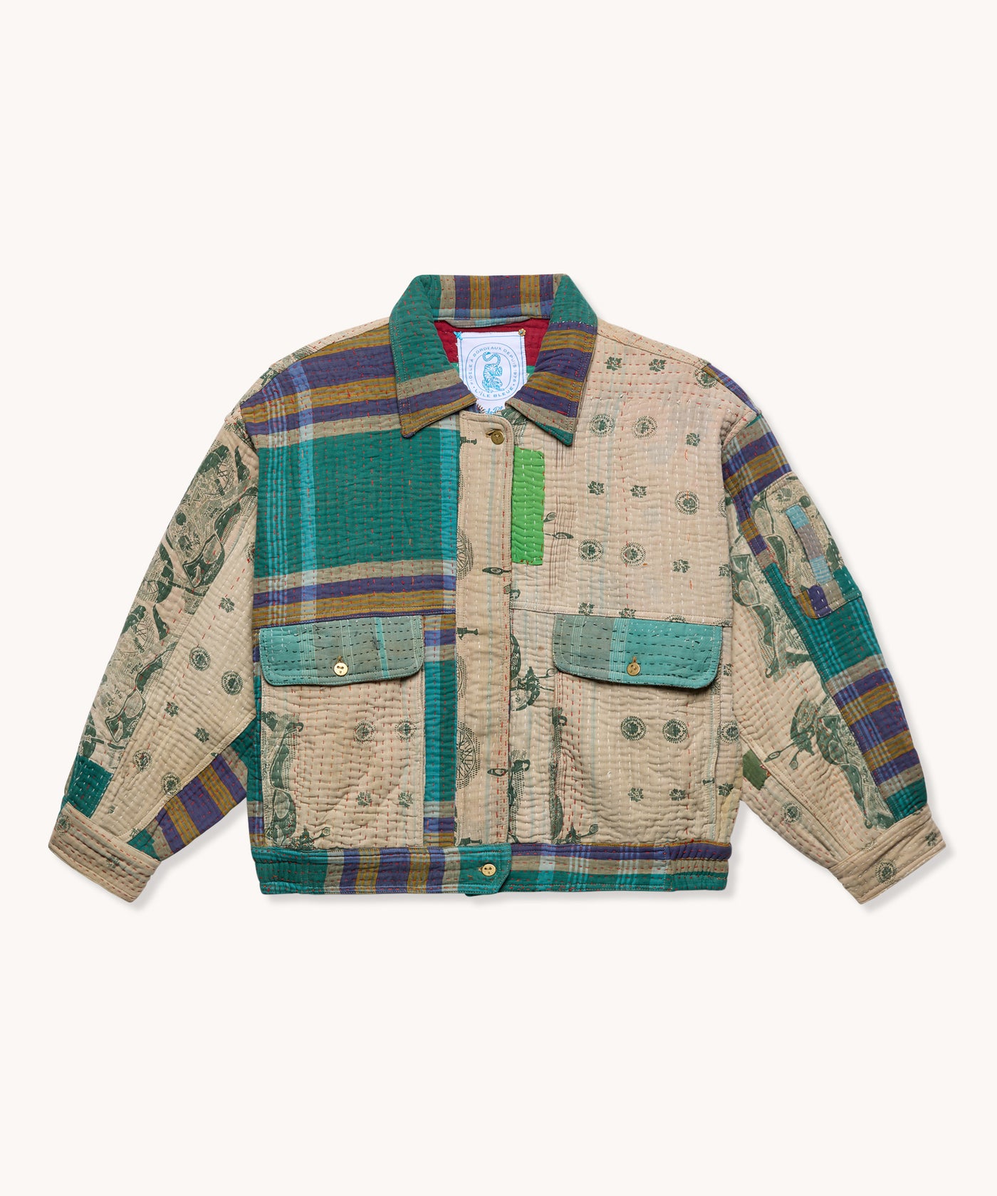 La veste est en 100% coton Kantha avec deux poches latérales, une poche cachée sur la manche gauche, une fermeture à zip et une languette avec bouton pour fermer le bas de la veste.