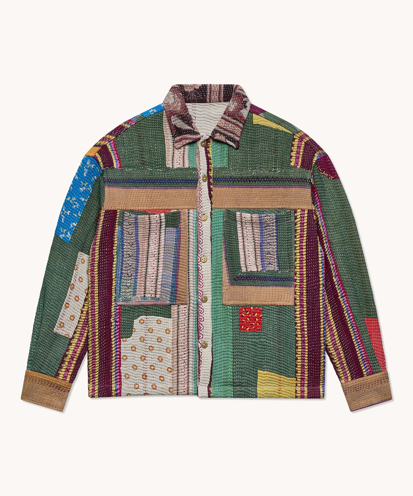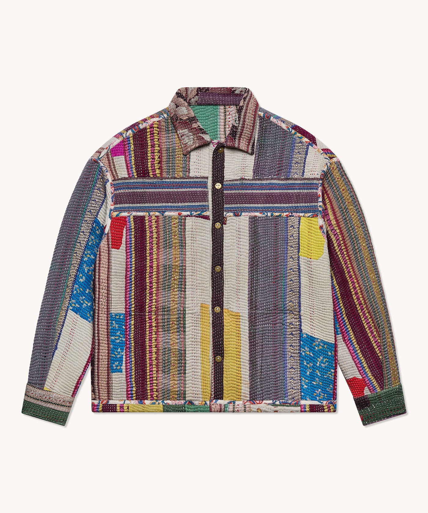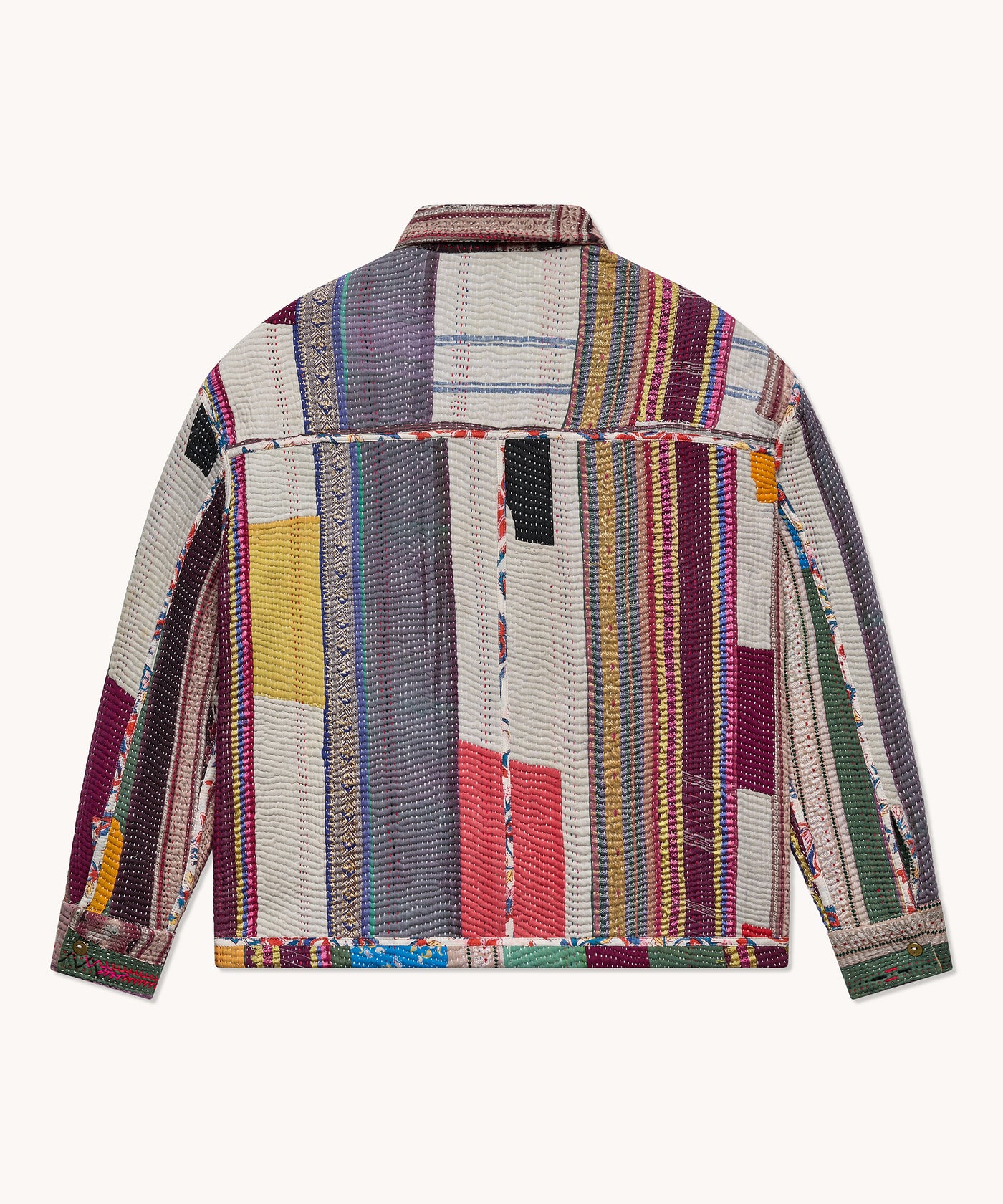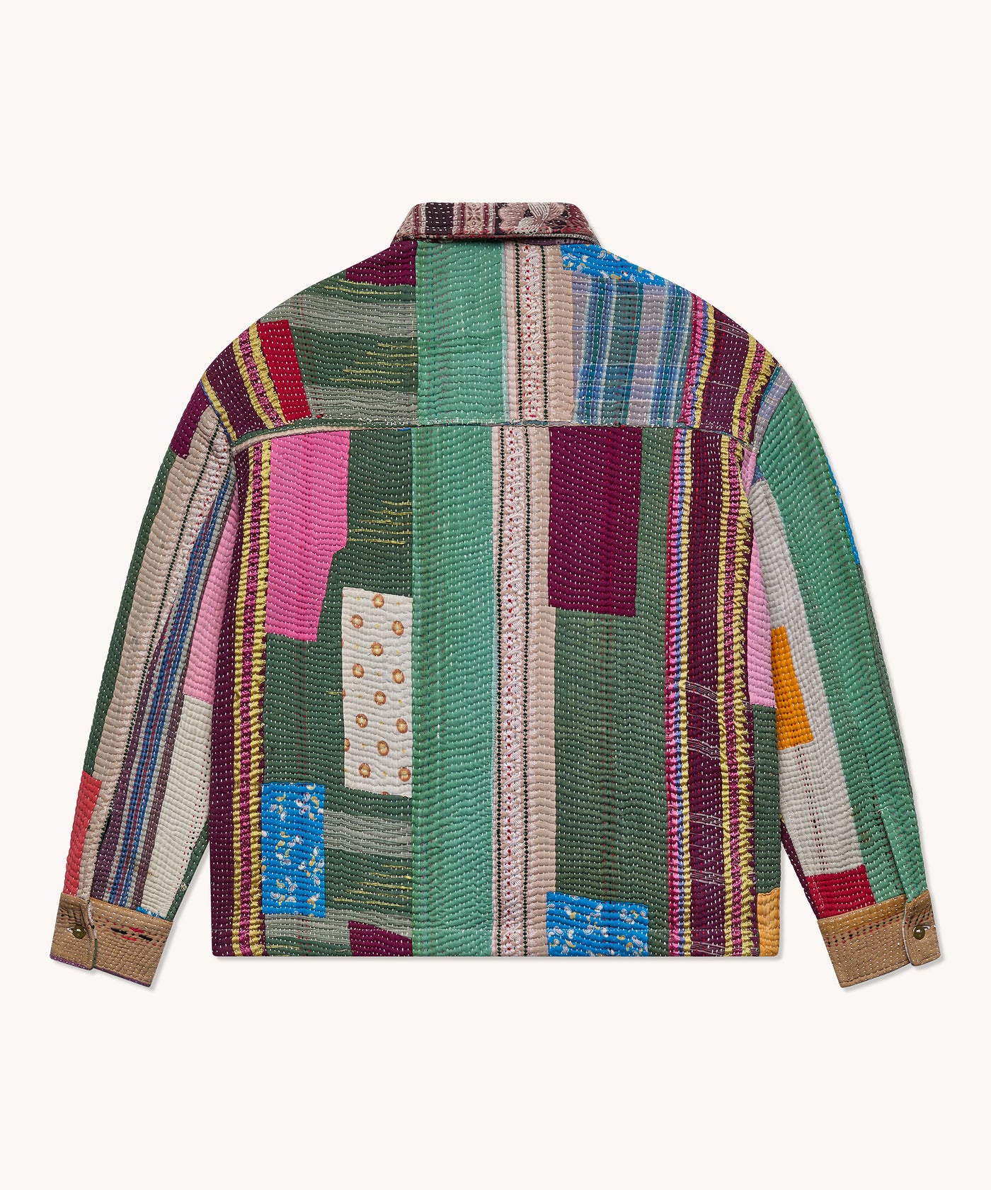 Ce modèle, présenté dans un Kantha relativement fin, est idéal pour les soirées fraîches d'été. Chaque veste est une pièce unique, confectionnée à la main en Inde selon la technique traditionnelle du Kantha. Elle dispose de deux poches plaquées à l'avant et d'une boutonnière avec des boutons en cuivre estampillés IB.