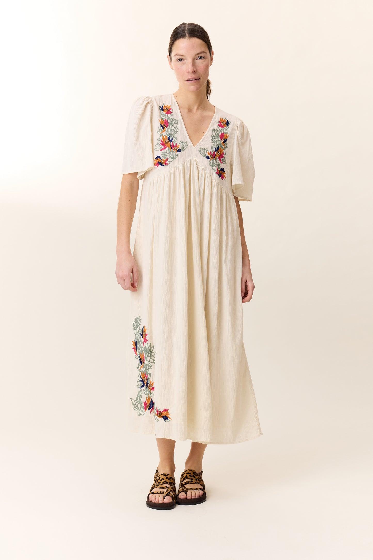 La robe Risu Pearl incarne l'élégance et célèbre la féminité avec subtilité. Sa coupe évasée et ses fronces apportent une touche de légèreté et un confort absolu, tandis que son col en V et ses délicates broderies florales subliment la silhouette de la femme Leon & Harper avec raffinement.