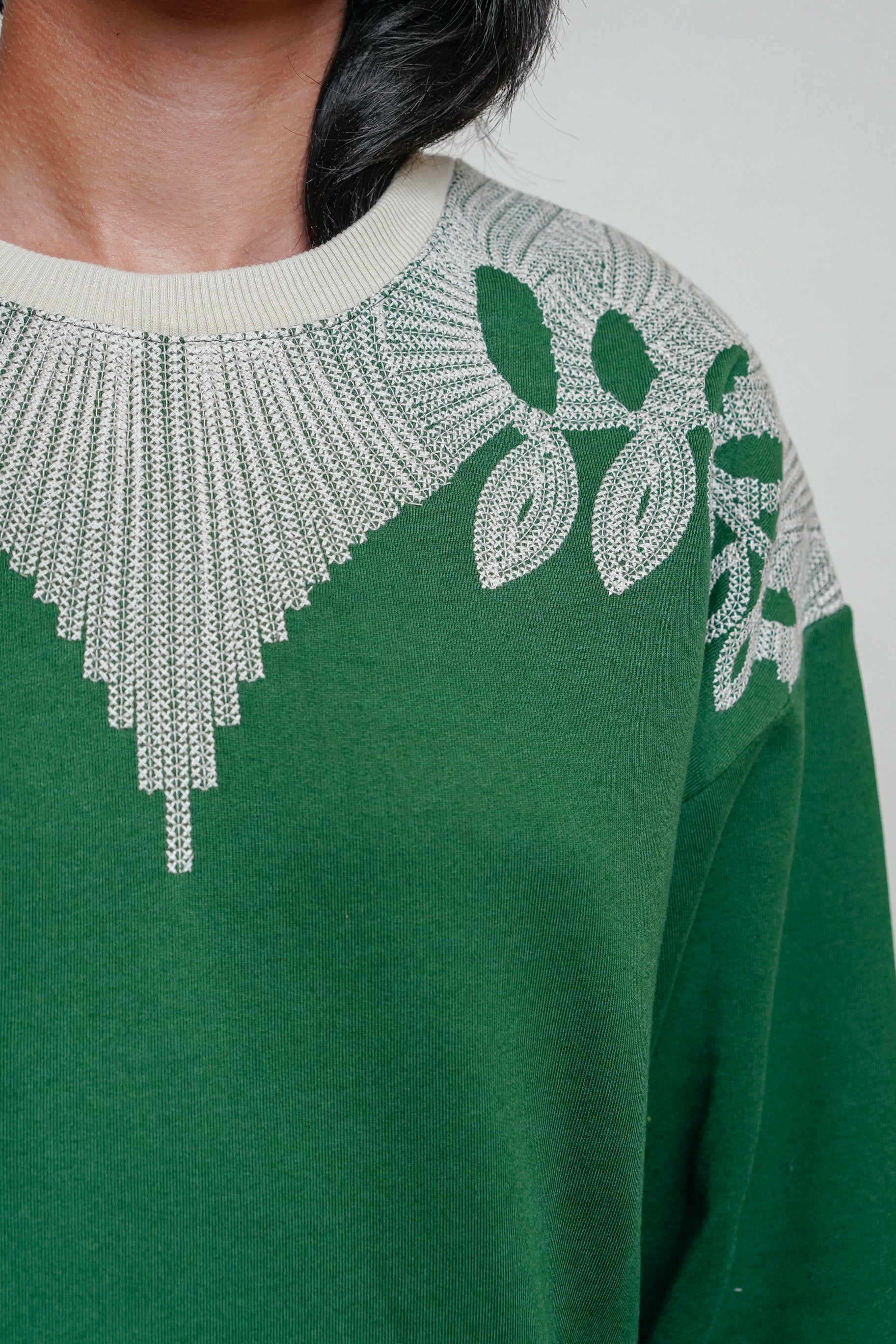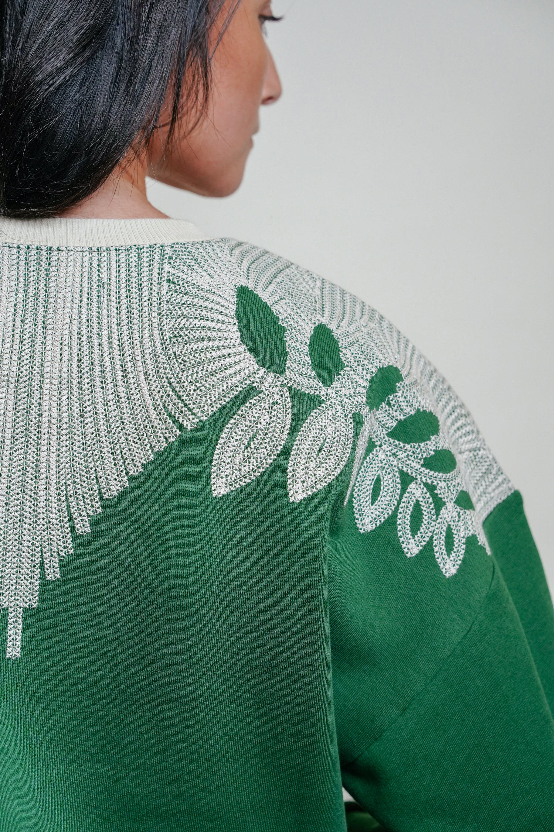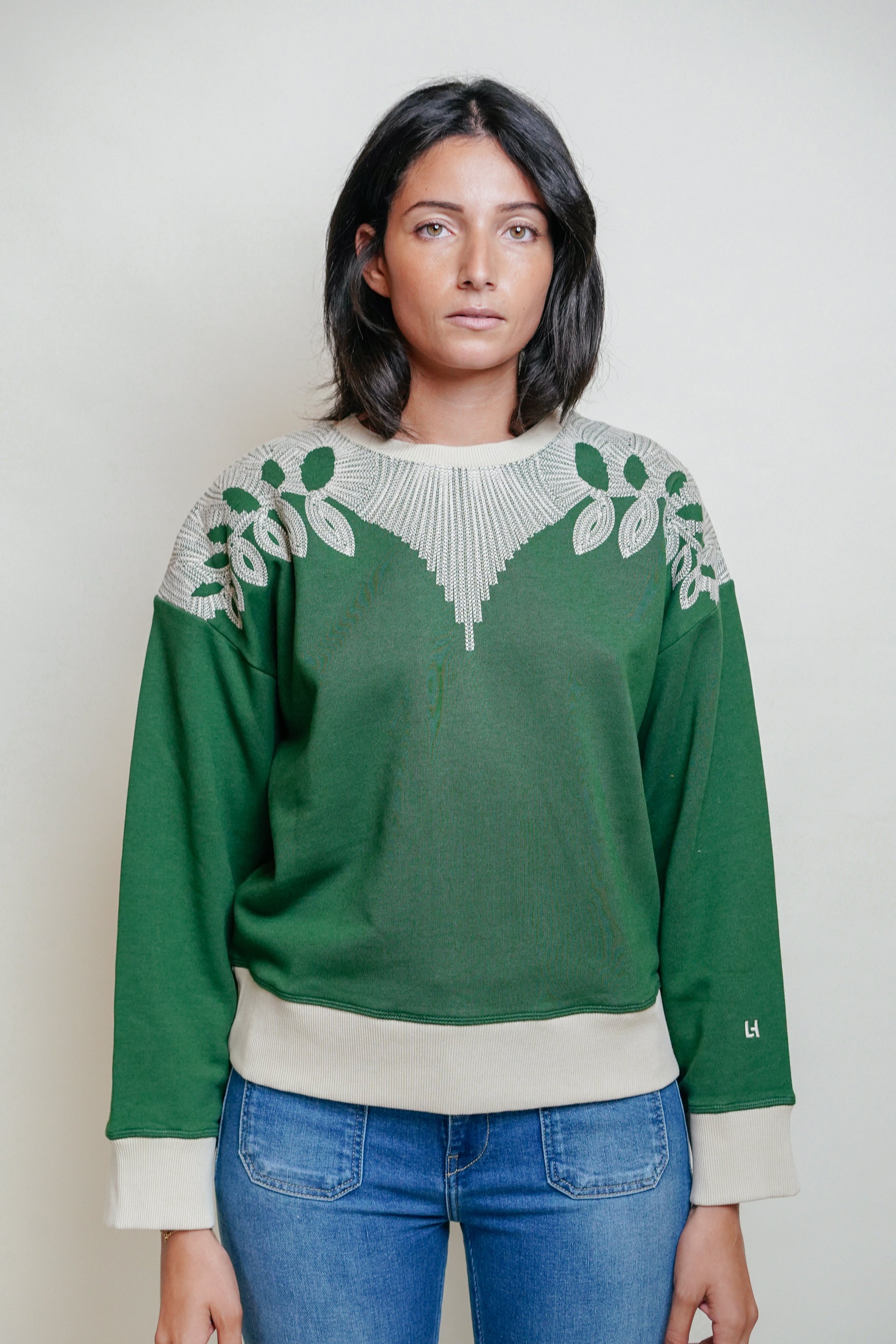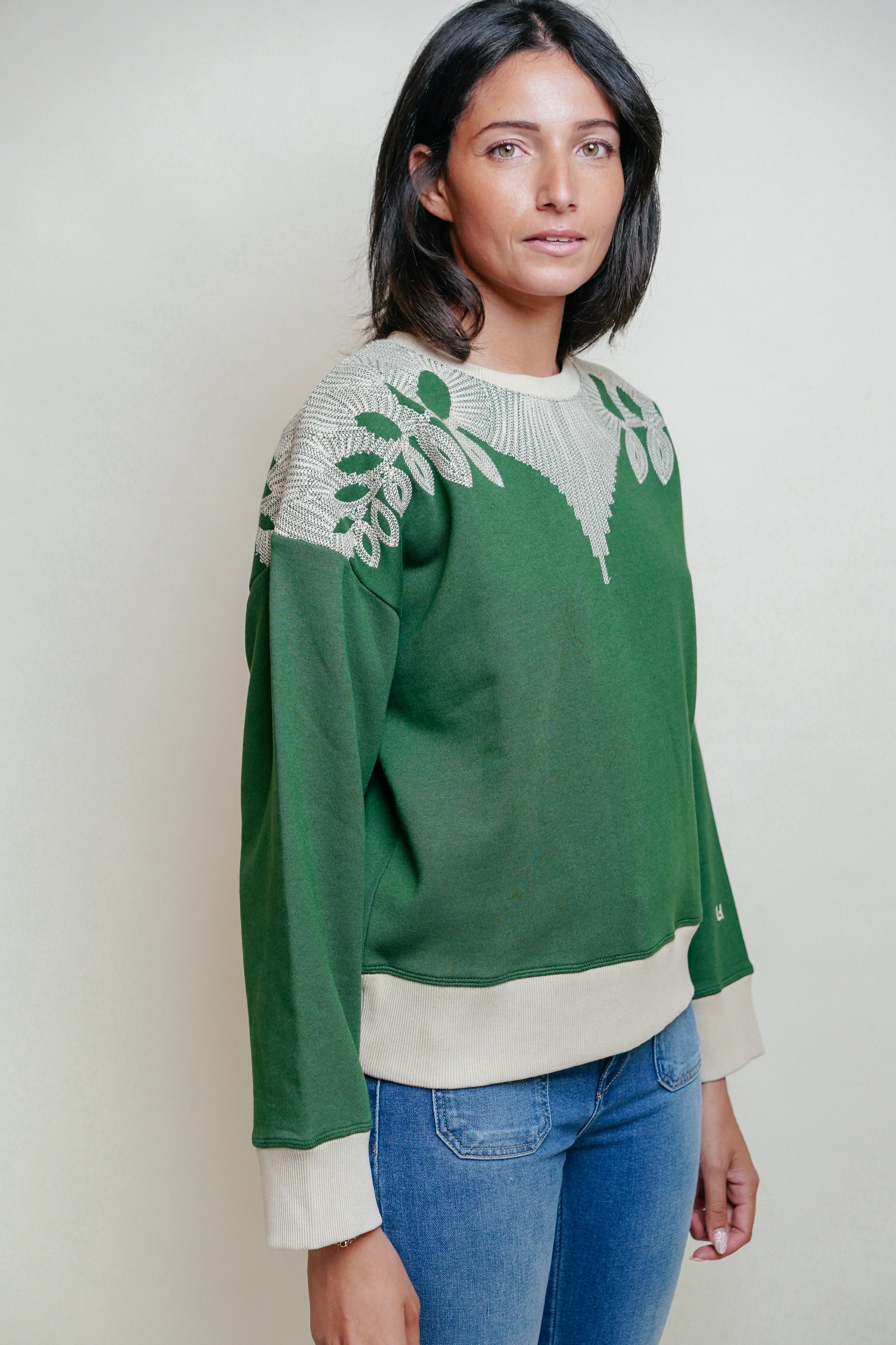 Le sweat-shirt Sienna Leaf s’impose comme une pièce phare avec ses broderies brodé aux épaules, affirmant une philosophie élégante et authentique de la femme Leon & Harper.