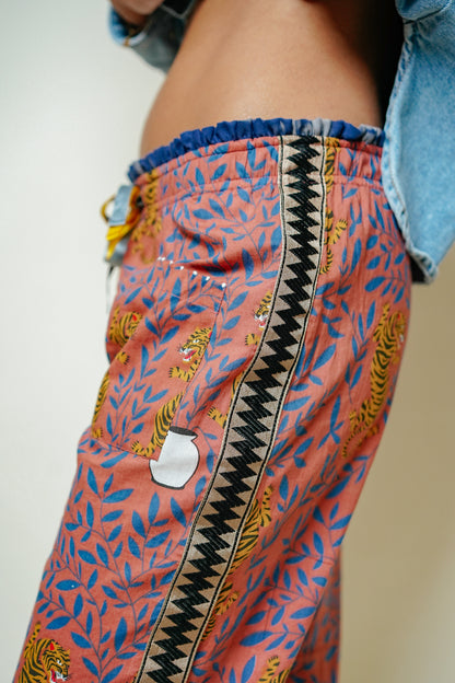 Le prénom "Rajah" est délicatement brodé au fil doré sur le devant droit du vêtement, signature discrète et précieuse. Deux poches plaquées ajoutent une dimension pratique et décontractée à cette pièce déjà exceptionnelle. Enfin, les cordons de serrage en satin de soie permettent d’ajuster la coupe à la taille pour un confort sur-mesure.
