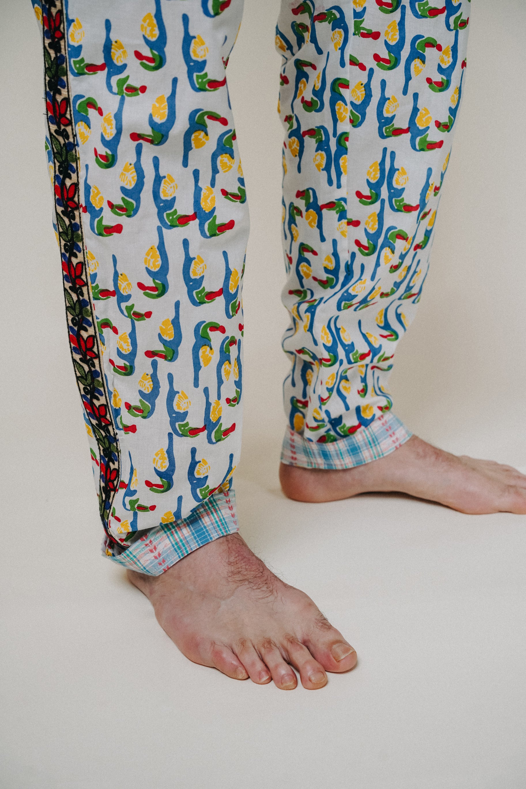 • Détail du revers en bas de jambe surpiqué dans un tissu différent