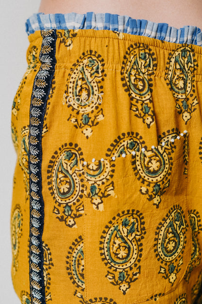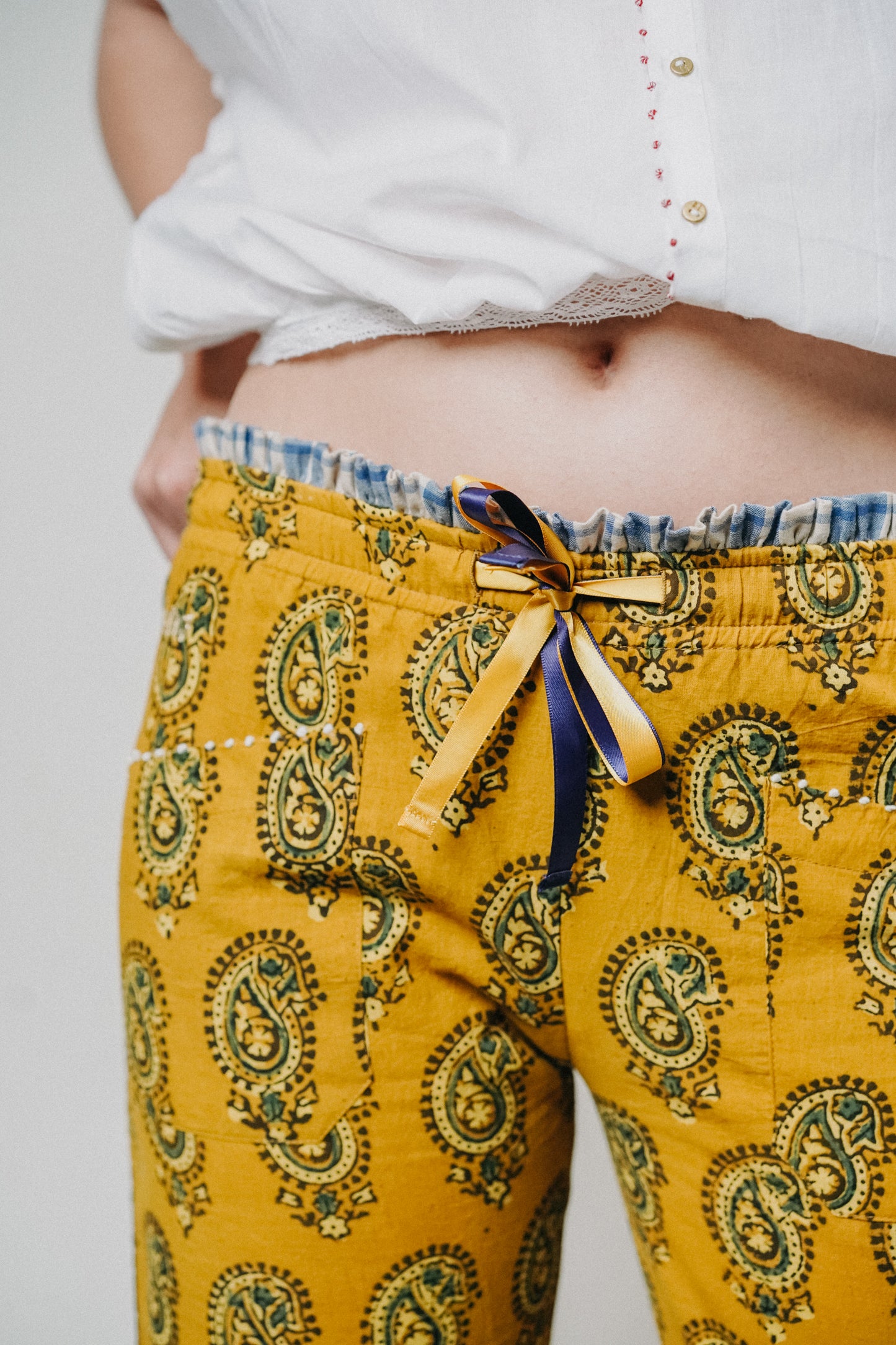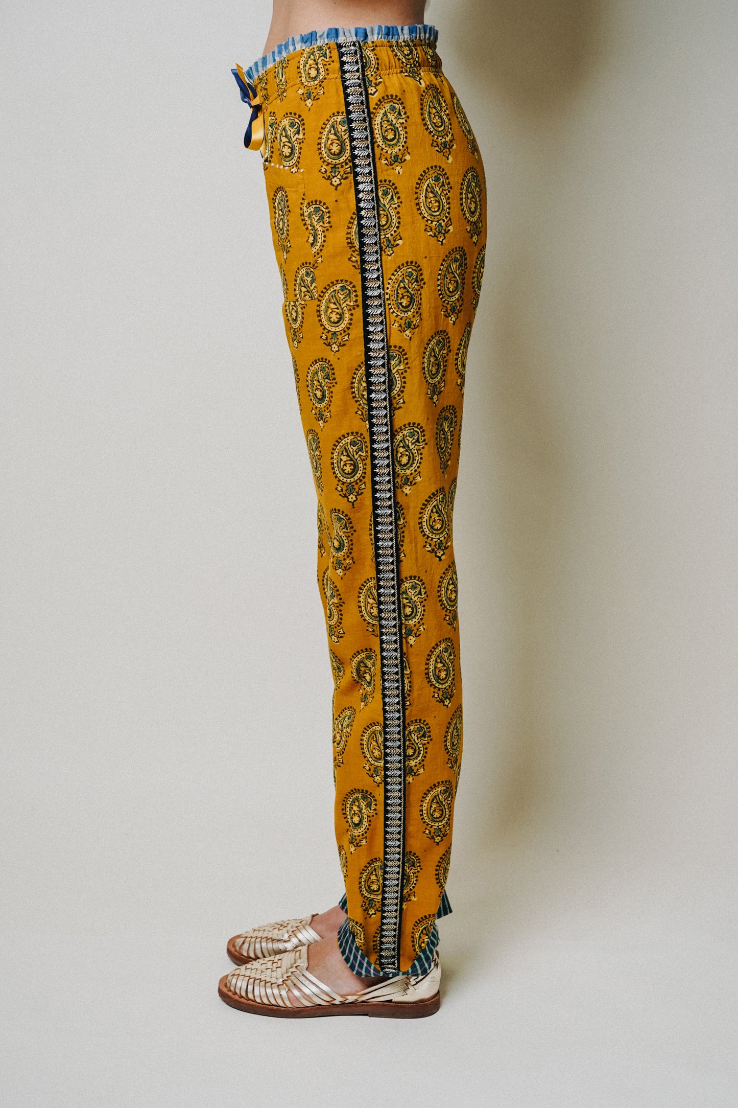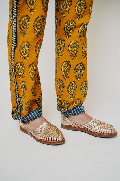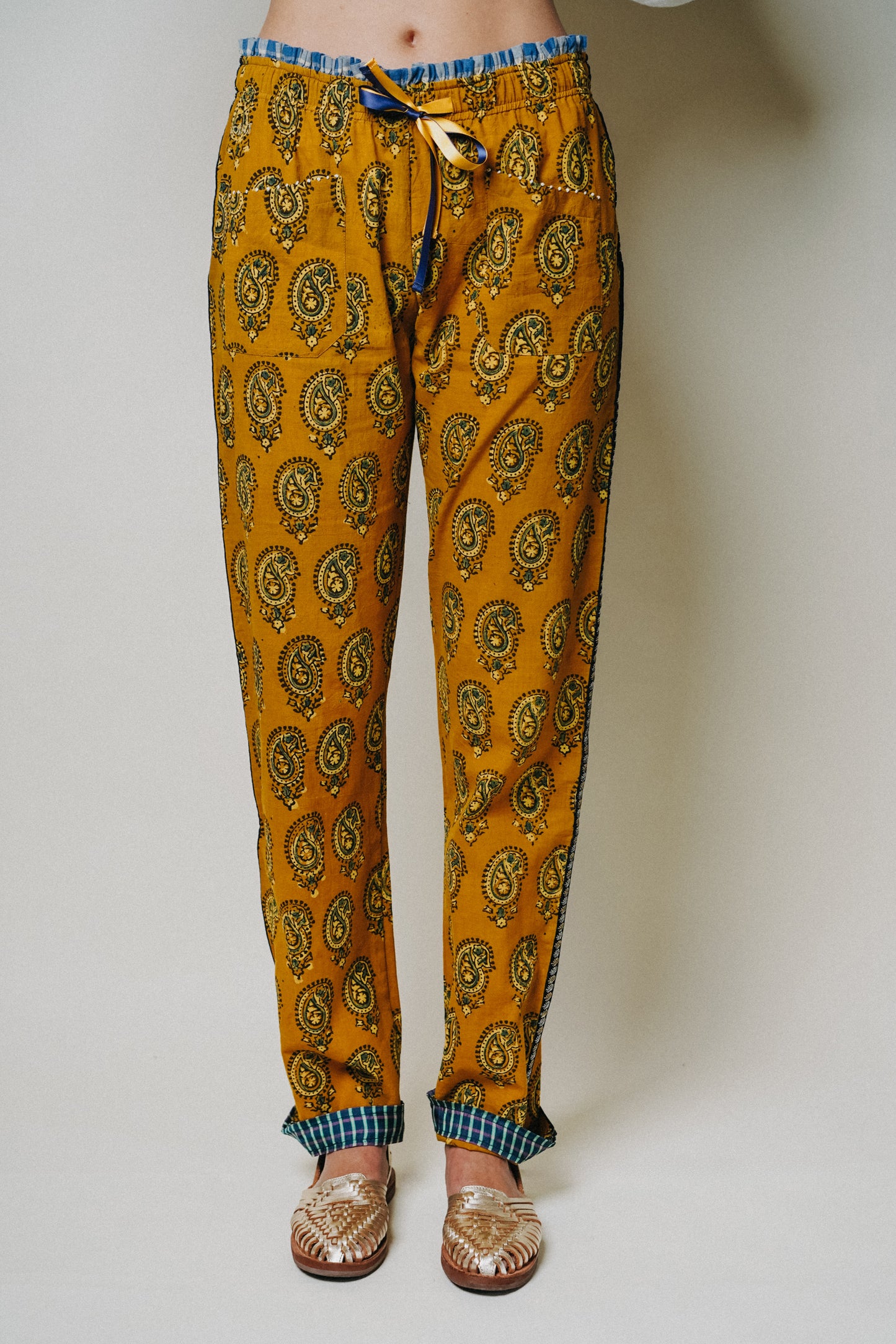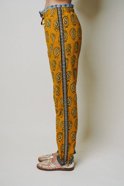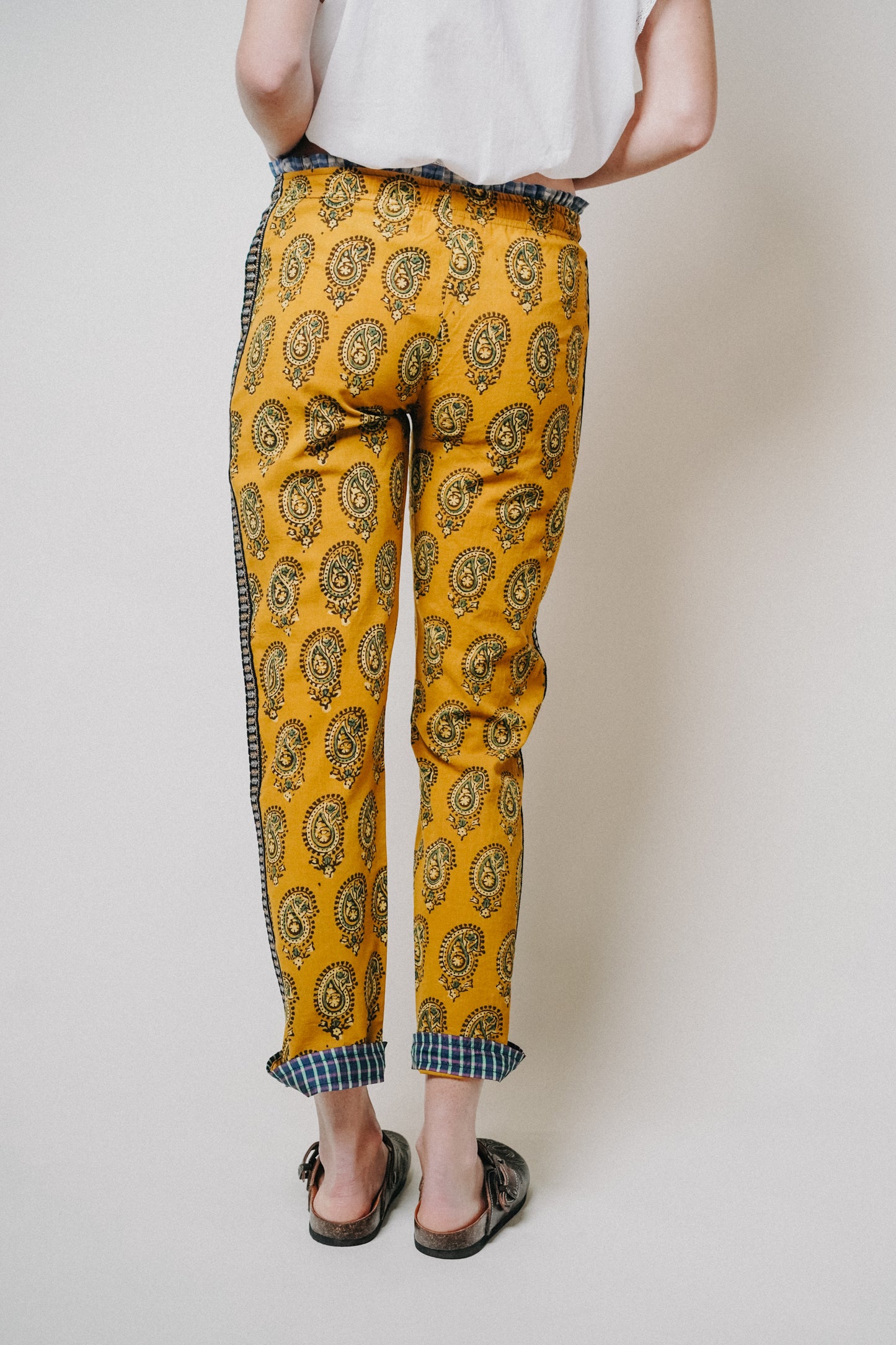 Le long des coutures latérales, un galon ornemental vient souligner la ligne de jambe et apporter une finition soignée. Le revers du bas de jambe révèle un tissu contrasté à carreaux, clin d’œil subtil aux mélanges de cultures chers à la marque.