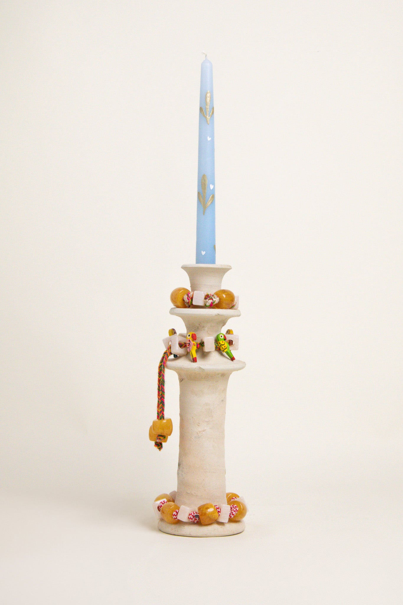 Douceur et artisanat se rencontrent dans ce bougeoir en céramique blanche, façonné à la main au Maroc, puis délicatement orné de bijoux en perles réalisés par Manon, fondatrice de la marque L’Île Bleue.