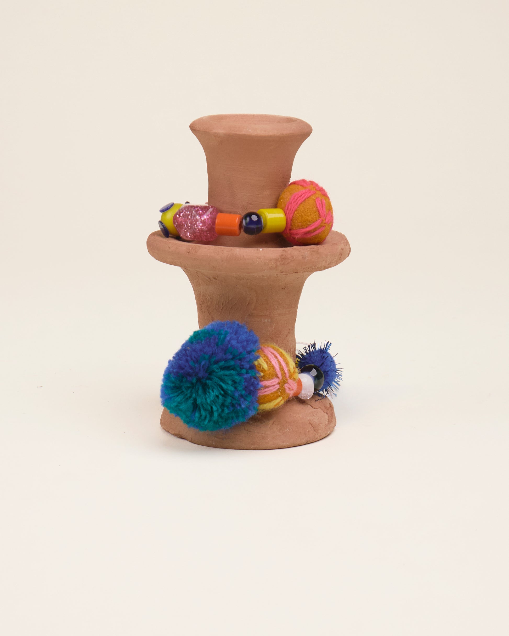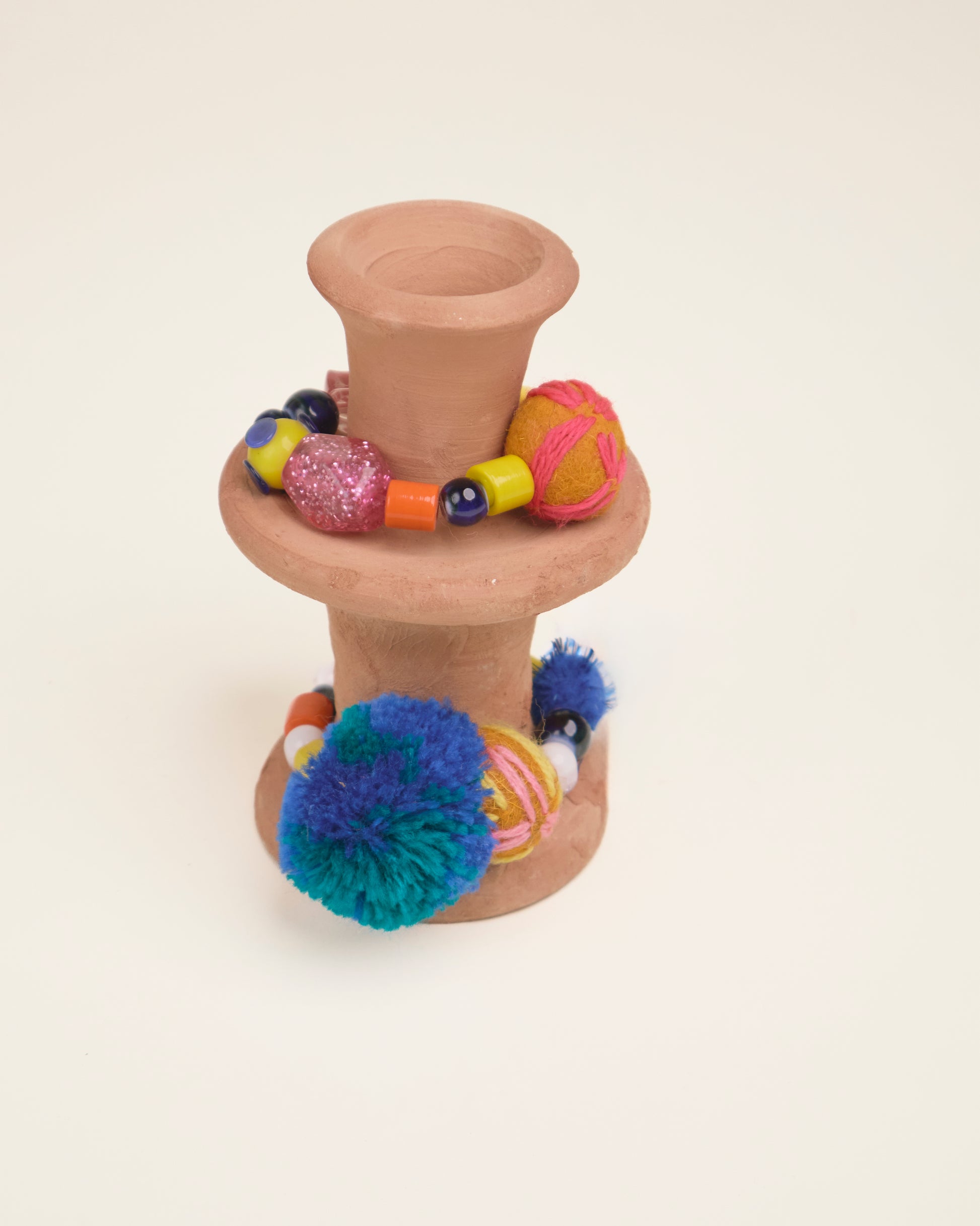 Ce bougeoir unique est façonné à la main au Maroc en terre cuite brute, offrant une texture naturelle et chaleureuse qui rappelle l’artisanat traditionnel. Il est sublimé par deux bracelets de perles faits main, créés et ajoutés par Manon, la créatrice.