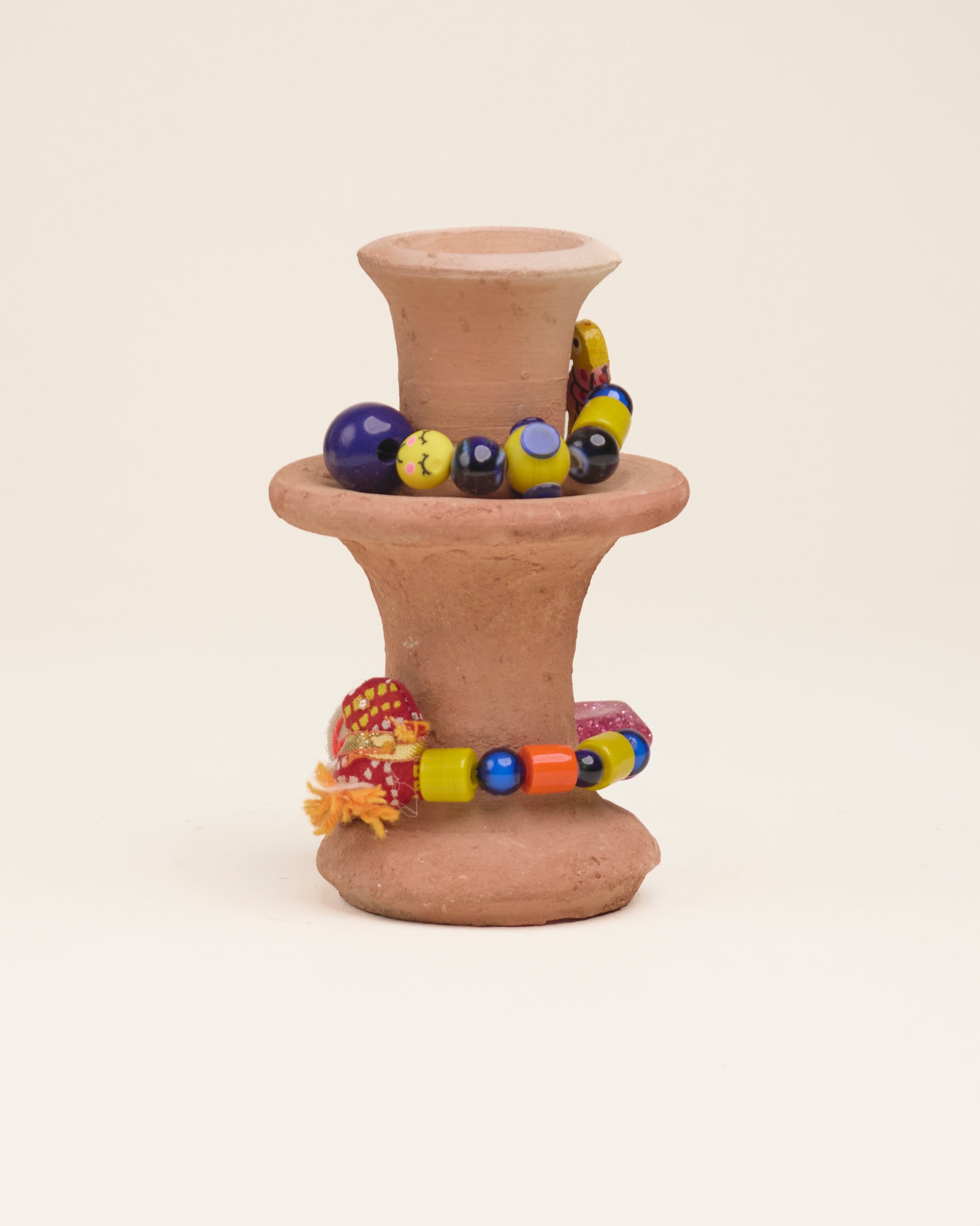 Ce bougeoir unique est façonné à la main au Maroc en terre cuite brute, offrant une texture naturelle et chaleureuse qui rappelle l’artisanat traditionnel. Il est sublimé par deux bracelets de perles faits main, créés et ajoutés par Manon, la créatrice.