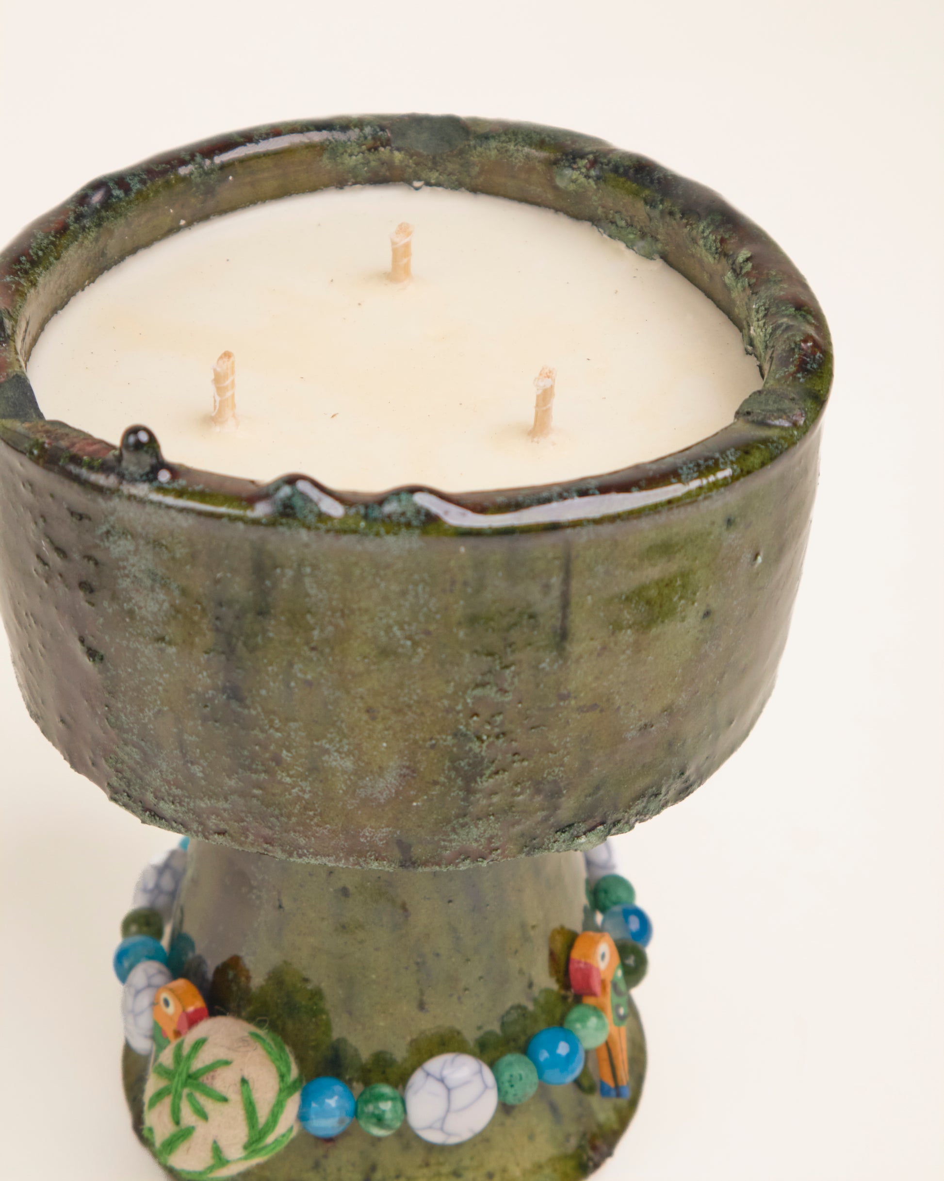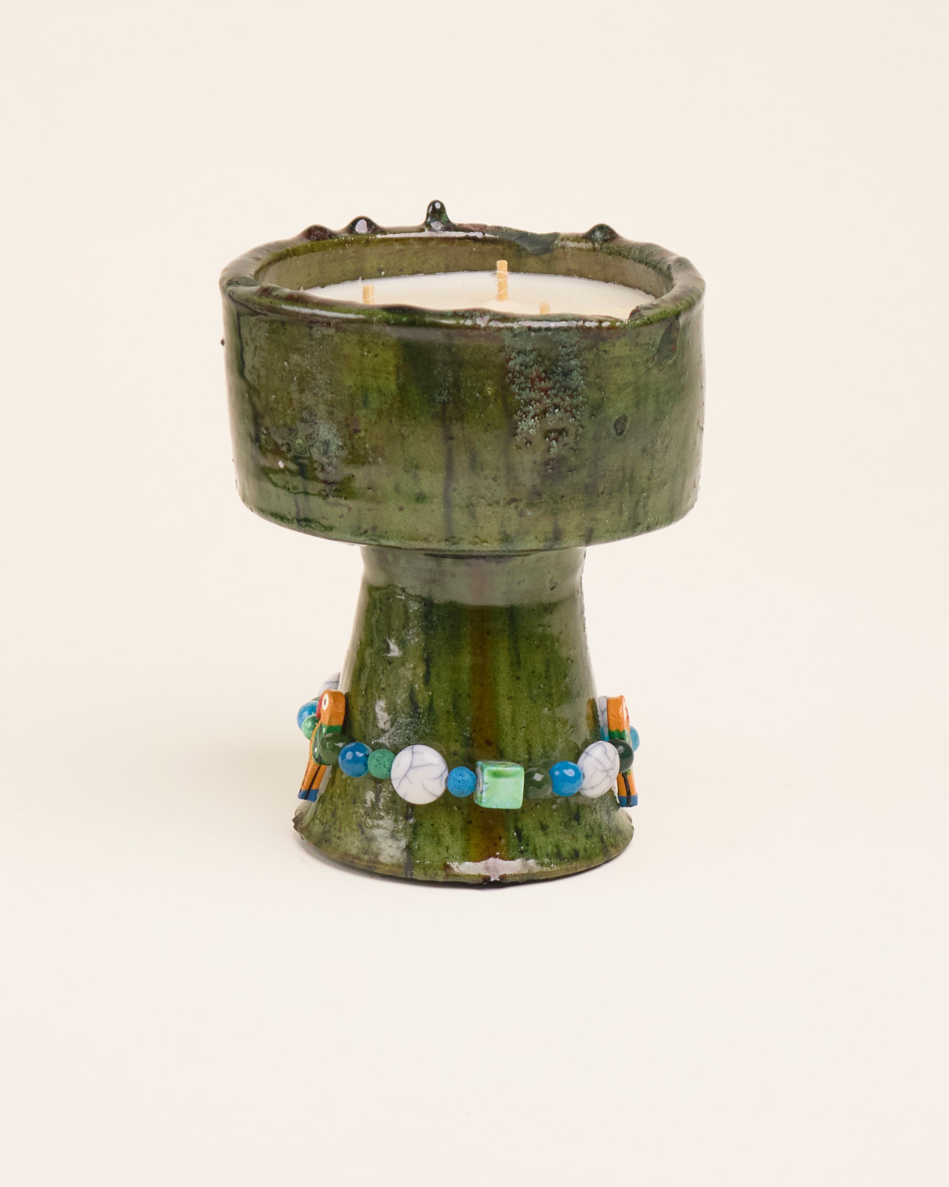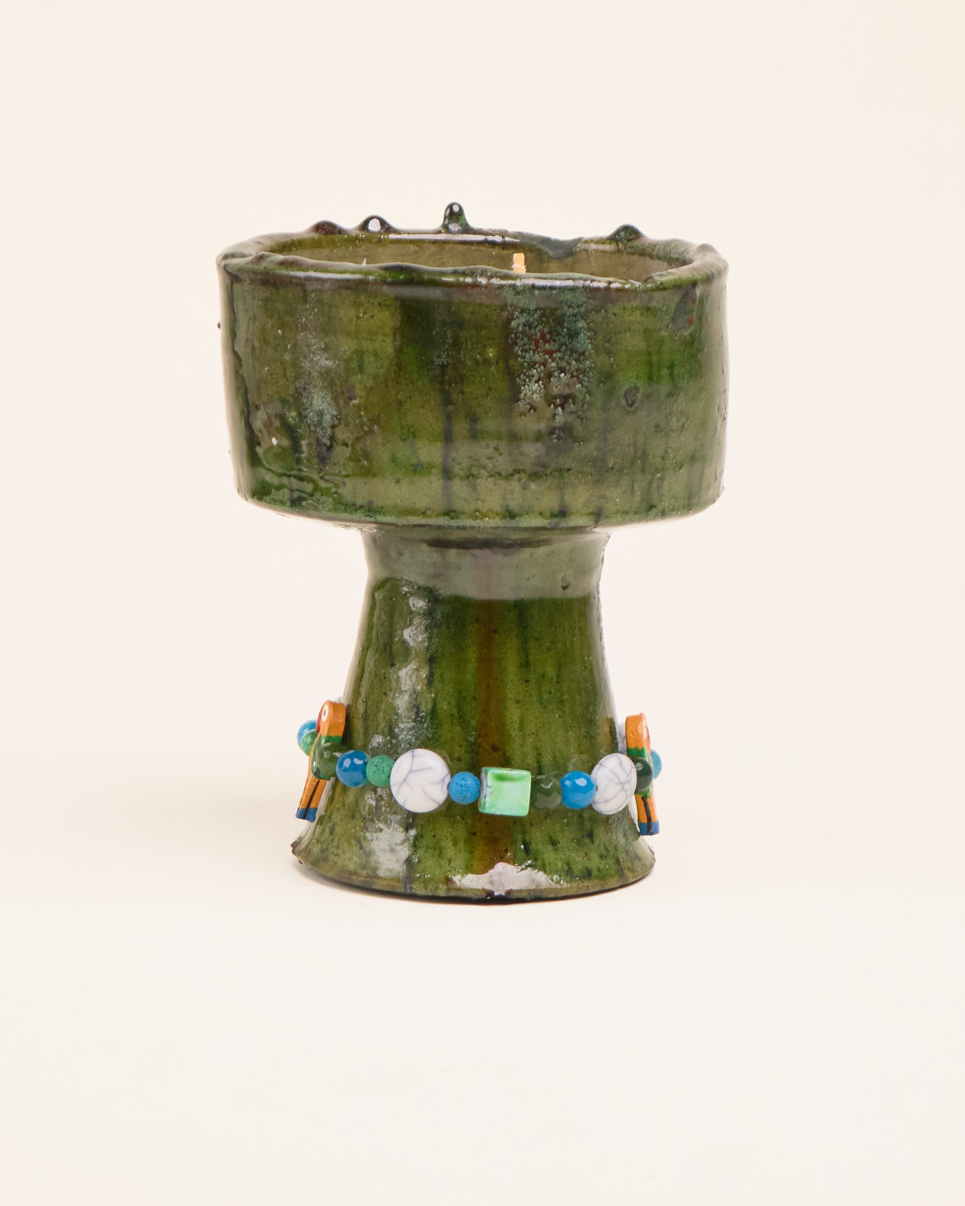 À cette base brute et authentique, Manon vient apporter sa touche personnelle : de délicats bijoux de perles faits main, qu’elle compose avec amour dans son atelier. Ces ornements viennent enlacer la bougie, créant une pièce poétique, mêlant terre et lumière, tradition et création.